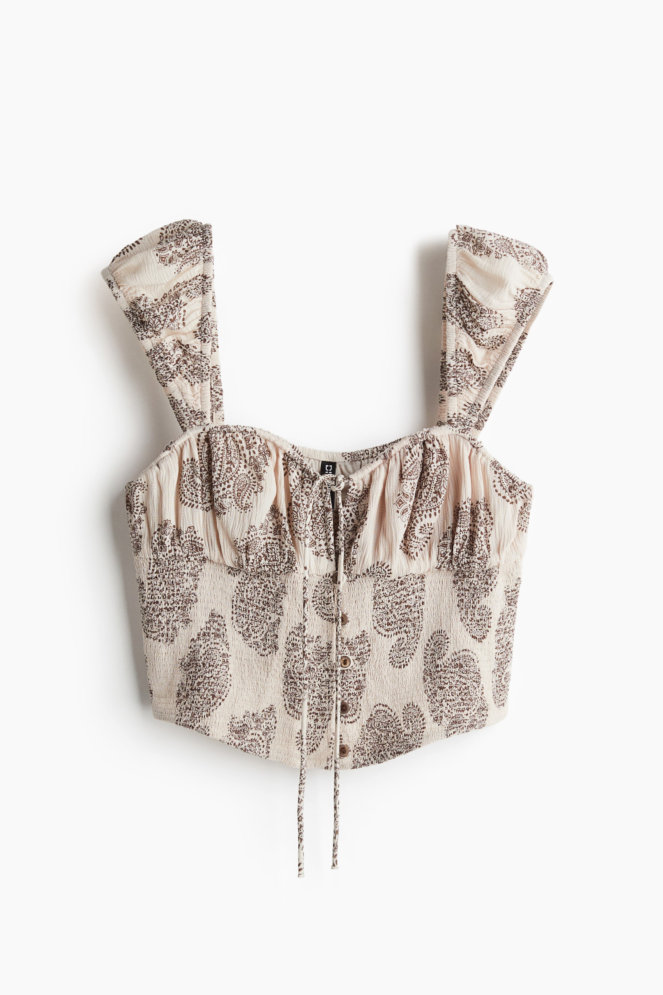 Short, fitted corset-style top in woven, crinkled viscose fabric. Wide shoulder straps, sweetheart neckline with a slit and narrow ties at front, and buttons at front. Smocked section at waist. Gathers at shoulder straps and below bust for a ruched effect. Rounded hem at front. Partly lined.