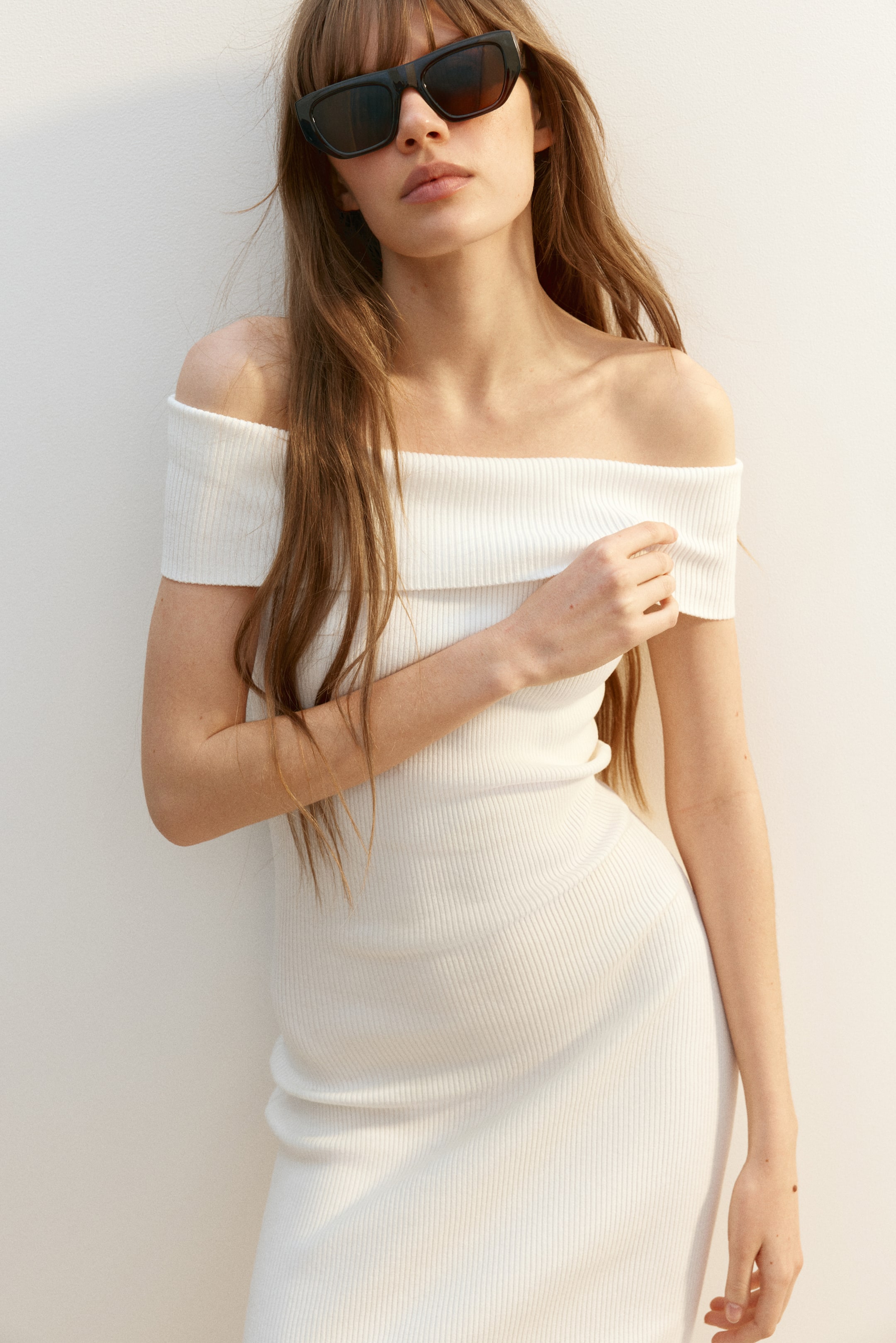 Fitted, off-the-shoulder, calf-length dress in ribbed jersey with a wide, foldover upper edge.