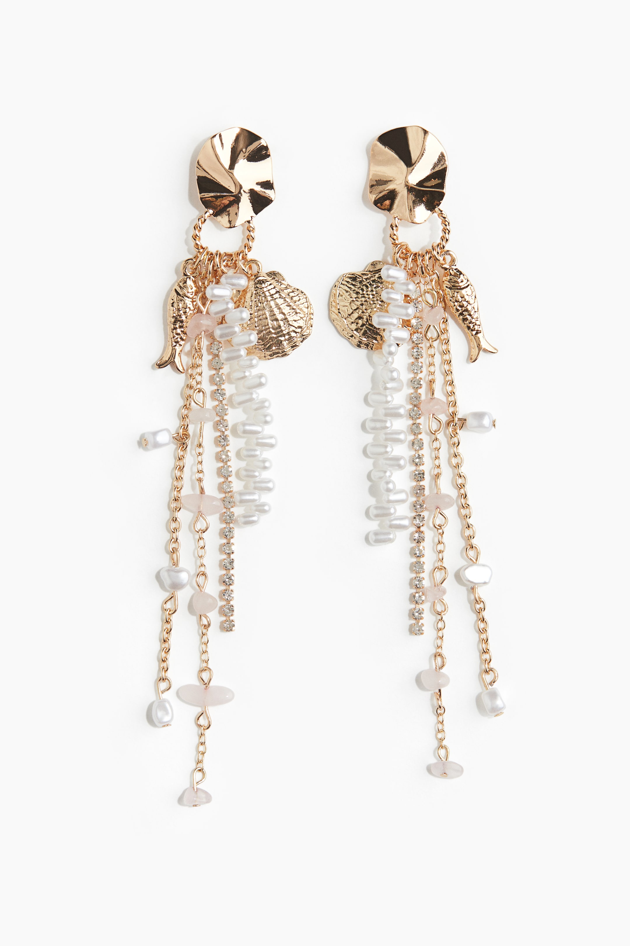Dangle earrings in metal with long chains and marine-themed pendants.