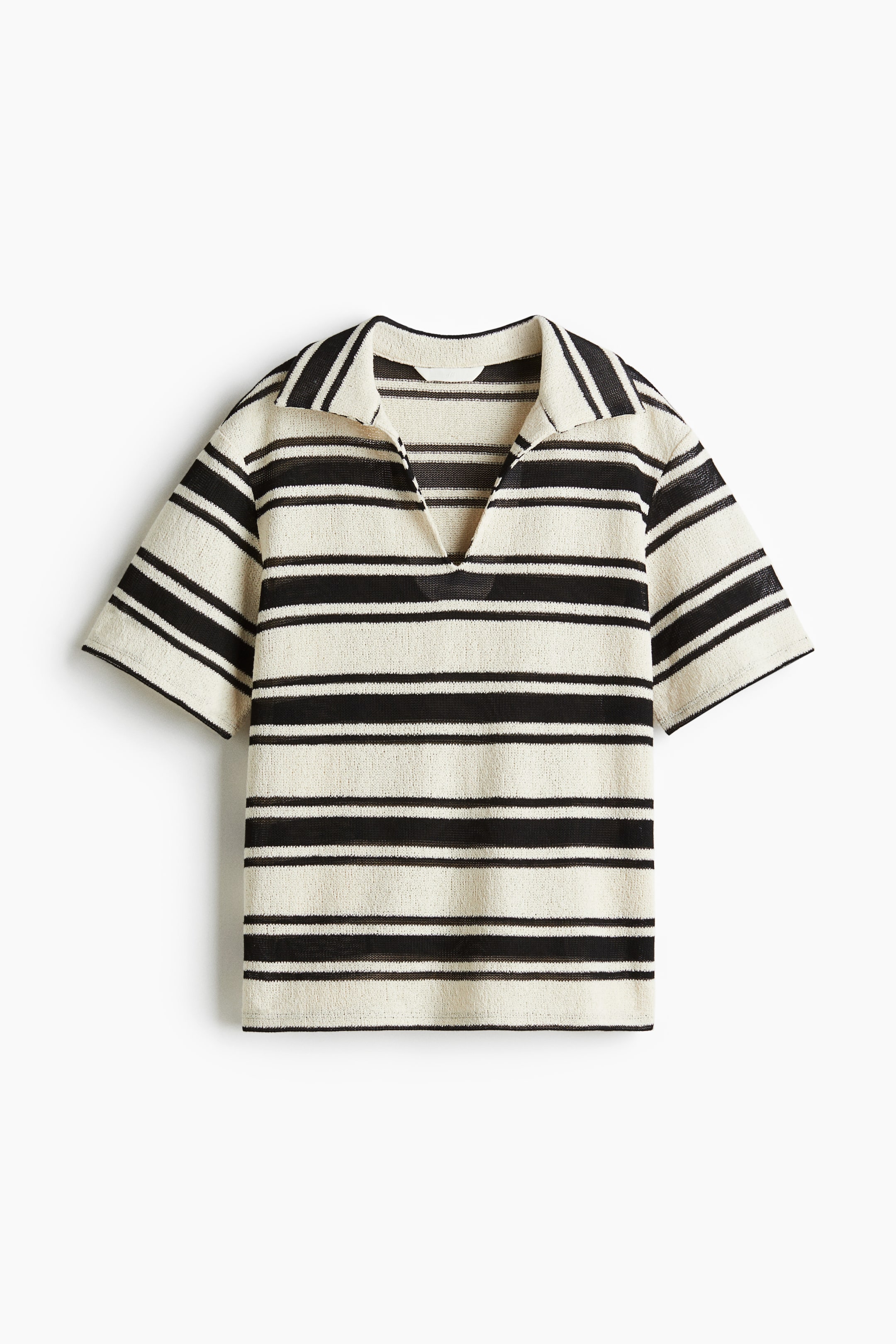 Loose-fit knit top. Open collar, gently dropped shoulders, and short sleeves.