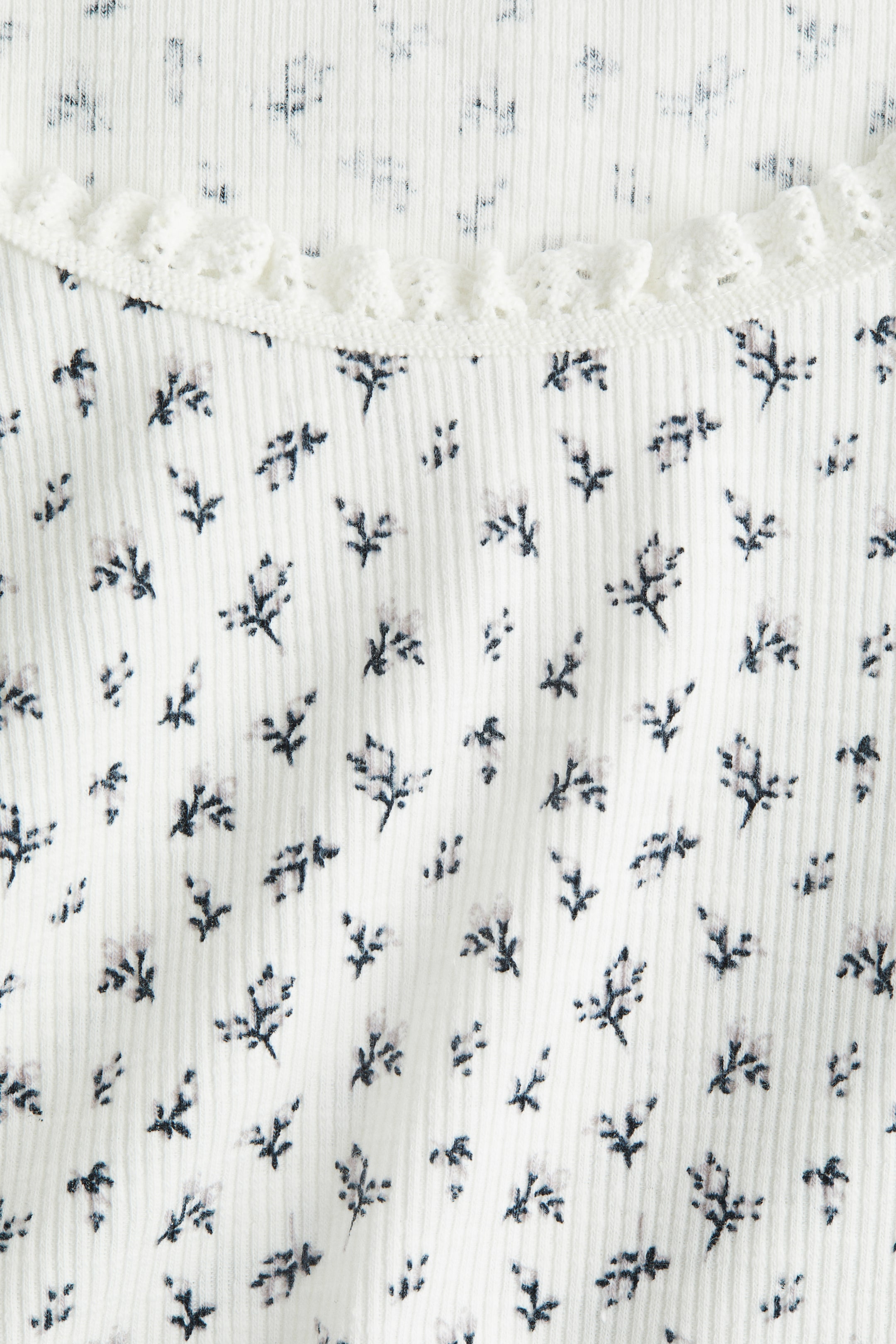 Short, fitted top in soft, ribbed jersey. Lace-trimmed round neckline, short sleeves with lace-trimmed cuffs, and an overlocked edge at hem.