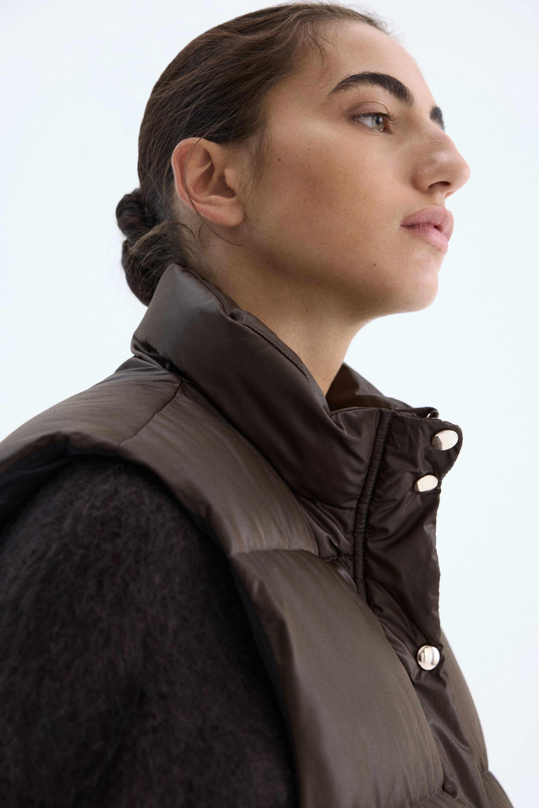 Padded gilet in a quilted weave with a stand collar and a zip and wind flap with press-studs down the front. Patch front pockets. Lined.