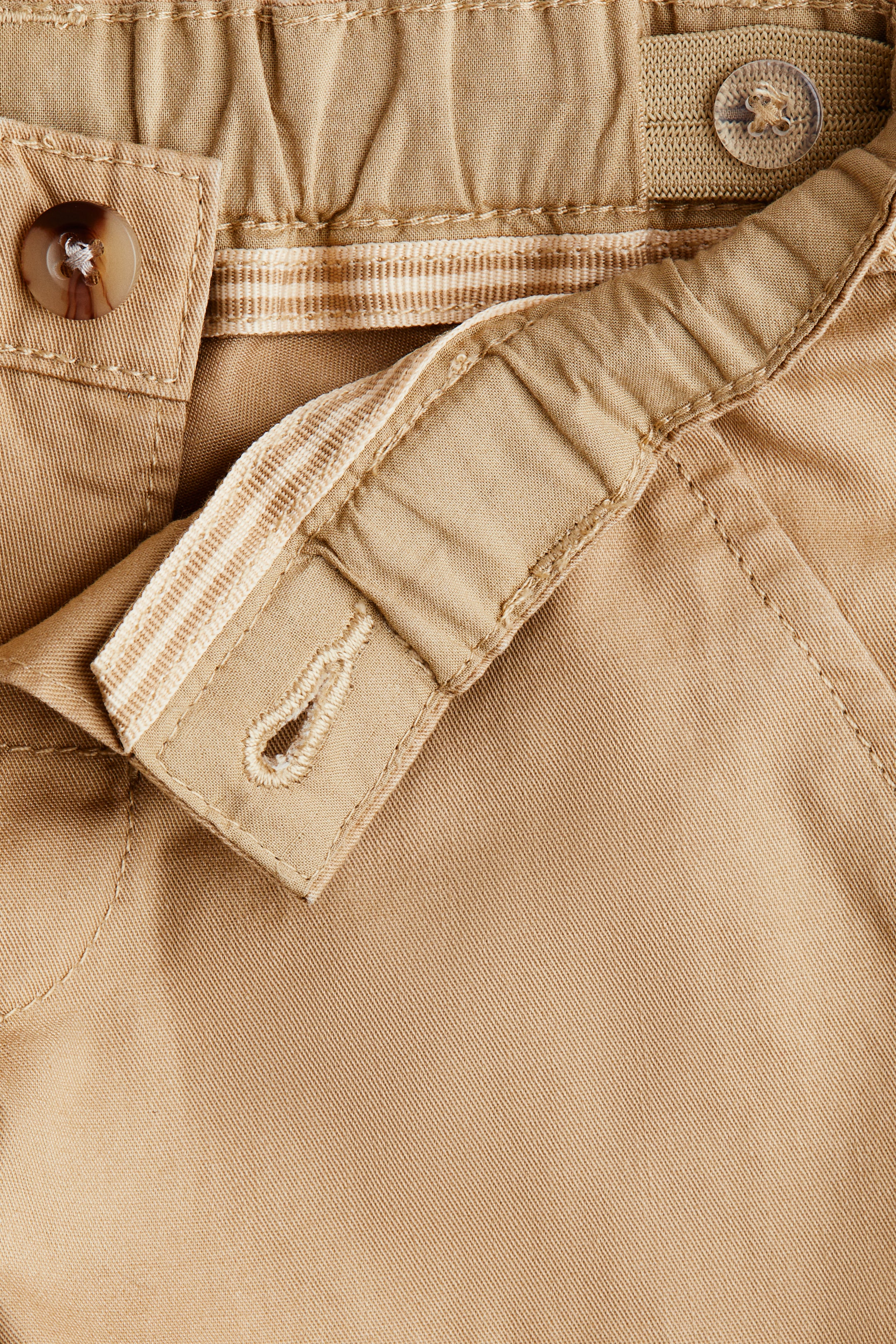 Shorts in cotton twill. Adjustable, elasticized waistband, mock fly with button, and decorative side pockets.