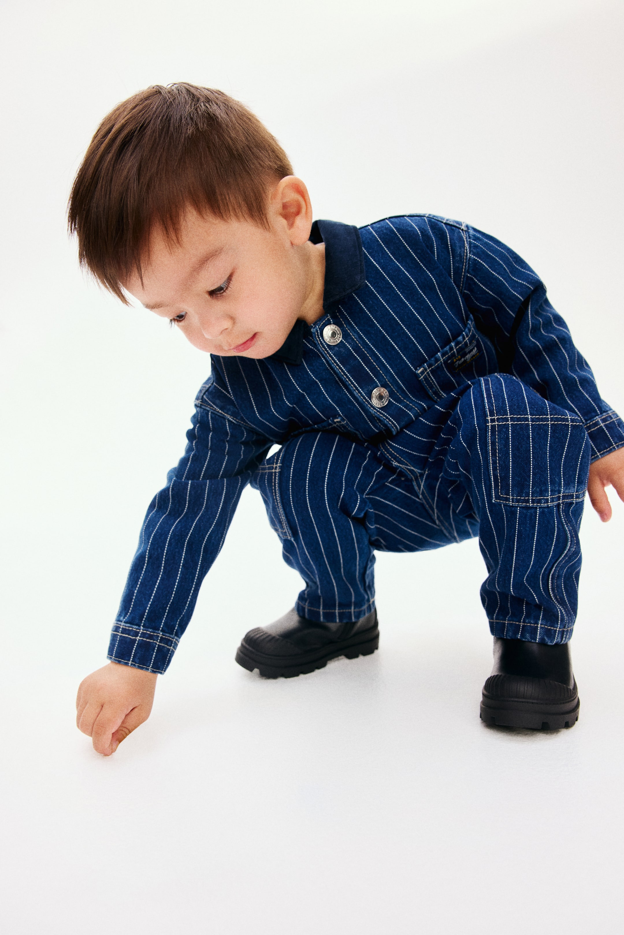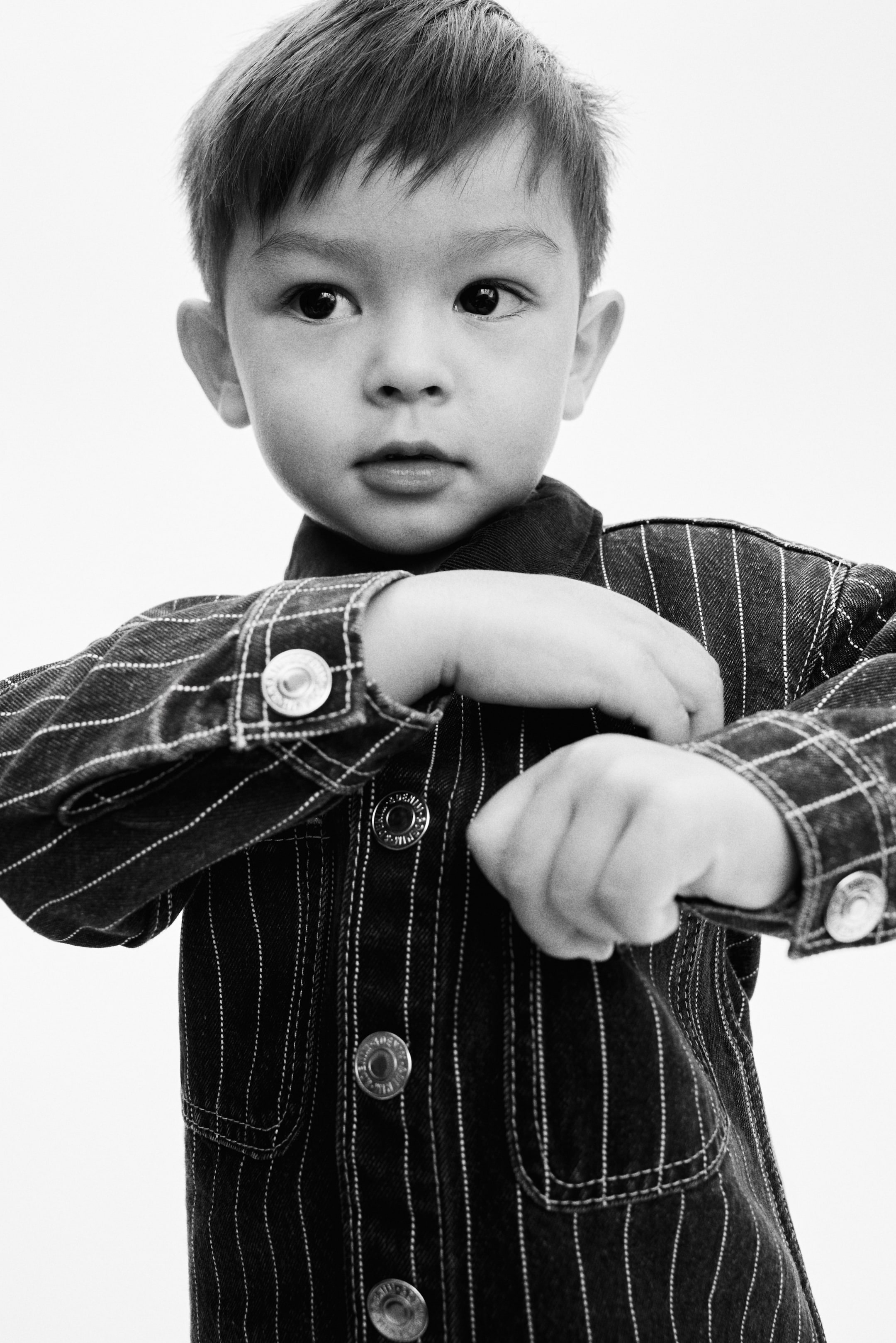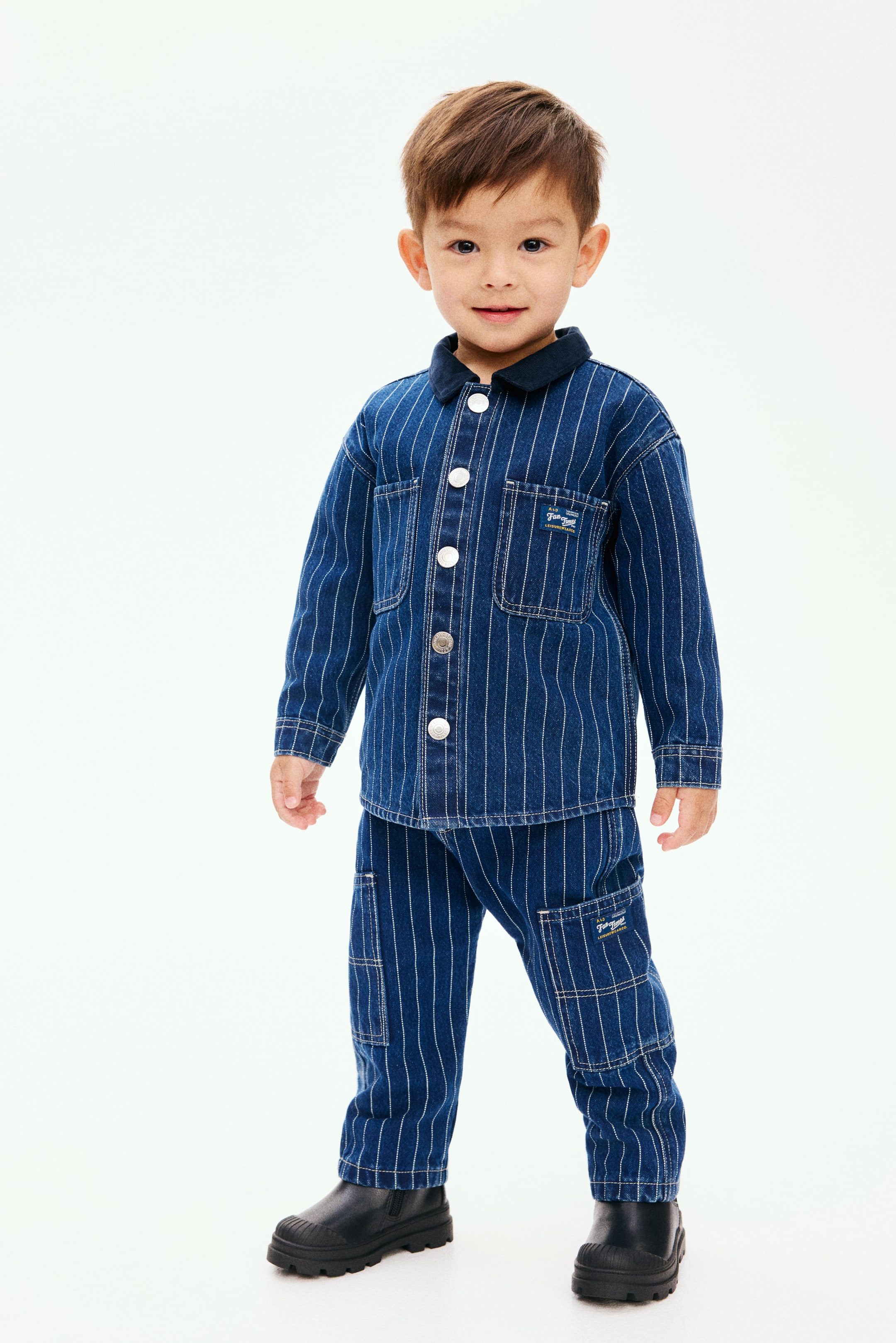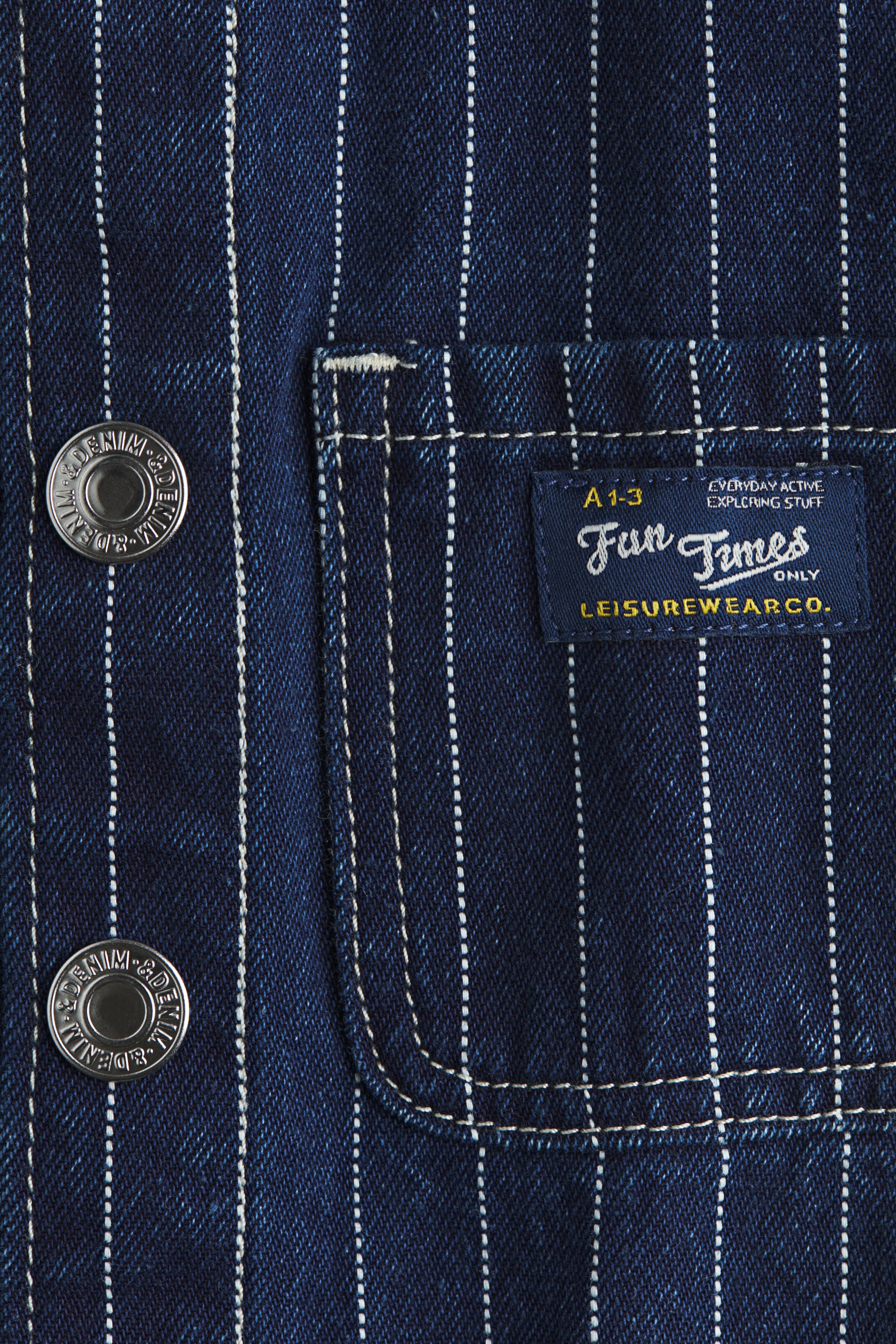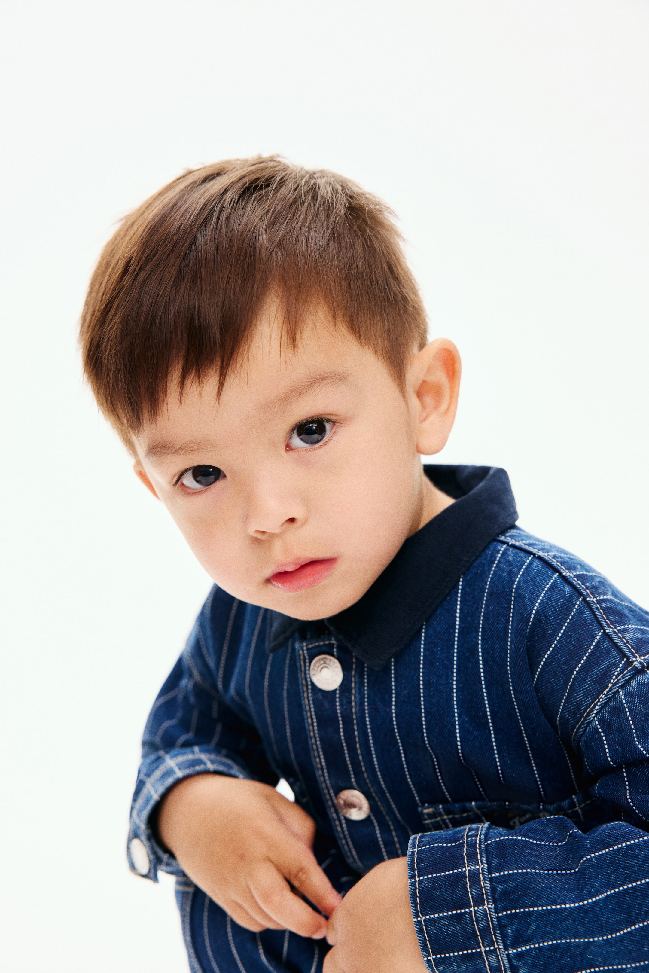 Overshirt in striped cotton denim with contrasting seams. Collar in corduroy, snap fasteners at front, and patch chest pockets. Dropped shoulders and snap fastener at cuffs. Rounded hem.