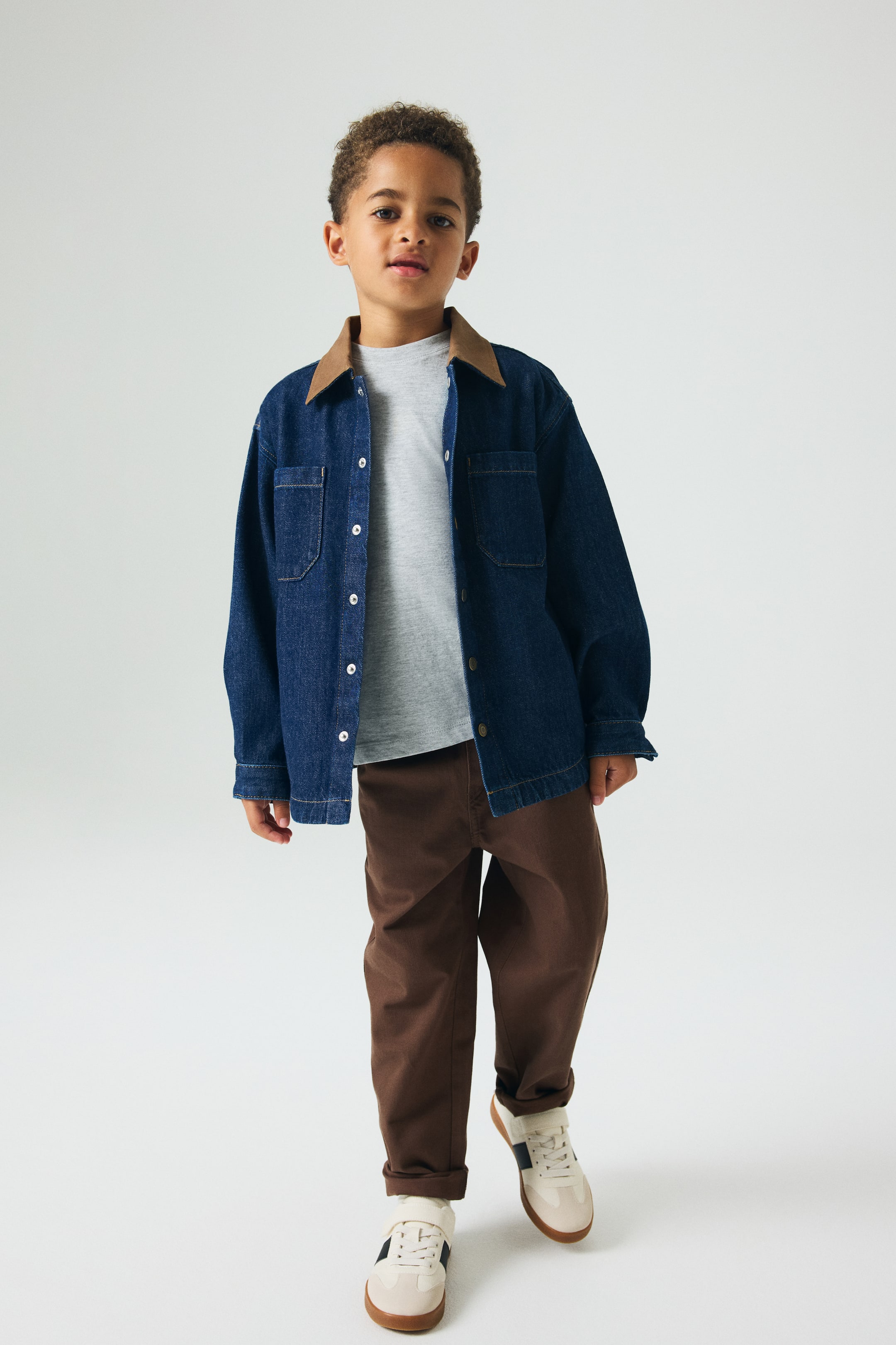 Relaxed-fit pants in soft cotton twill. Drawstring and covered elastic at waistband, mock fly, diagonal side pockets, and patch back pockets. Tapered legs.
