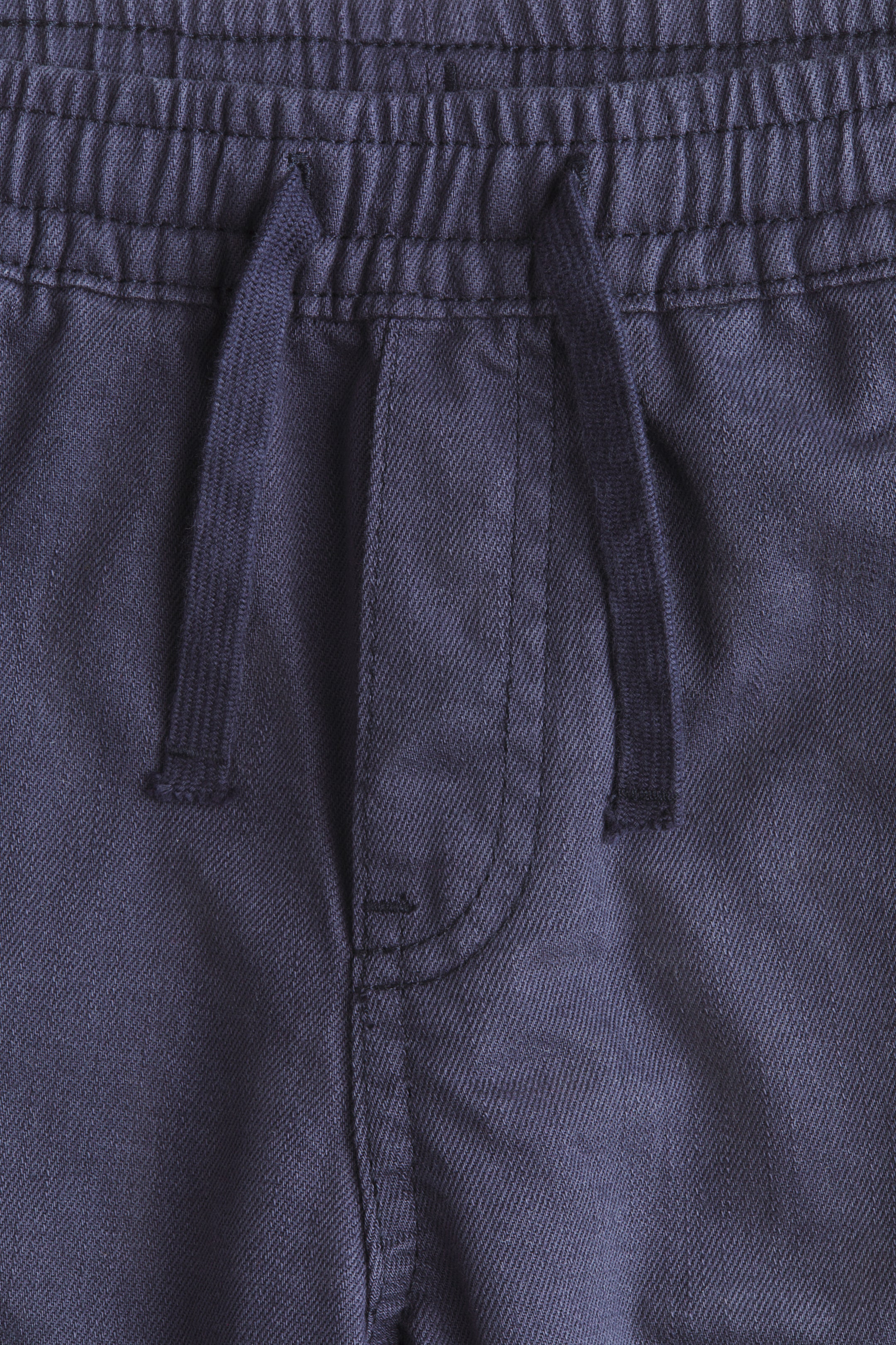 Relaxed-fit pants in soft cotton twill. Drawstring and covered elastic at waistband, mock fly, diagonal side pockets, and patch back pockets. Tapered legs.