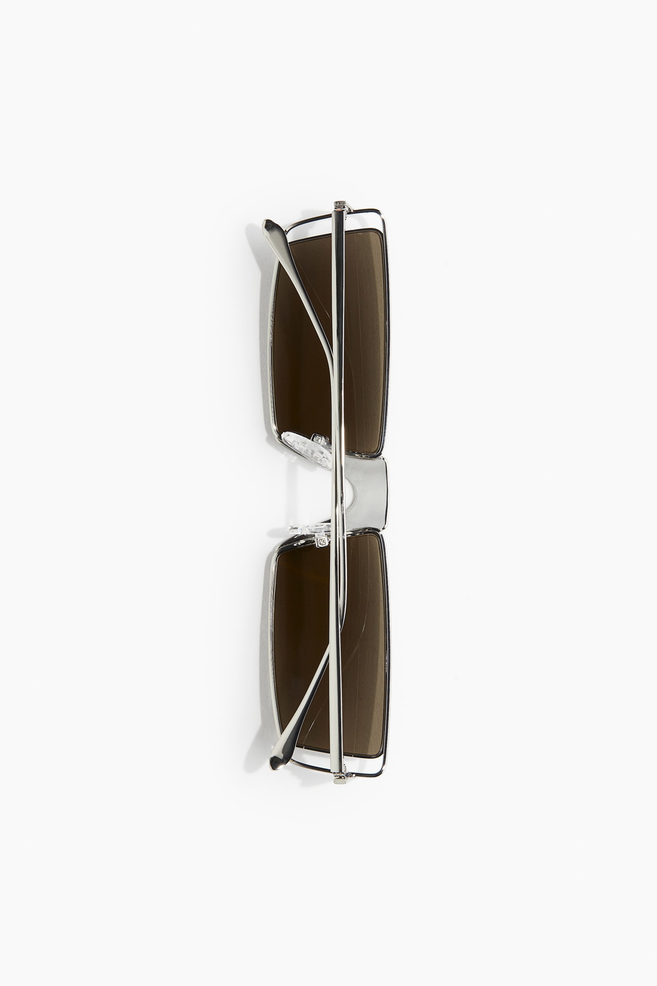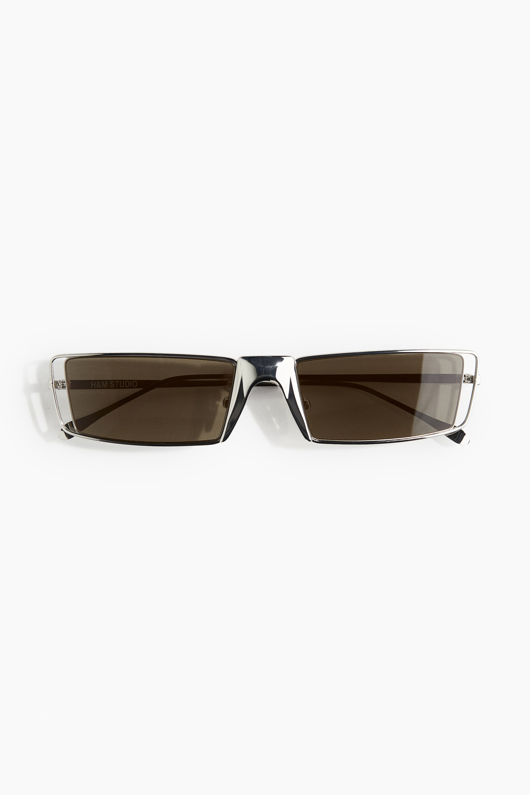 Sleek, straight sunglasses in 304 stainless steel with narrow details. Adjustable nose pads and tinted, UV-protective lenses in plastic.