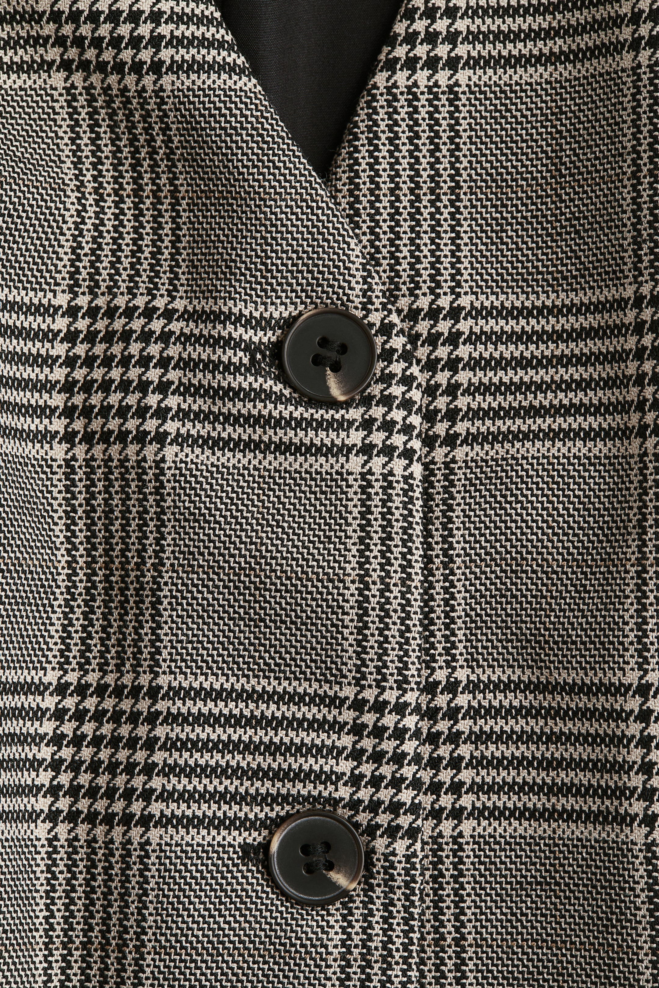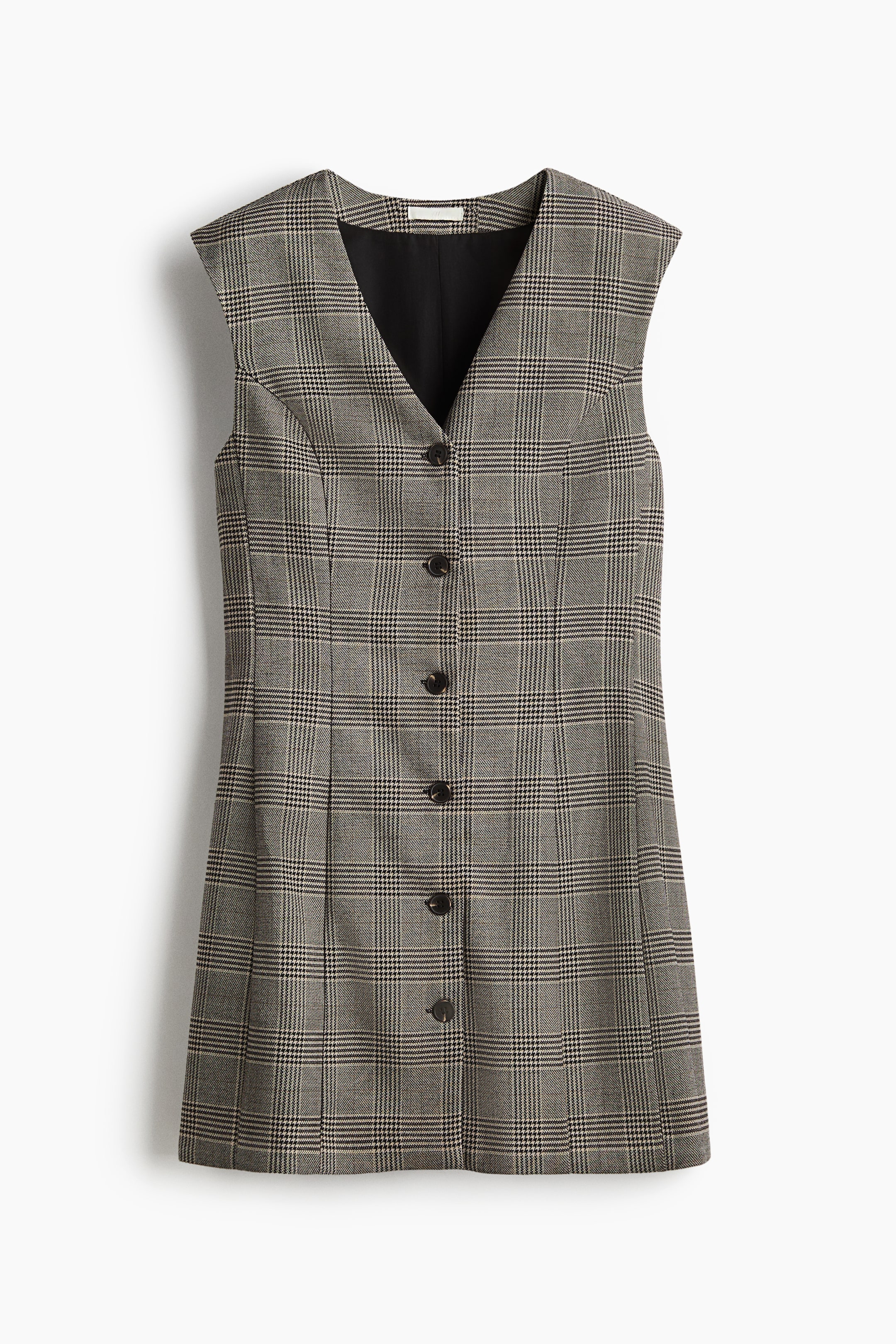Short, sleeveless dress in woven fabric. V-neck, buttons at front, and shoulder pads. Lined.