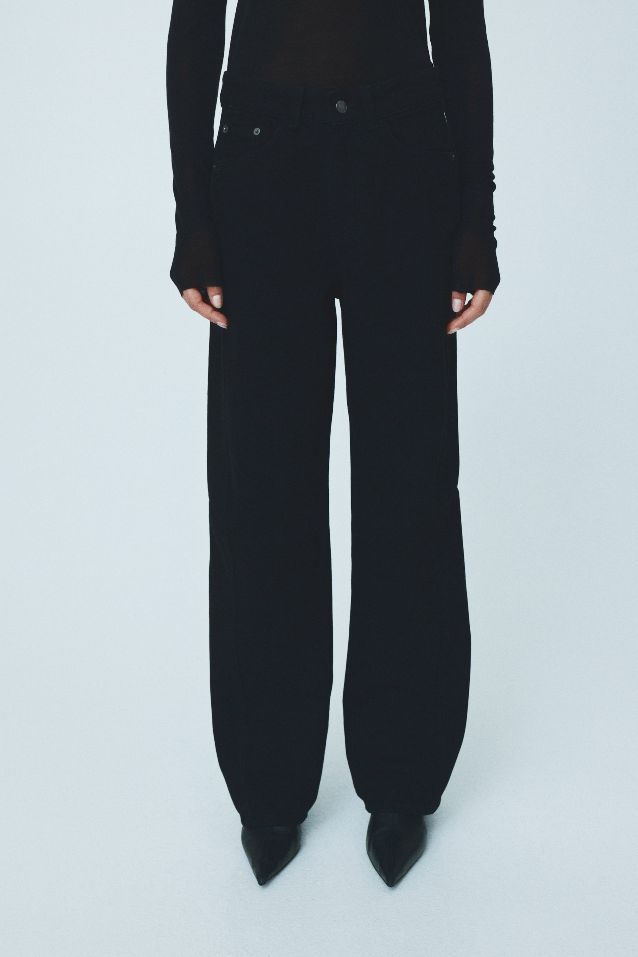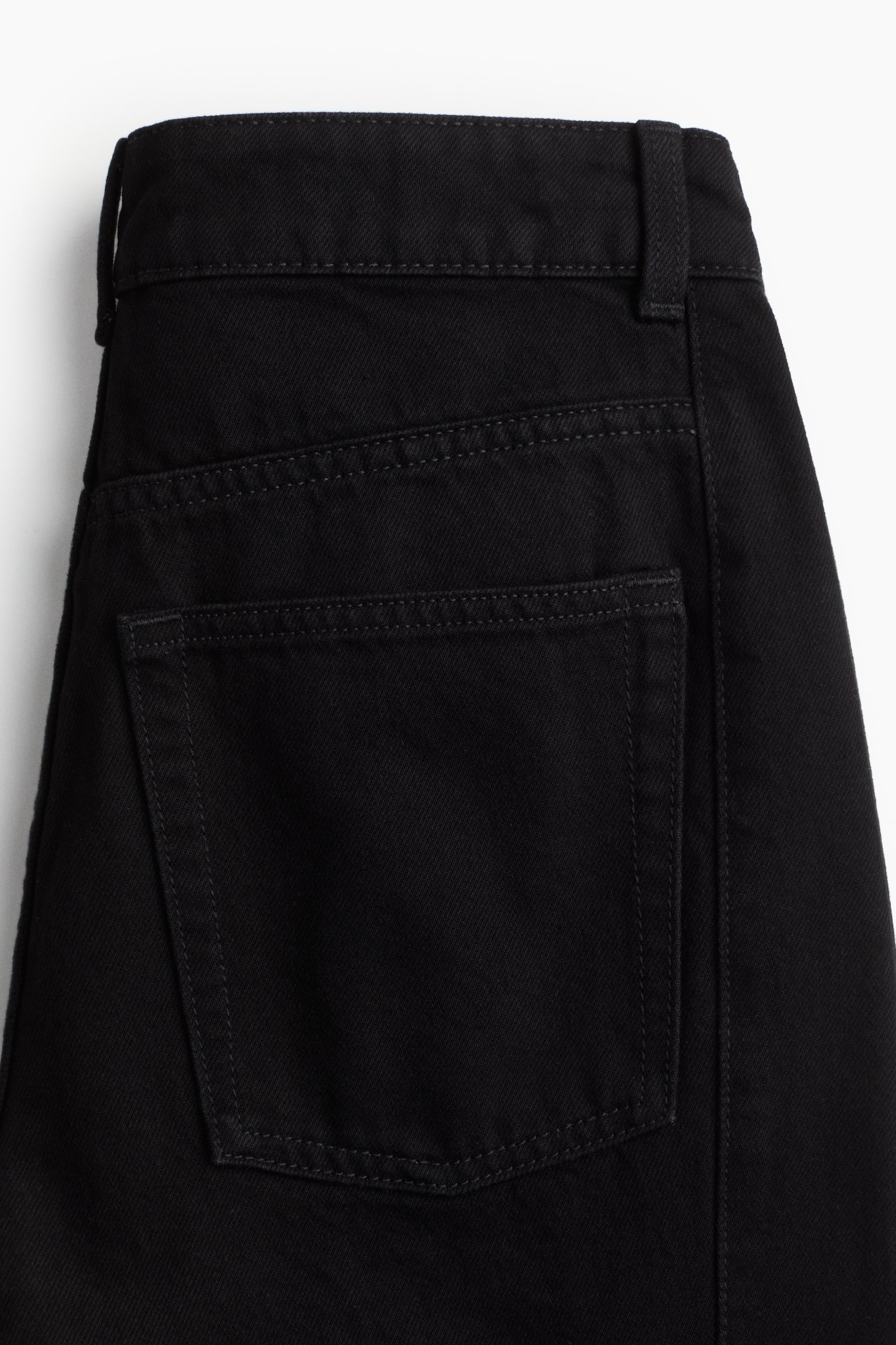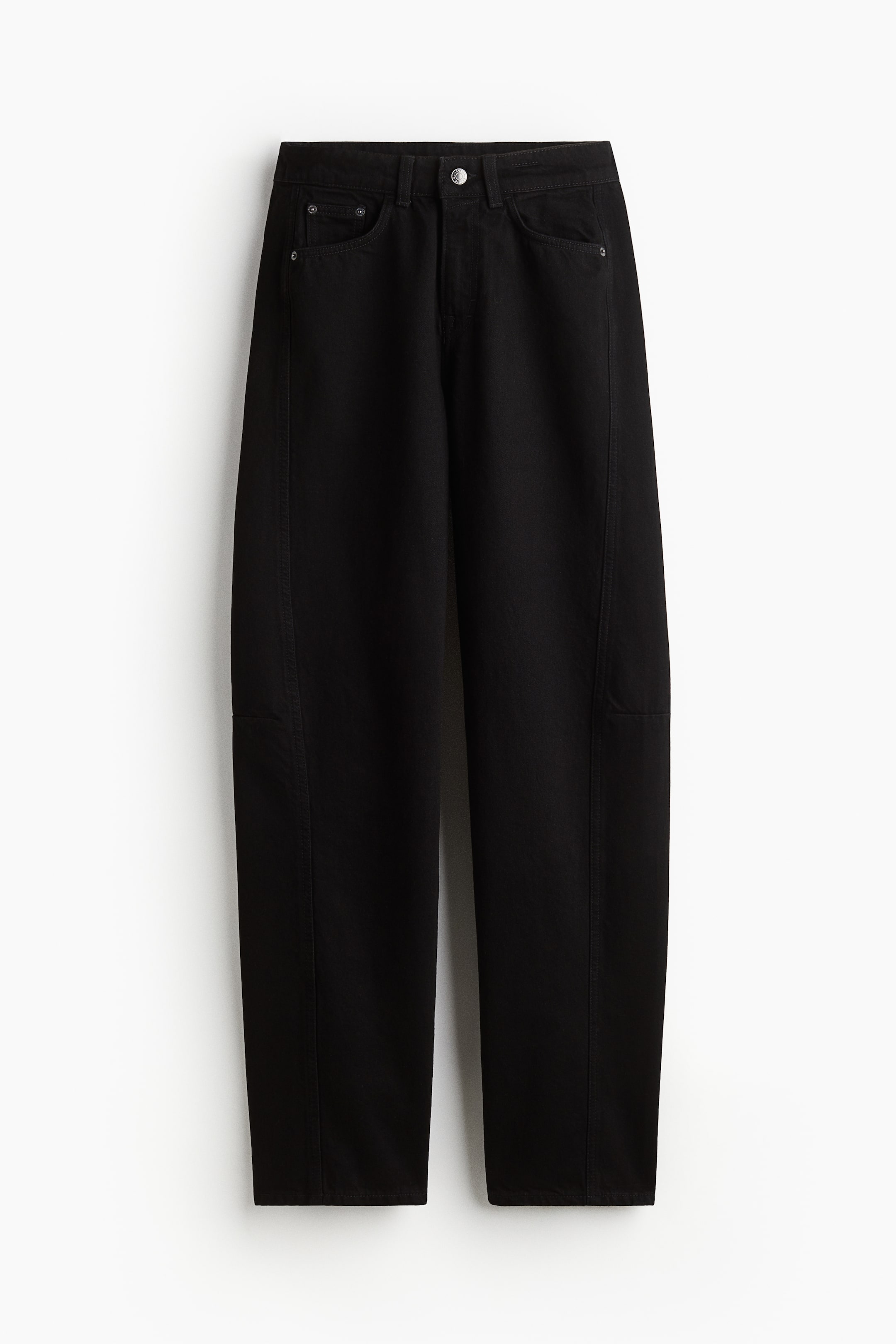 5-pocket jeans in rigid cotton denim. Regular waist and zip fly with button. Wide, longer legs with tone-on-tone side panels and a dart at knees for added volume.