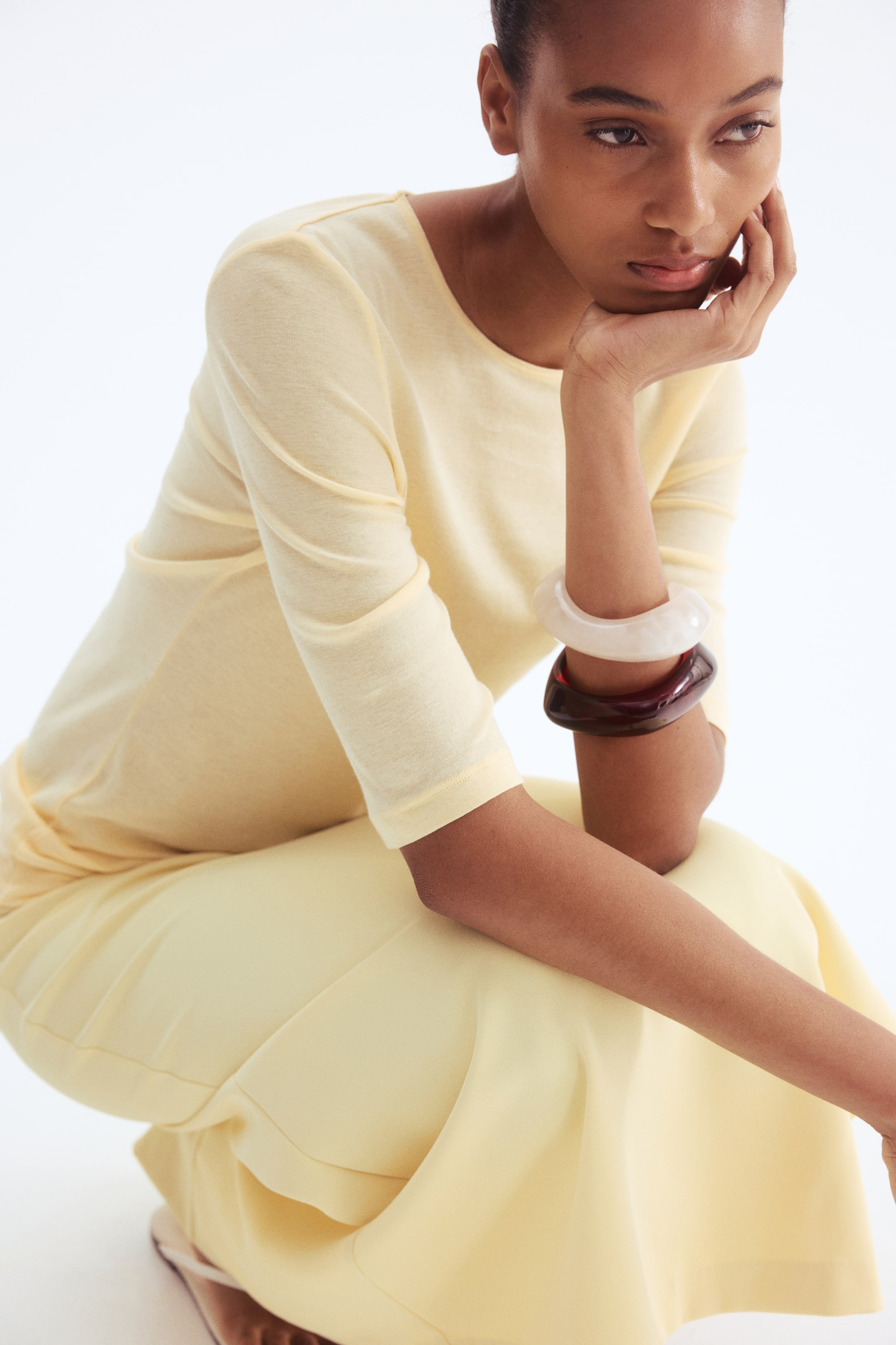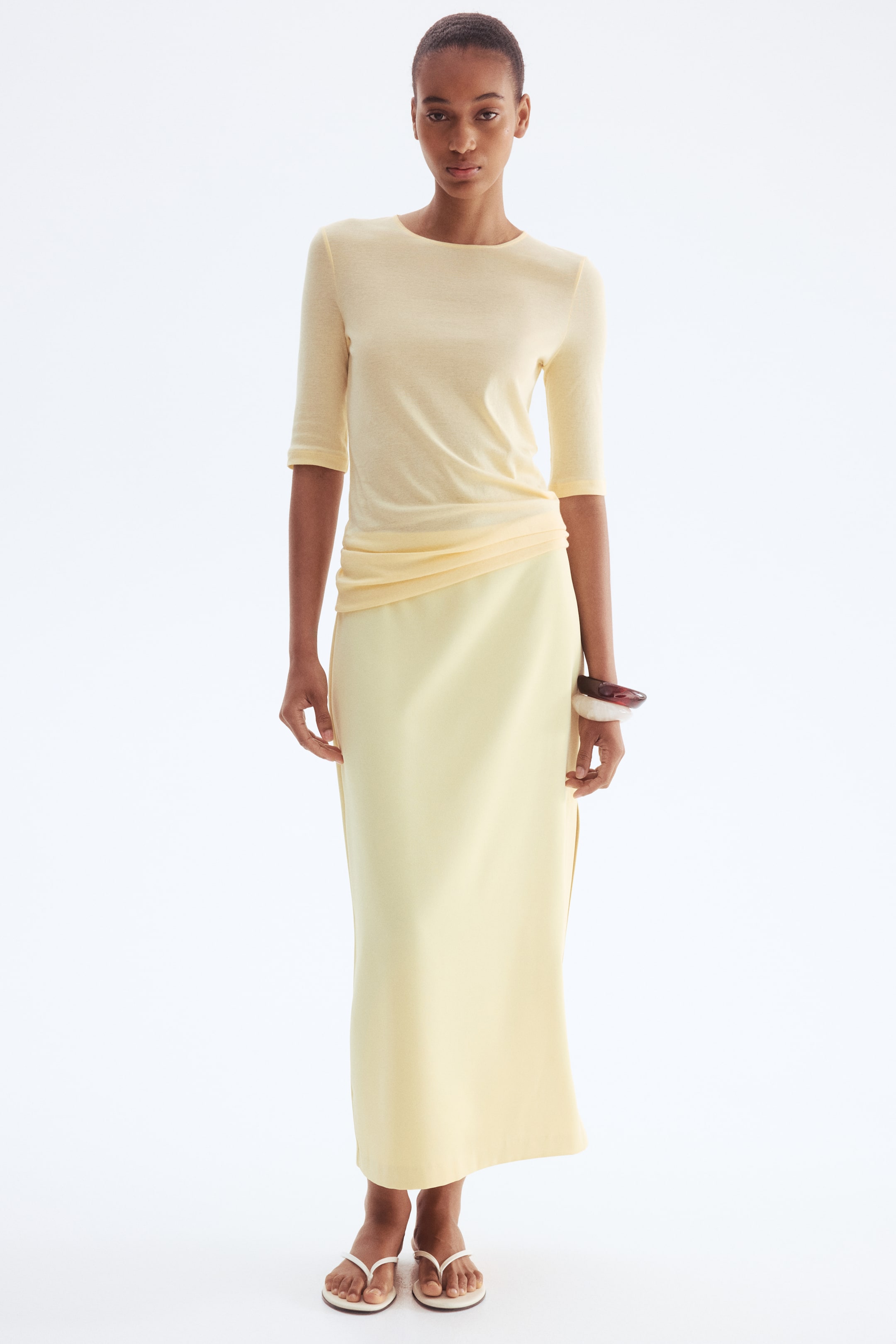 Fitted, calf-length skirt in woven crêpe fabric. High waist with darts, concealed zipper at back, and a straight-cut hem with a slit at one side. Unlined.