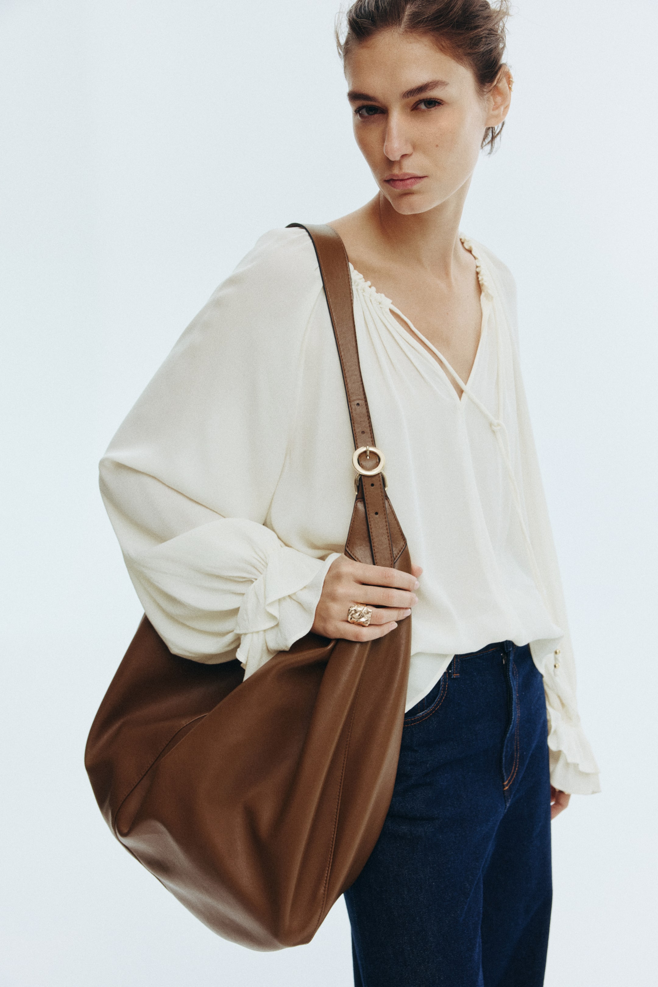 Blouse in woven viscose crêpe. Round, gathered neckline, an opening at front with narrow ties, and long raglan balloon sleeves with ruffle at cuffs.