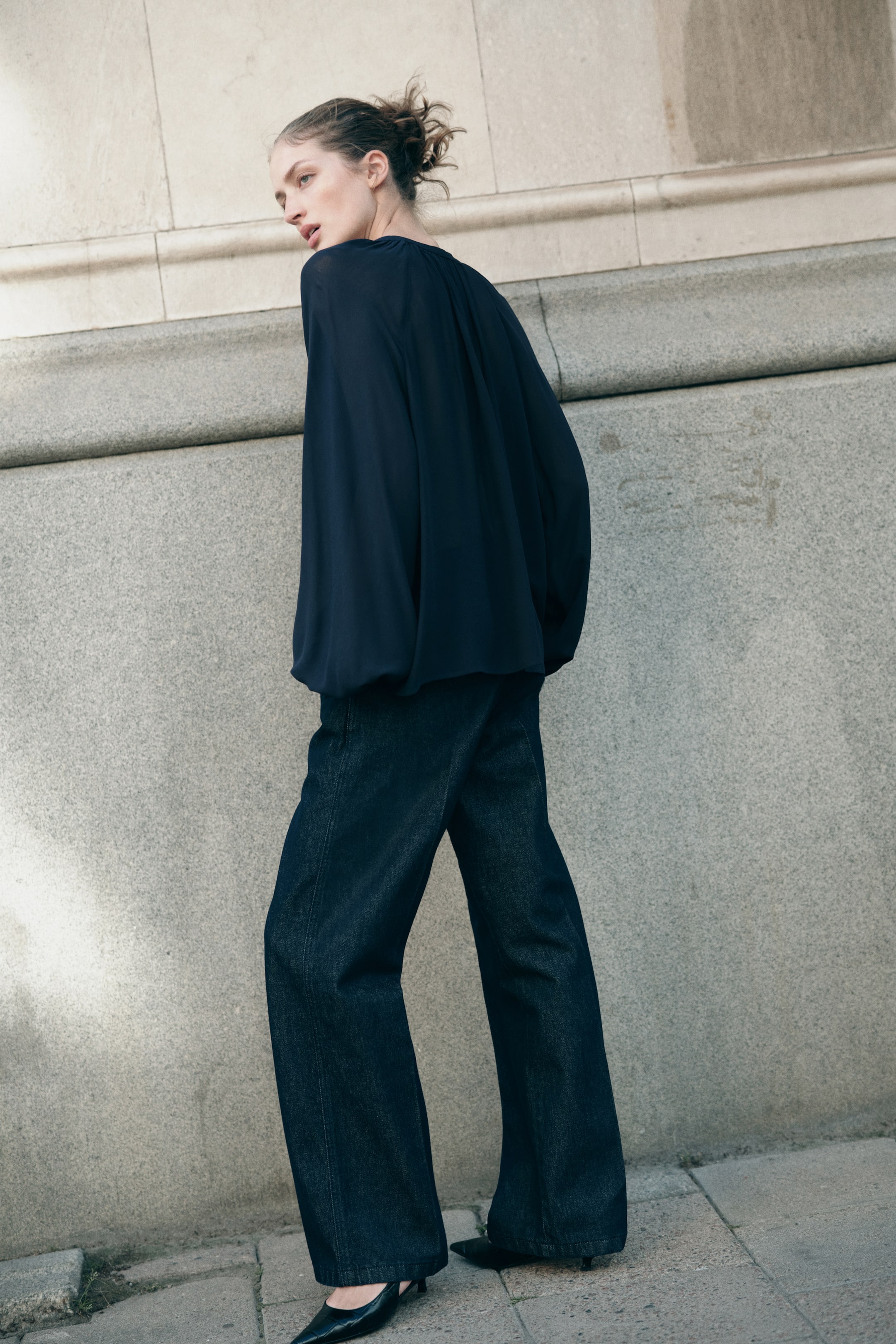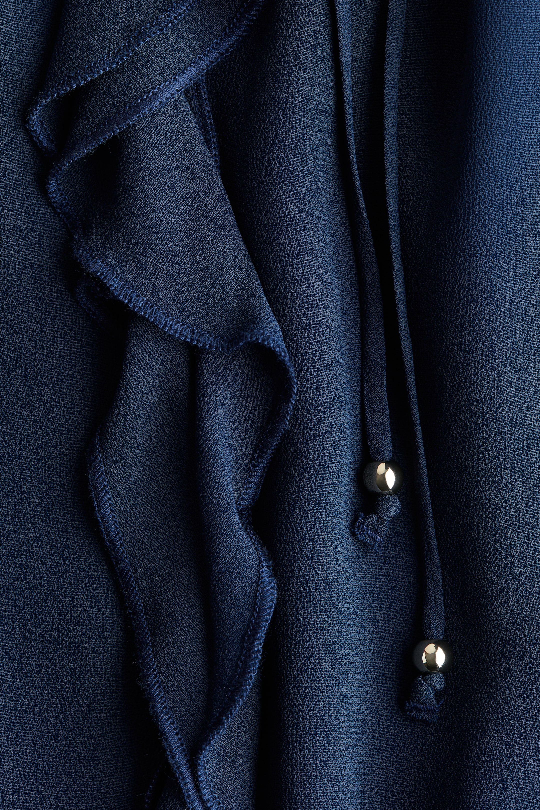 Loose-fit blouse in crêpe chiffon with vertical ruffle trim at front. Band collar, opening at front with extra-narrow ties, long raglan balloon sleeves, and ruffled cuffs with narrow elastic at wrists.