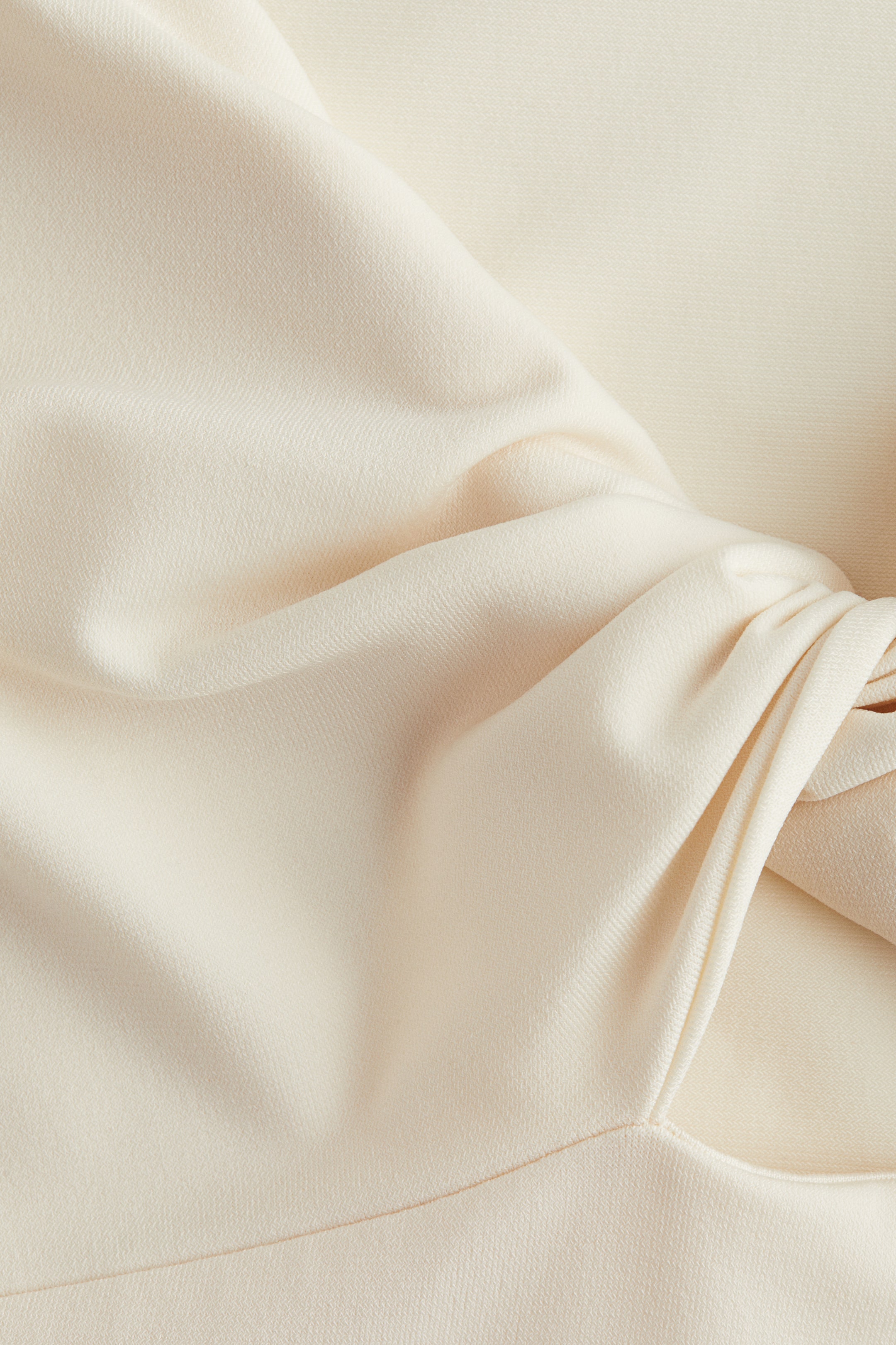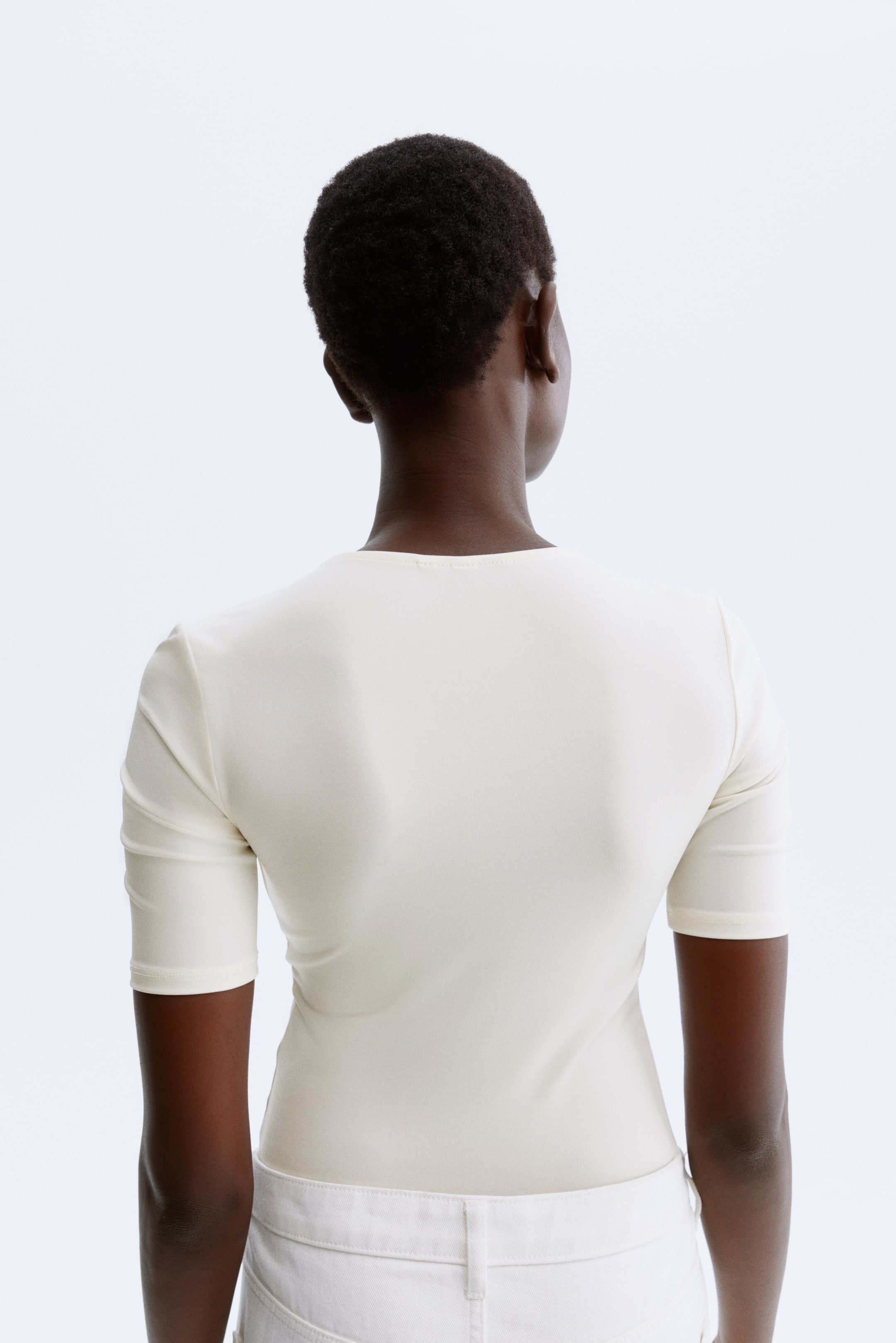 Short-sleeved bodysuit in stretch jersey. Low-cut V-neck, a twisted detail at center bust, and snap fasteners at gusset. Medium coverage at back. Partly lined.