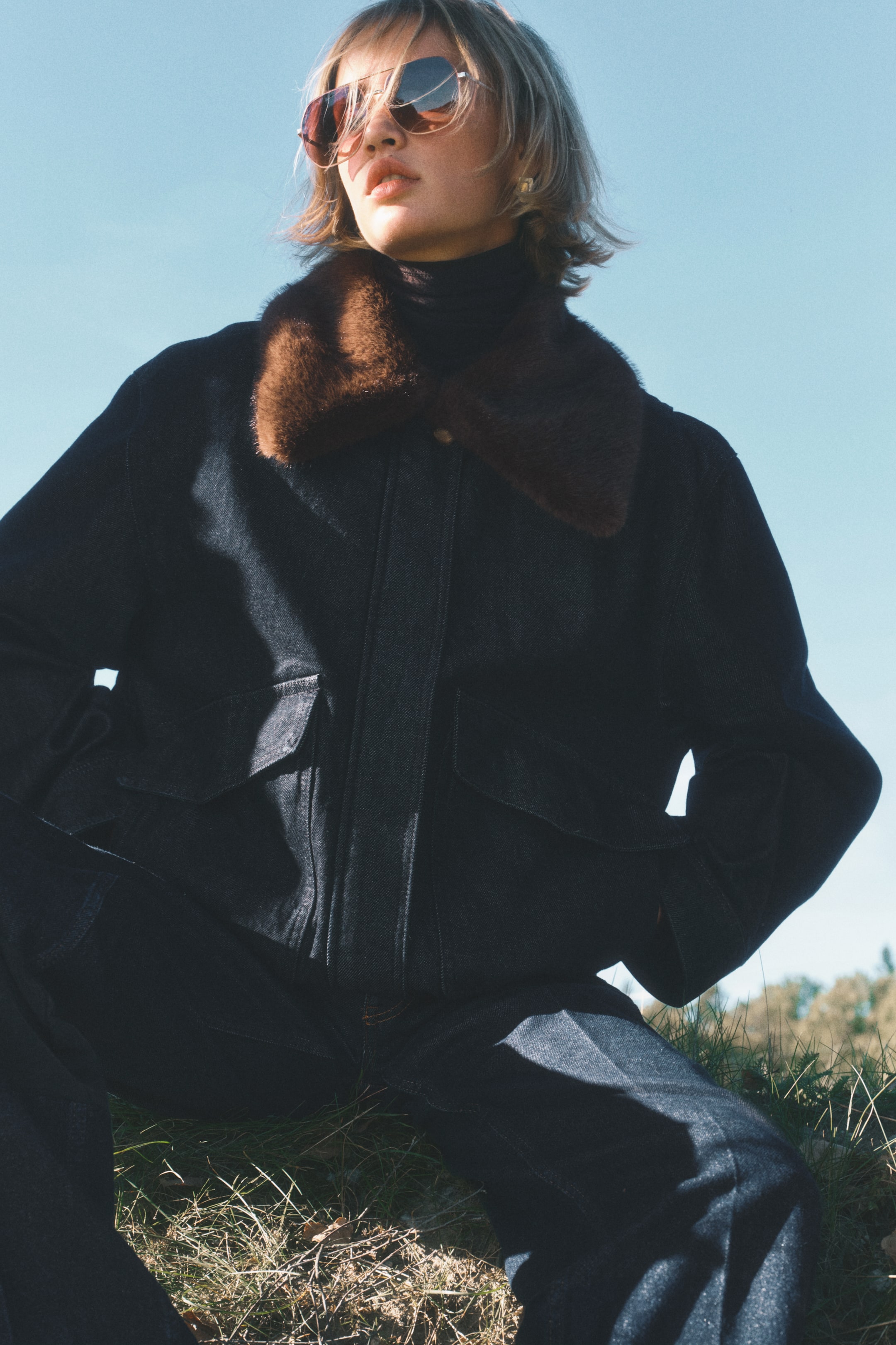 Short, oversized jacket in rigid cotton denim with an additional, detachable collar in fluffy fabric. Collar, zipper at front with wind flap and two visible snap fasteners, pleats at back, and long sleeves. Diagonal front pockets with flap and side openings. Smocked elastic at hem. Unlined.