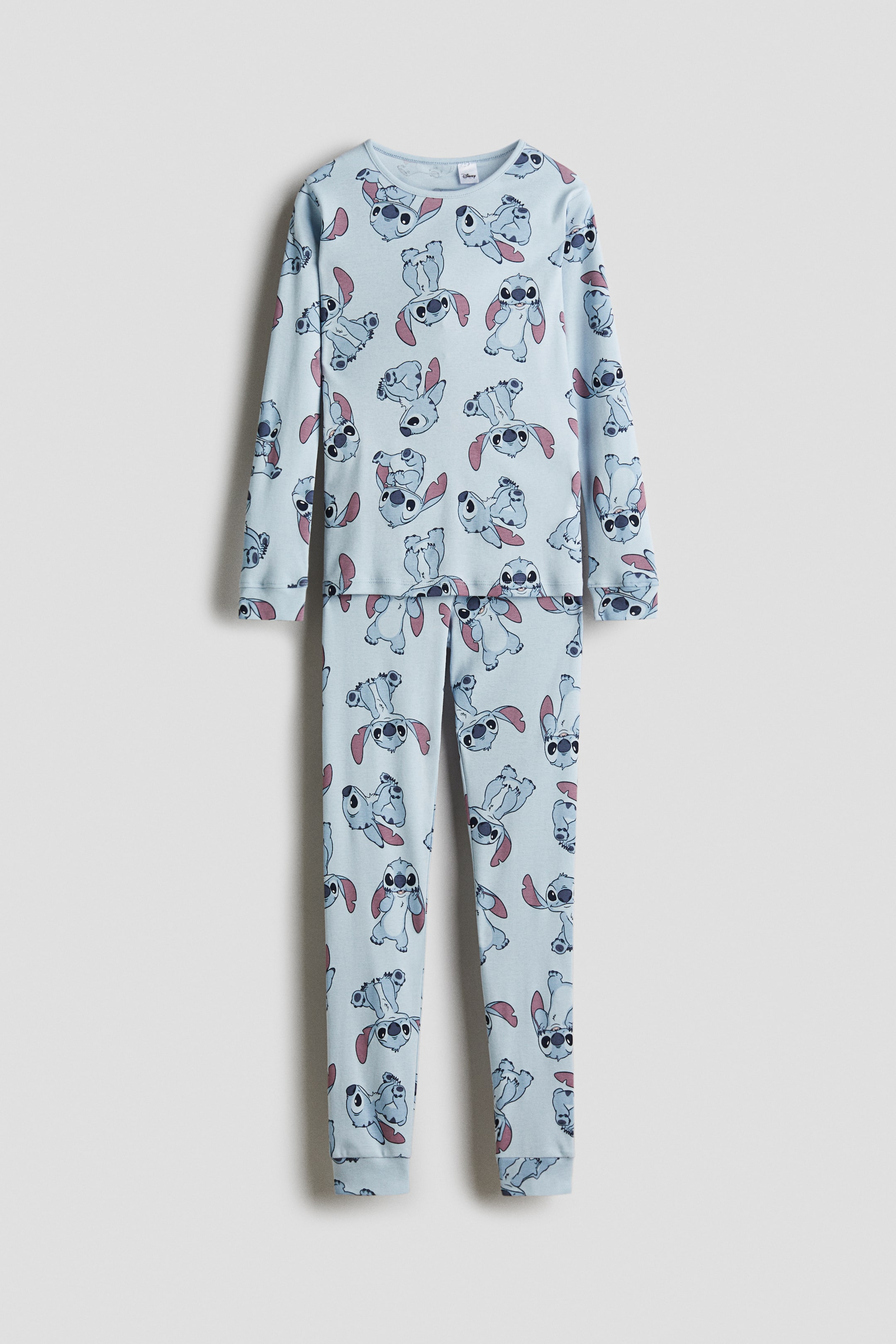 Pajamas in soft cotton jersey with a printed design. Top with binding at neckline and long sleeves with ribbed cuffs. Pants with soft, covered elastic at waistband and ribbed hems.