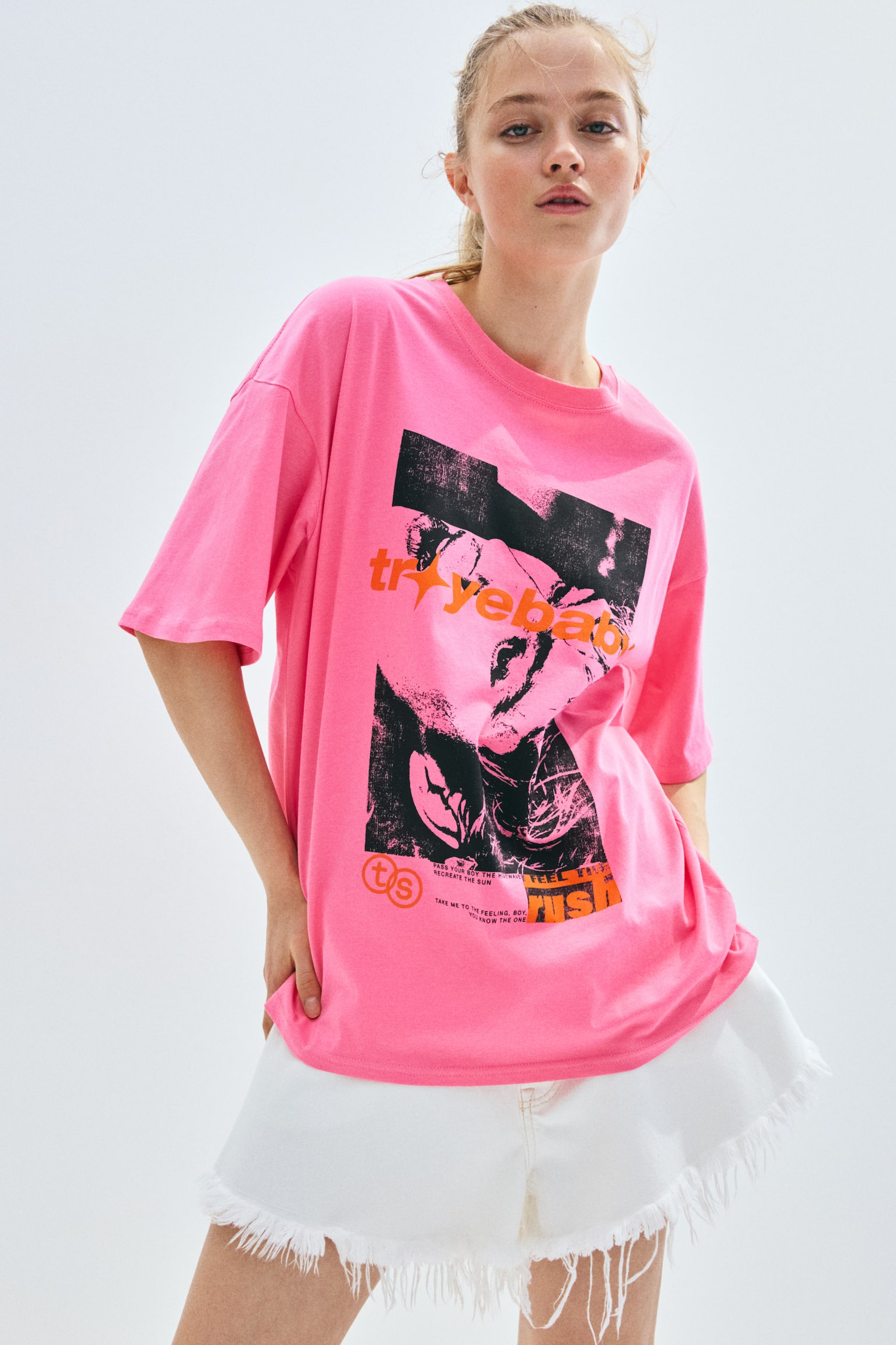 Express yourself with our bold and stylish women's graphic T-shirts. From band logos and catchy slogans to vintage-style prints and playful characters, there's a tee for every mood. Discover oversized and cropped fits, location prints, and quirky graphics in a variety of colors and fabrics. Whether you're dressing up or going casual, find your perfect match in our selection of graphic T-shirts. Or keep it simple with plain basics and explore the full collection of women's tops for more options.