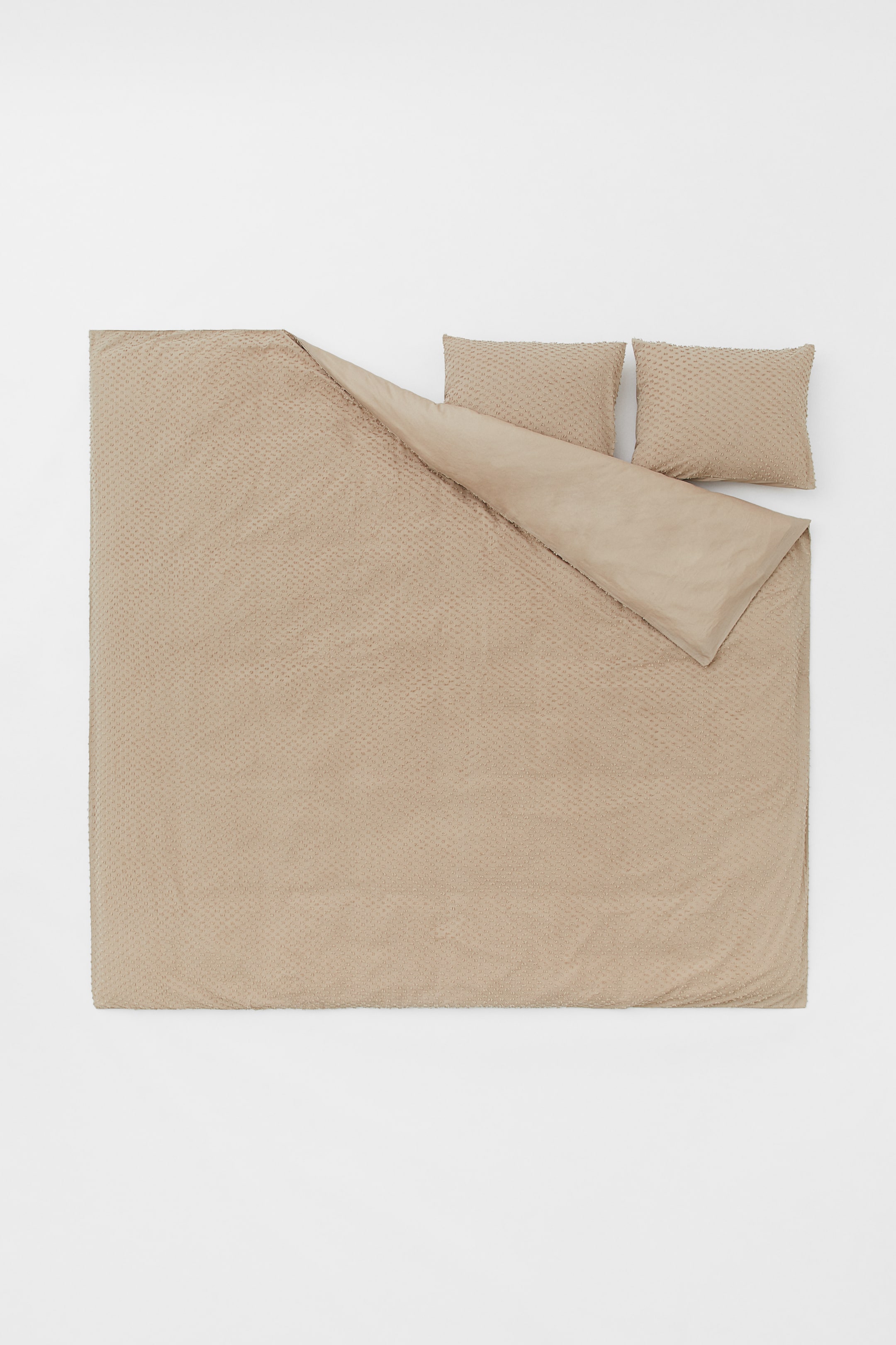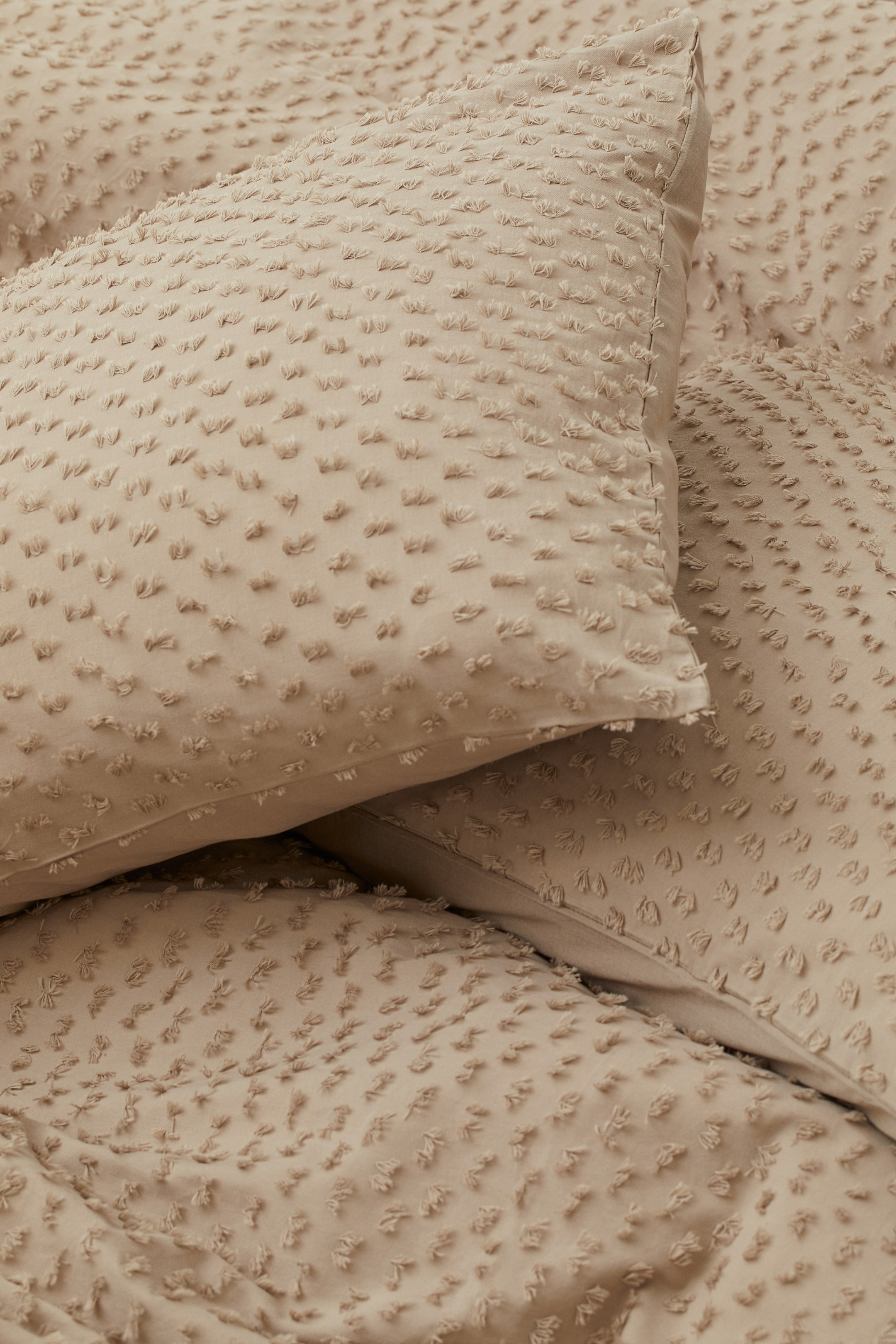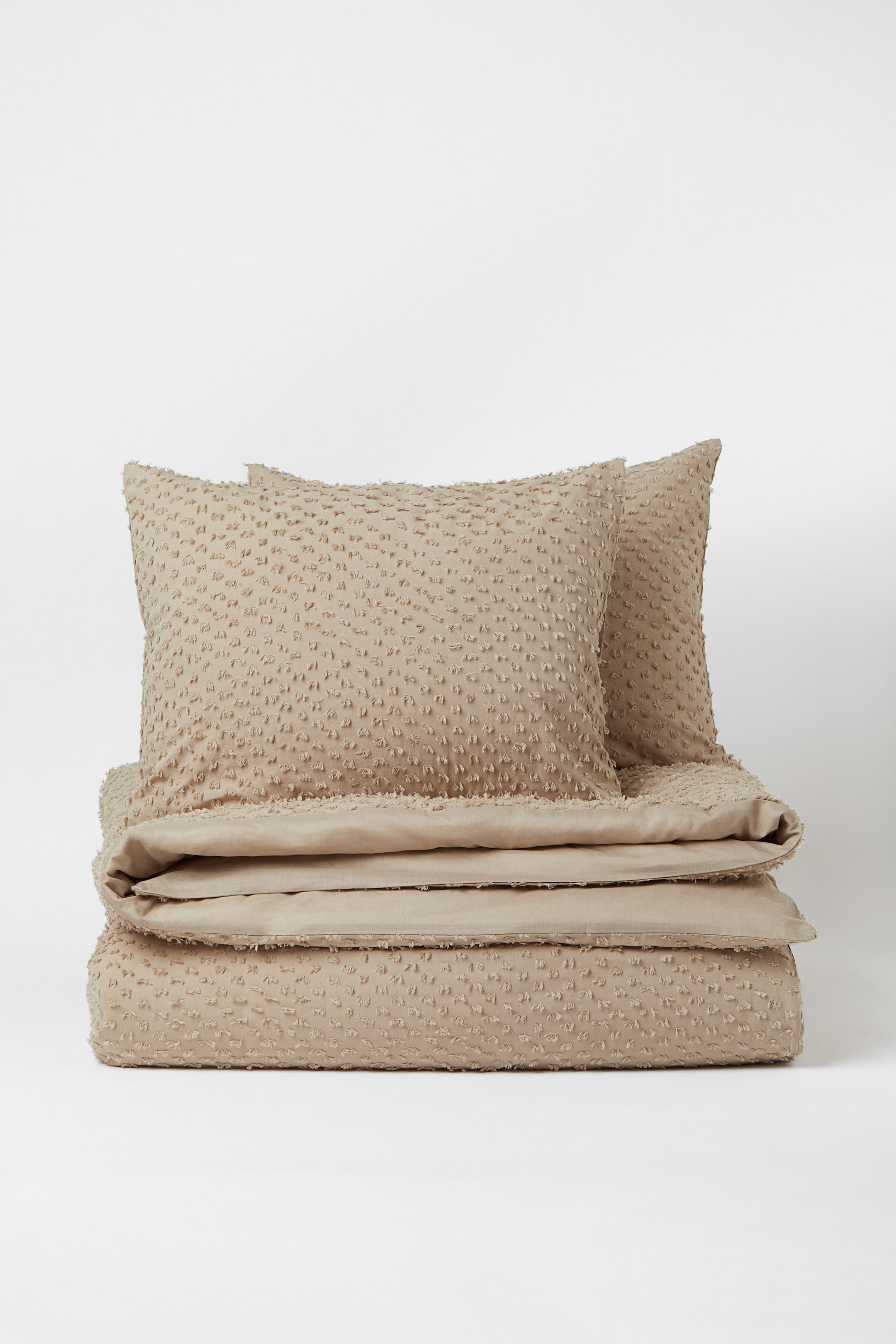Conjunto de funda nórdica doble en tejido de algodón con plumeti delante y reverso liso. Cierre de botones en la parte inferior. Dos fundas de almohada con abertura tipo sobre.