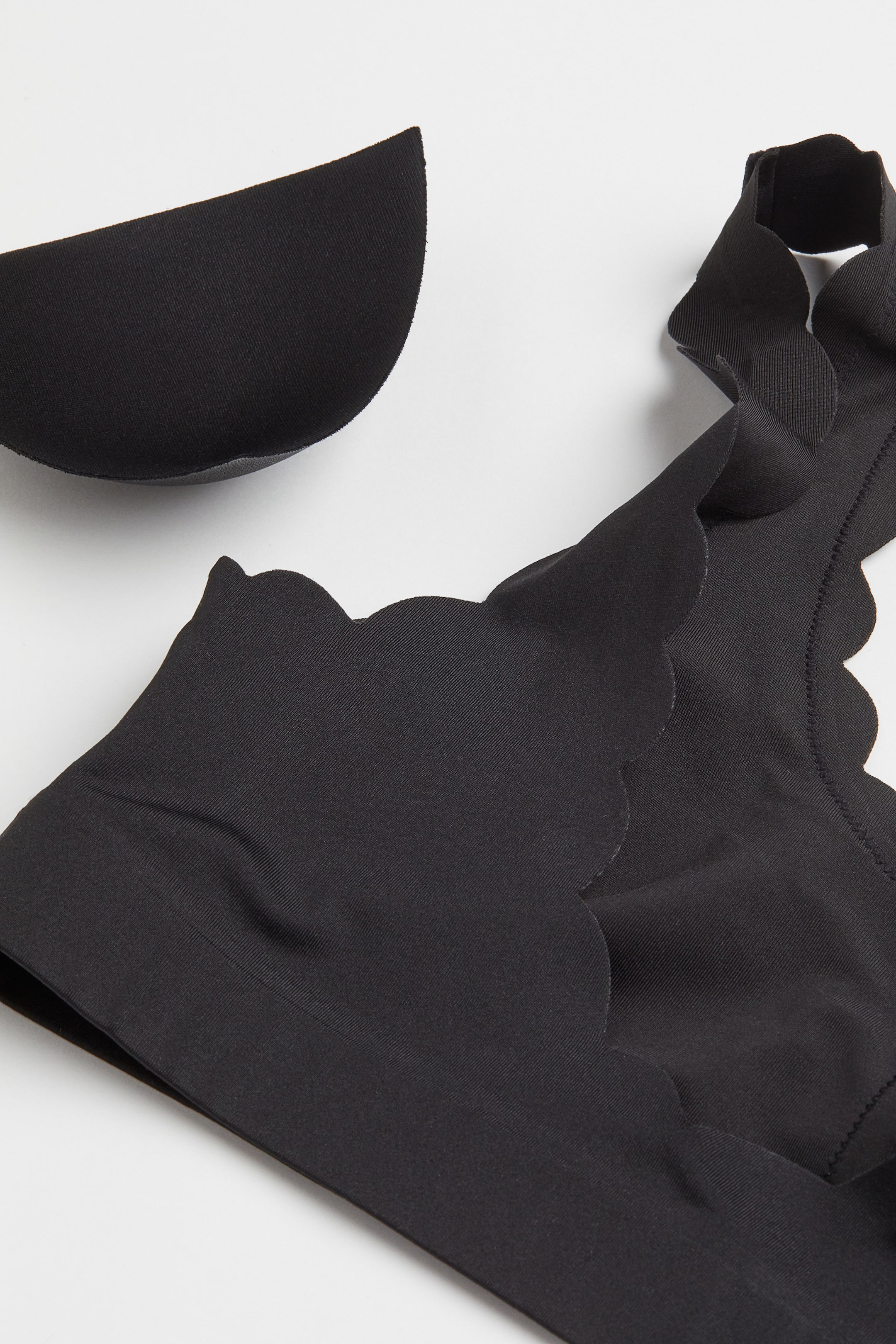 Top de bikini en punto con bordes festoneados cortados a láser. Modelo con tirantes anchos y copas acolchadas con relleno extraíble que moldean el busto y proporcionan una buena sujeción. Sin cierre ni aros. Forrado.