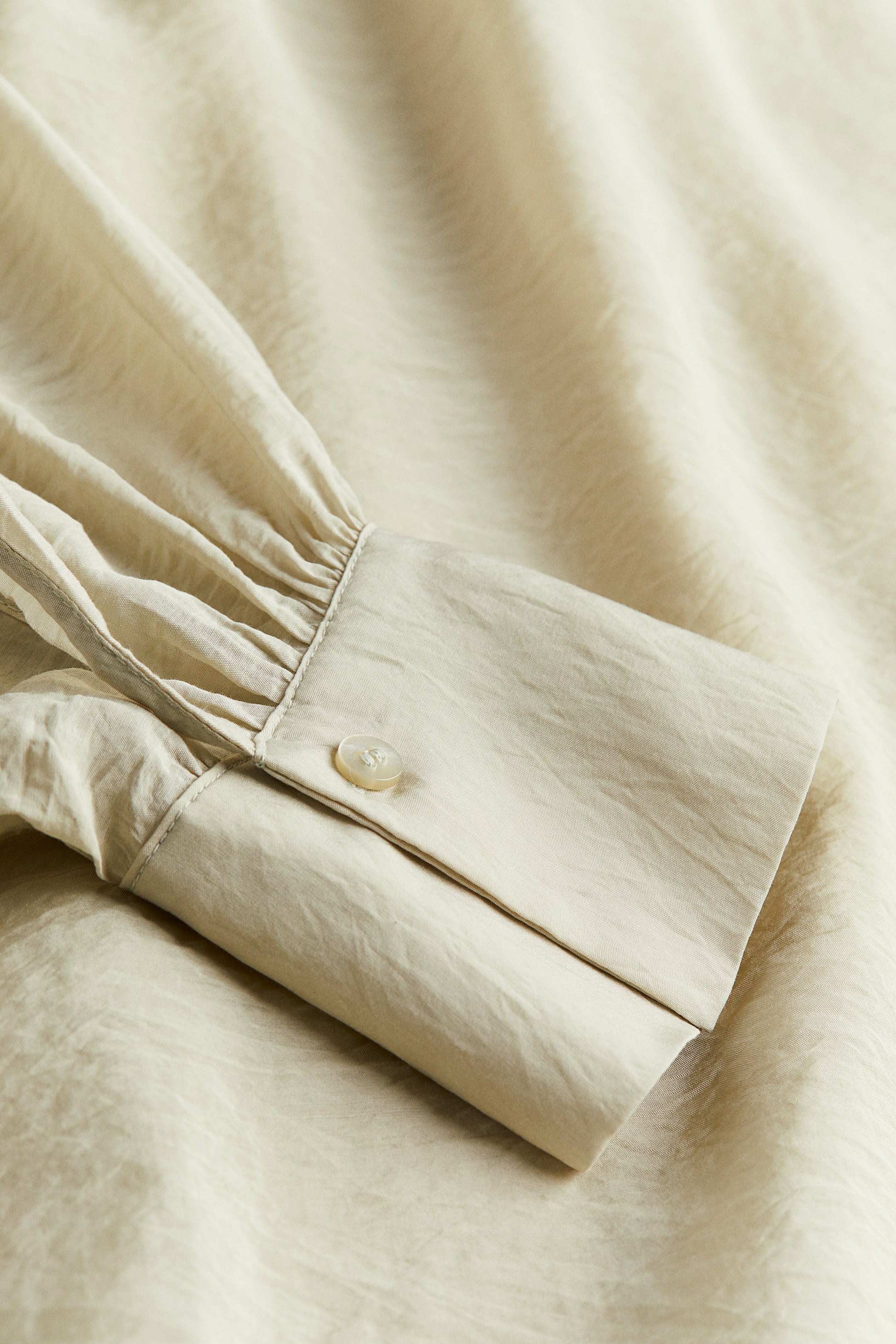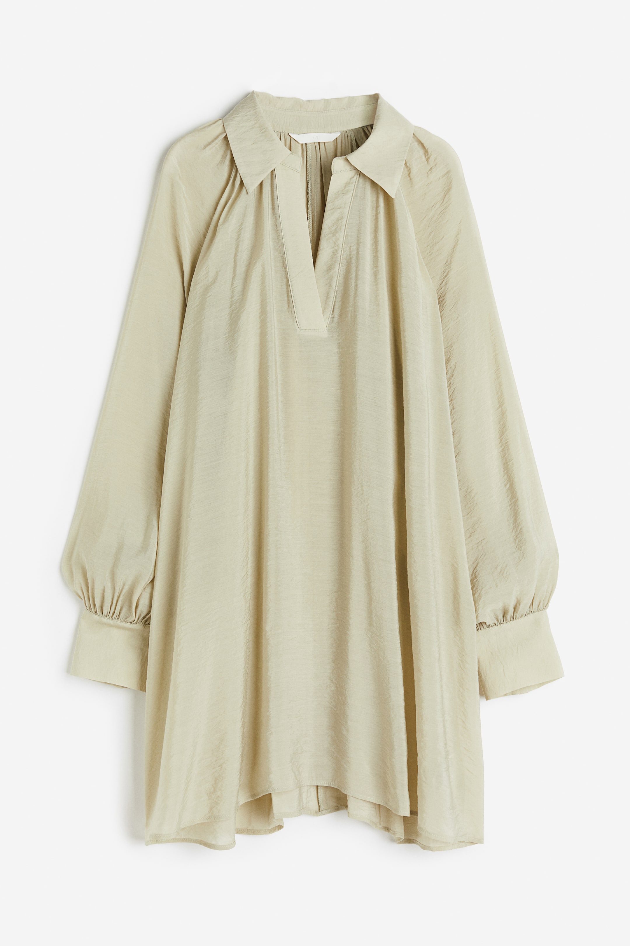 Vestido túnica corto en tejido con ligero brillo. Modelo de corte holgado con cuello camisero, escote en V y mangas globo largas de corte raglán con puños anchos abotonados. Sin forrar.
