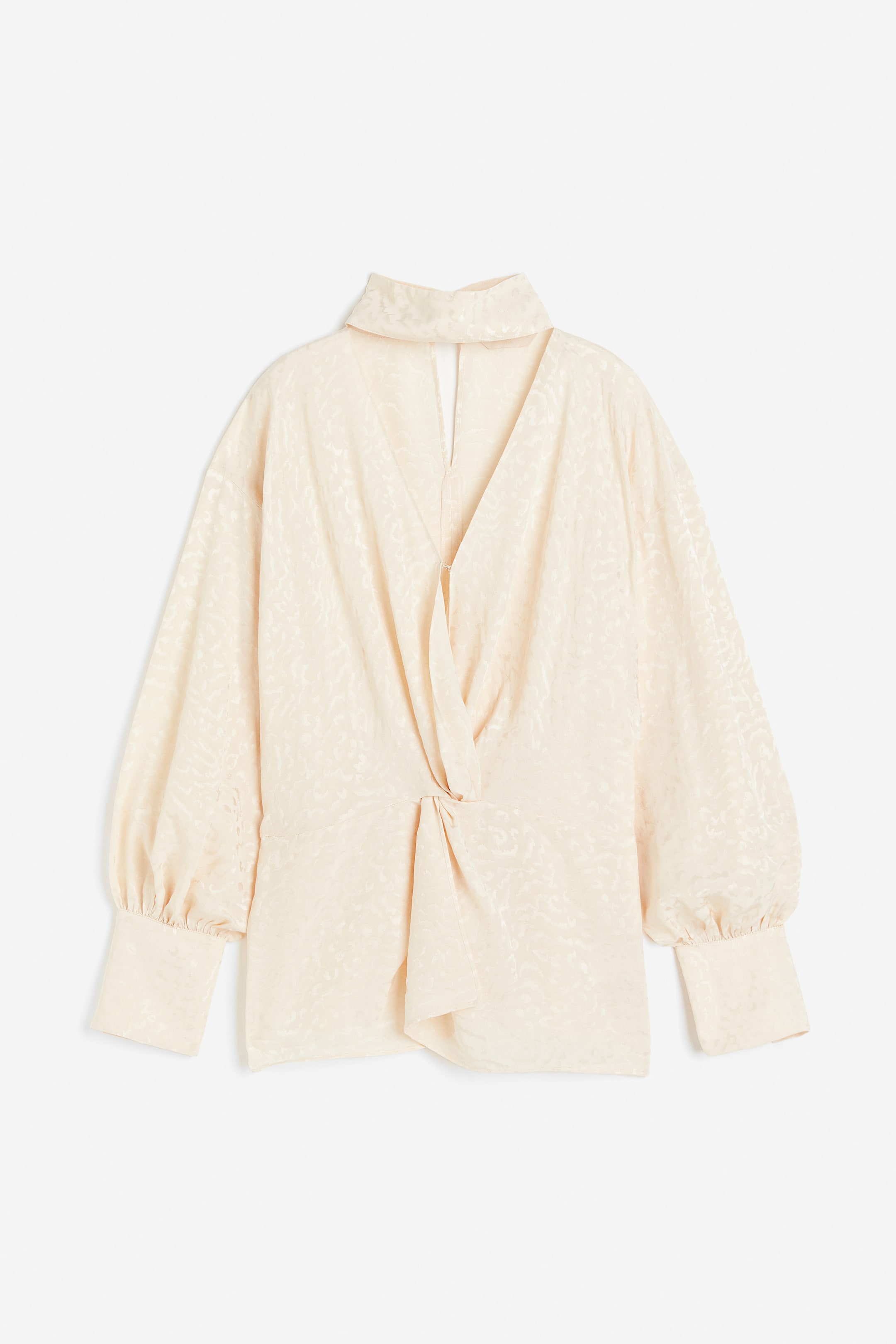Blusa de corte holgado en tejido brillante de jacquard de viscosa. Modelo con cuello elevado, botones en la nuca, escote en V profundo con cierre oculto de corchete y abertura detrás. Hombros caídos, mangas largas y puños anchos con abertura y botones revestidos. Detalle girado delante.