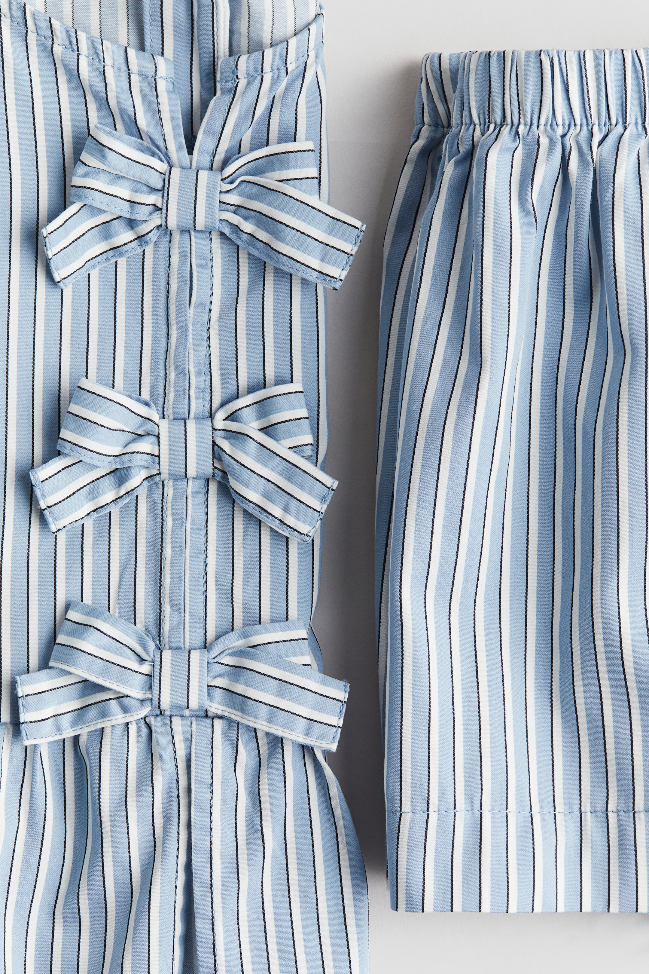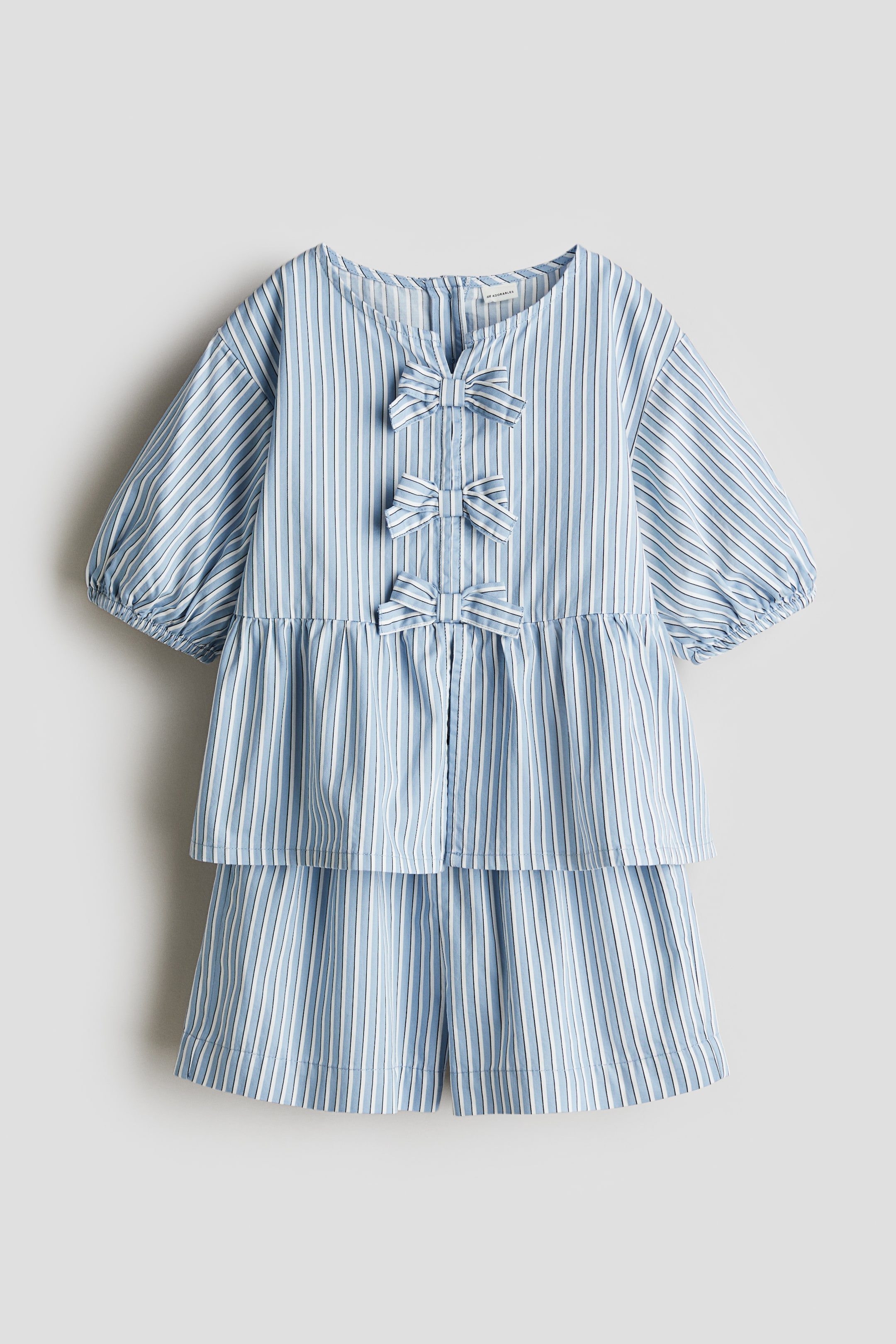 H&M Adorables. Conjunto de dos piezas en popelina vaporosa de algodón de alta calidad. Blusa de hombros caídos con cuello redondo, lazos decorativos delante, abertura con botones en la espalda y mangas abullonadas con elástico fino en los puños. Cintura con frunces y bajo con vuelo. Pantalón corto con cinturilla elástica ajustable. La colección H&M Adorables ofrece una cuidadosa selección de prendas atemporales de calidad con un confort excepcional.