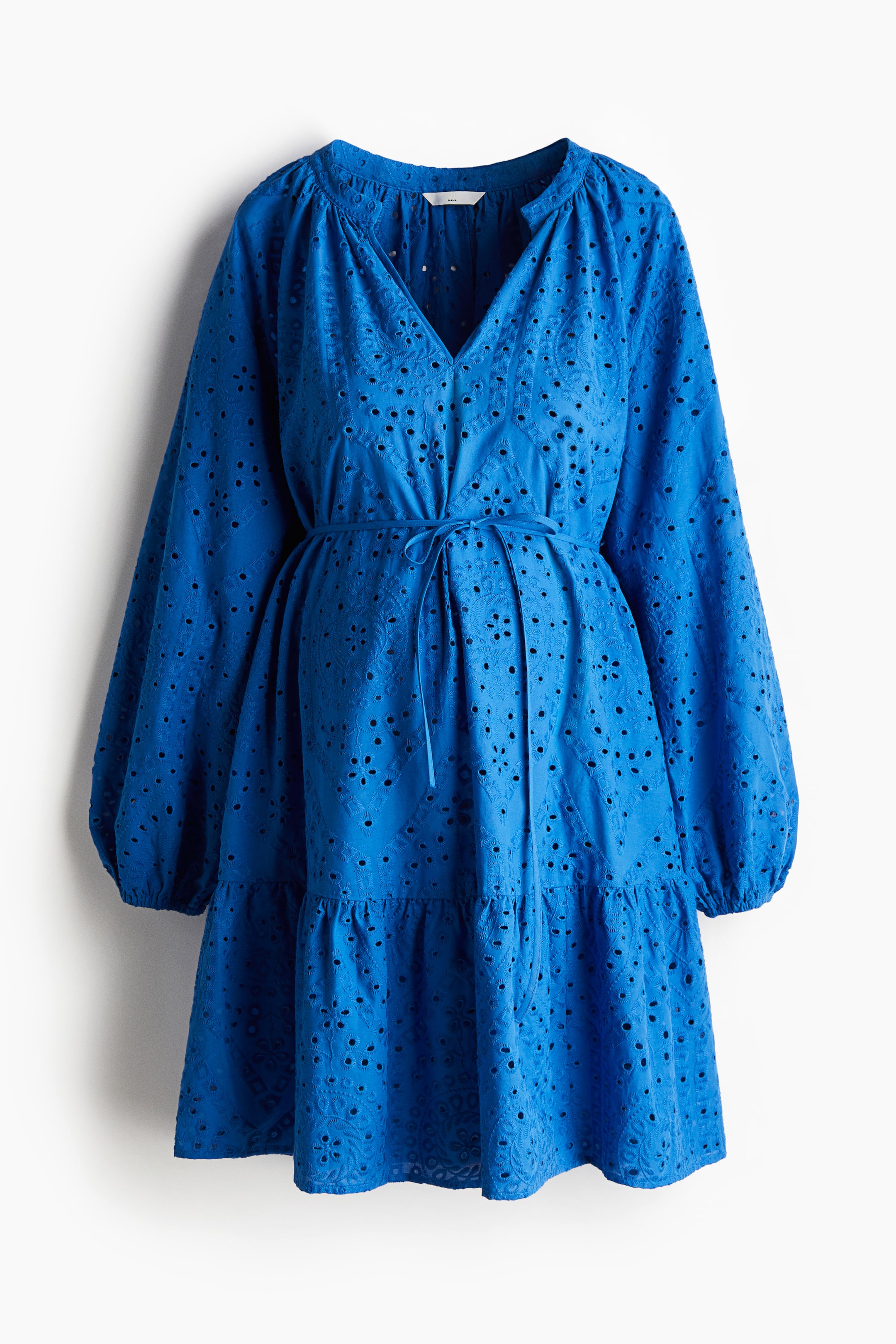 Vestido corto de algodón con cuello elevado corto, escote en V y mangas globo largas de corte raglán con elástico fino en los puños. Modelo entallado con cinturón de anudar fino de quita y pon, y costura fruncida en el bajo para dar un toque de volumen. Corte holgado. Sin forrar.