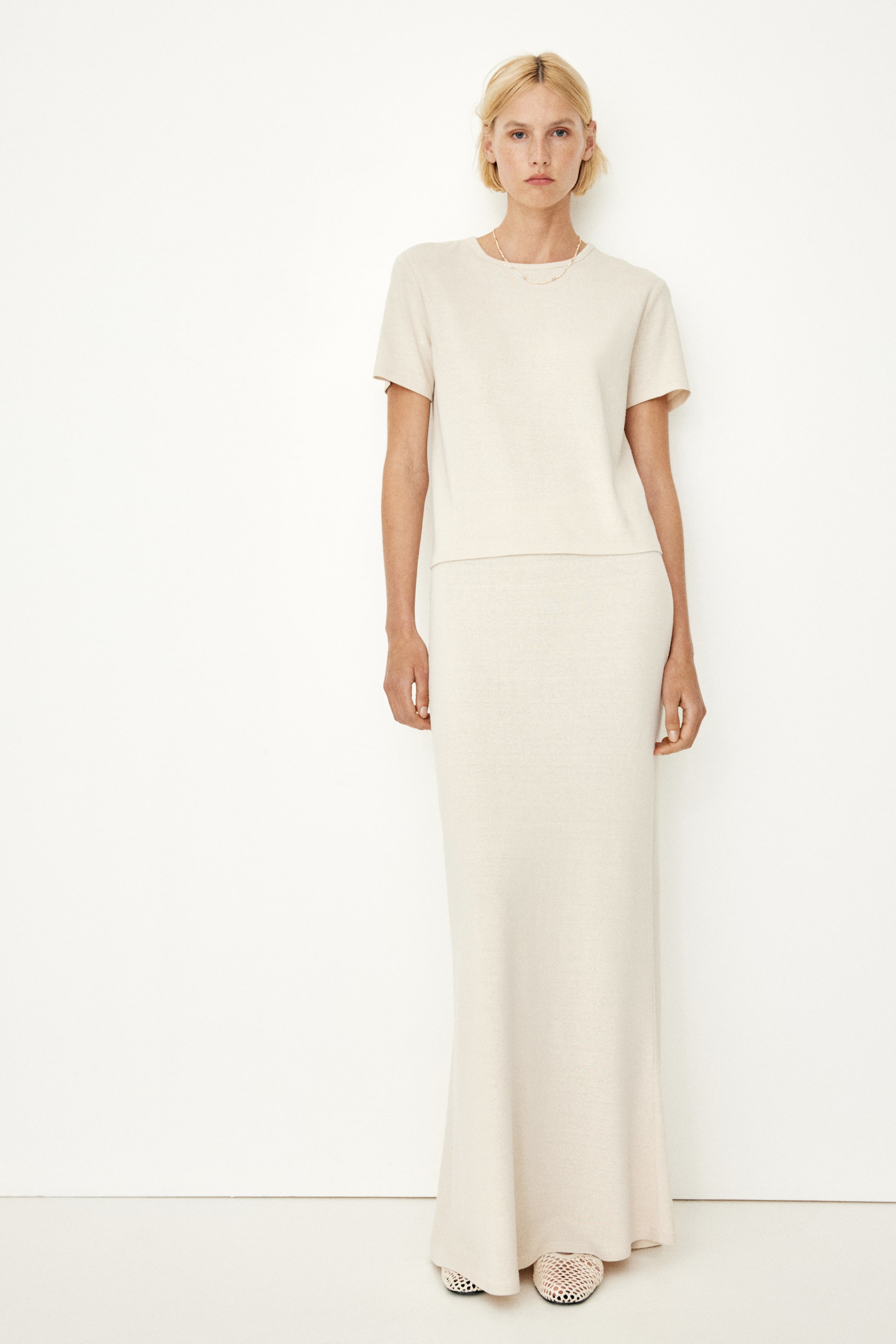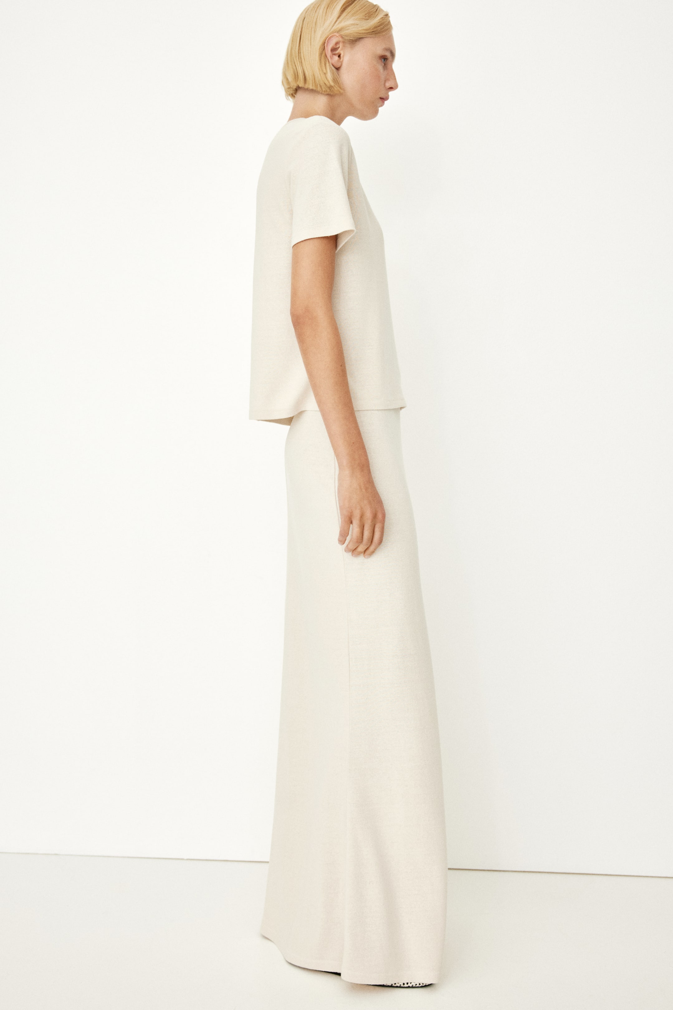 Maxifalda en punto texturizado de mezcla de algodón y seda de morera. Elástico revestido en la cintura y costura visible detrás.