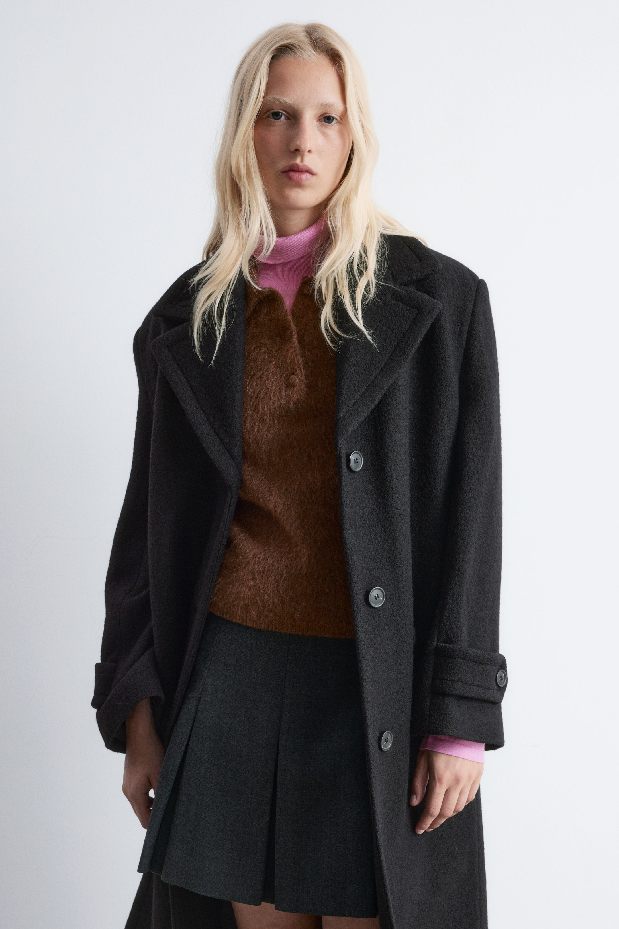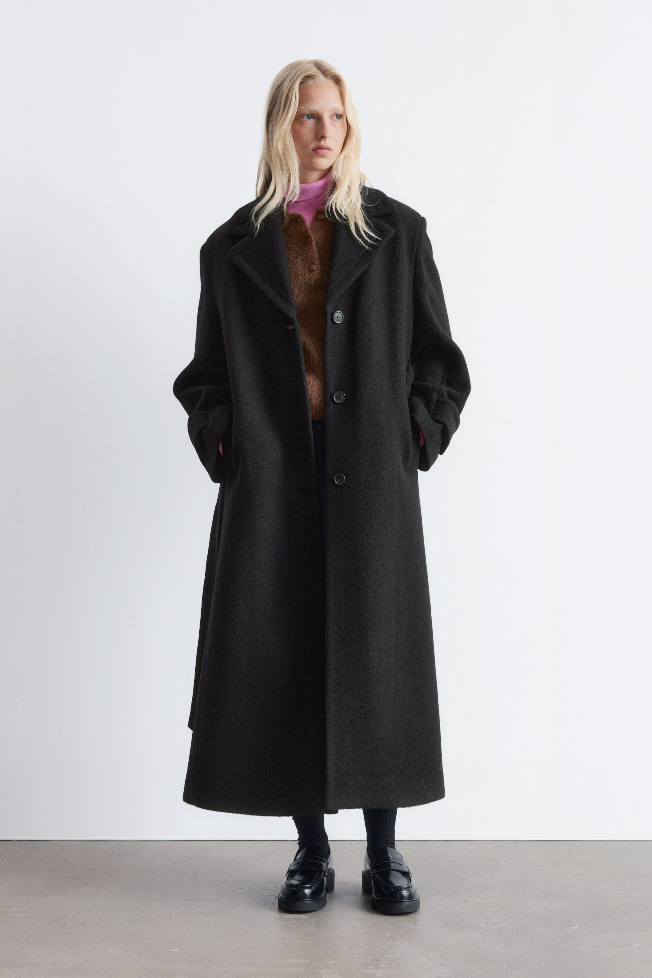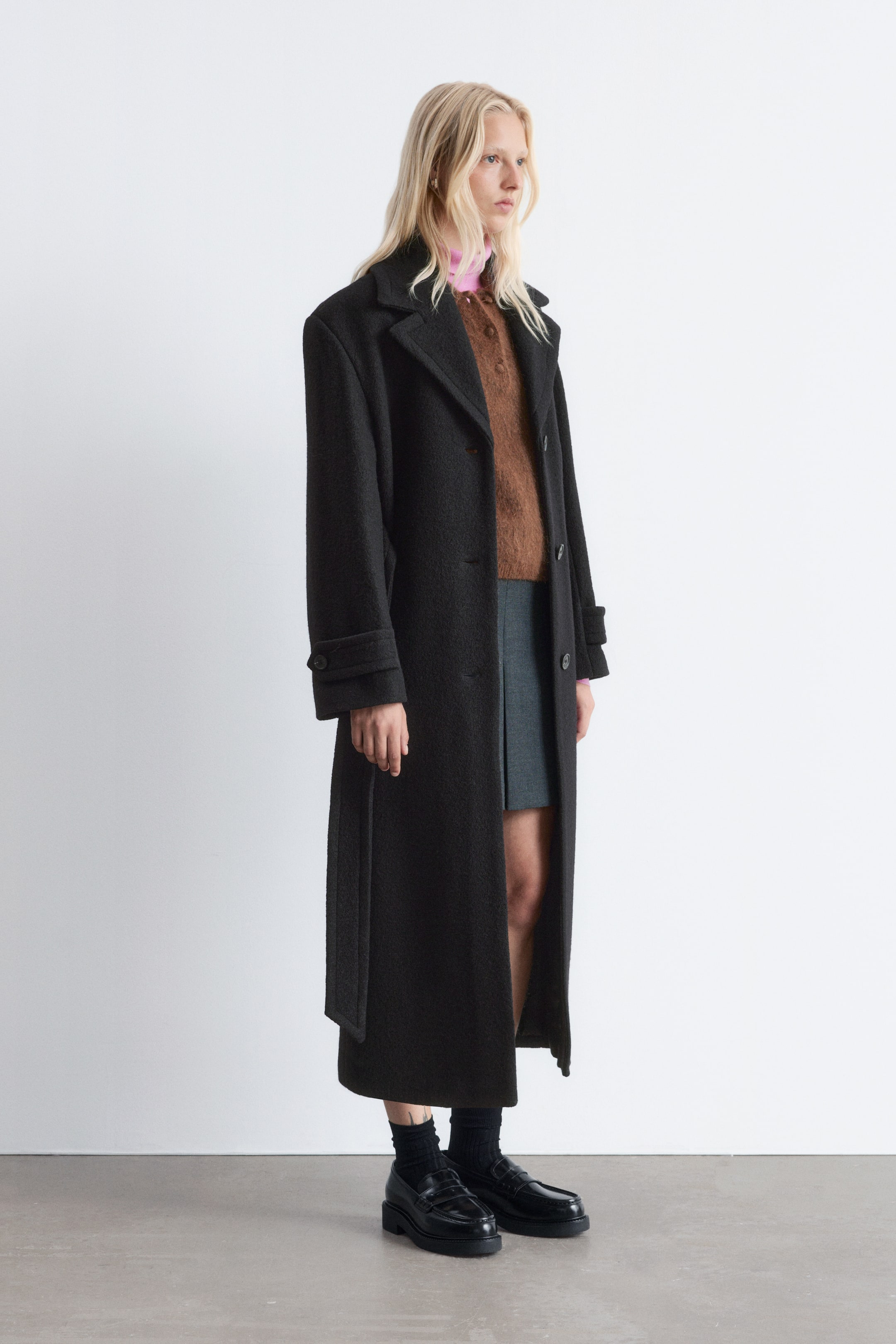 Abrigo largo confeccionado al 100% en lana de primera calidad. De cuello ancho, tiene hombros estructurados y un cinturón de lazo que permite definir la cintura. Se completa con dos bolsillos insertados delanteros, puños abotonados con trabillas y cierre frontal de tres botones. Con forro total Bolsillo interior Trabillas para cinturón 100% lana RWS TE-00047206 Largo del abrigo: 123,7 cm/48,7" (talla S)