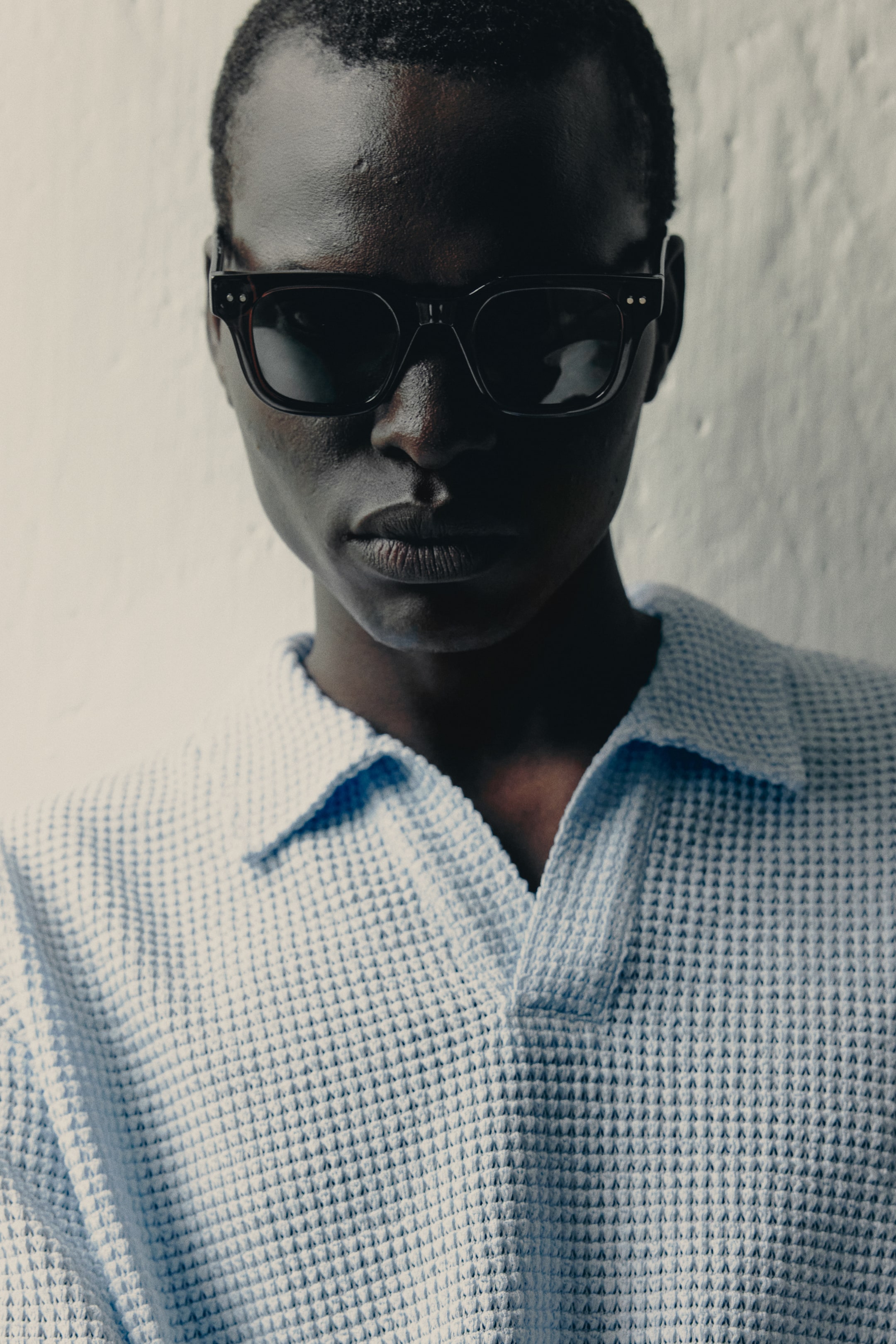 Polo de manga corta en punto gofrado suave. Modelo con cuello, abertura en V delante y bajo recto. Corte holgado para una silueta amplia pero no oversize.