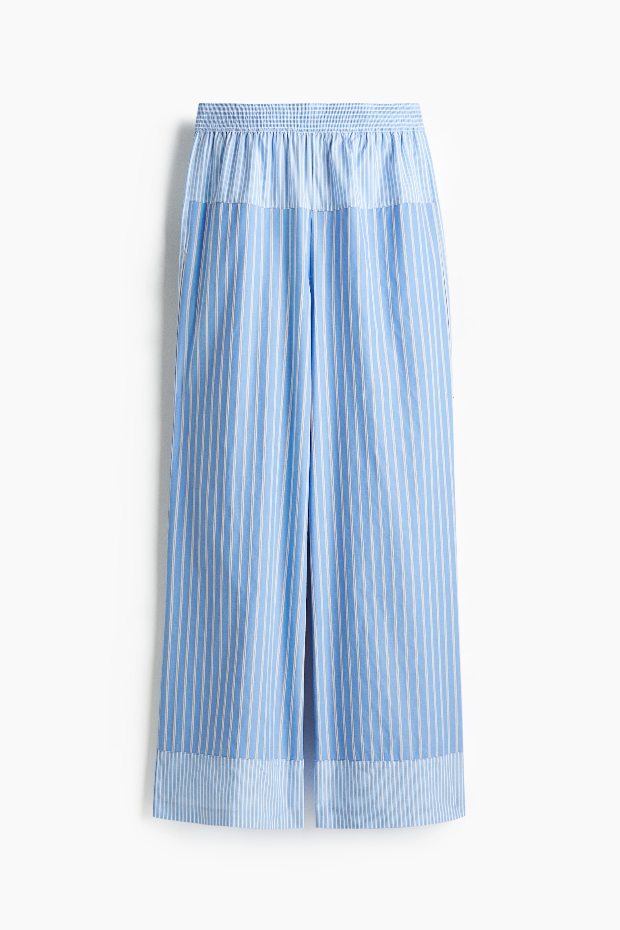 Pantalón de corte holgado en tejido fresco de algodón con secciones a contraste delante y detrás para un efecto de color en bloque. Modelo de talle alto con elástico fruncido en la cintura, bolsillos laterales discretos y perneras rectas.