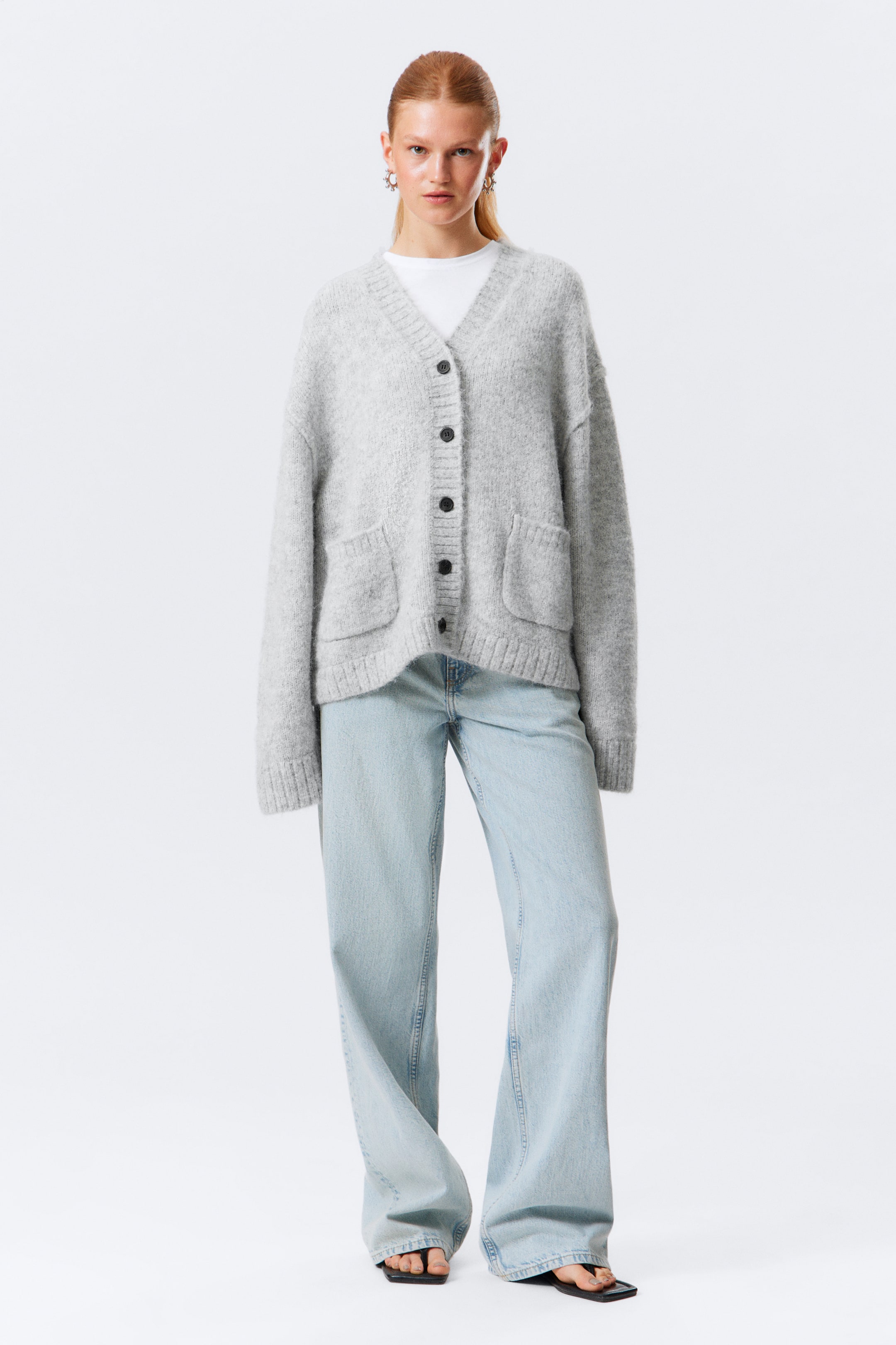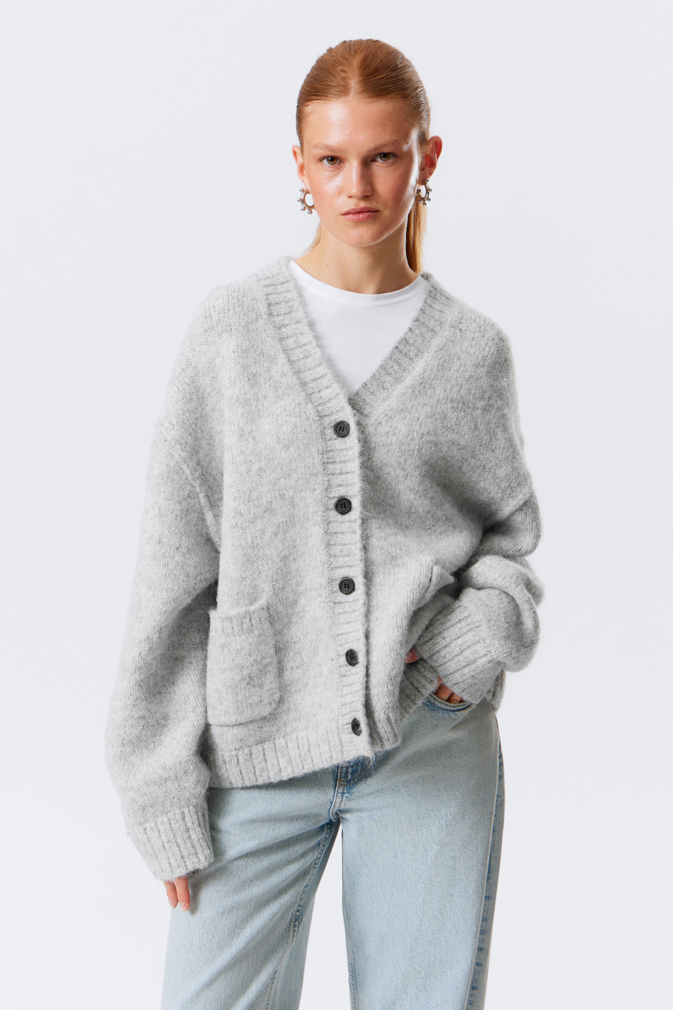 Un cárdigan abotonado de silueta relajada. Presenta un pronunciado escote en pico, hombros caídos y bolsillos de parche con las esquinas redondeadas. Diseñado con acabados de canalé y una textura de punto liso.