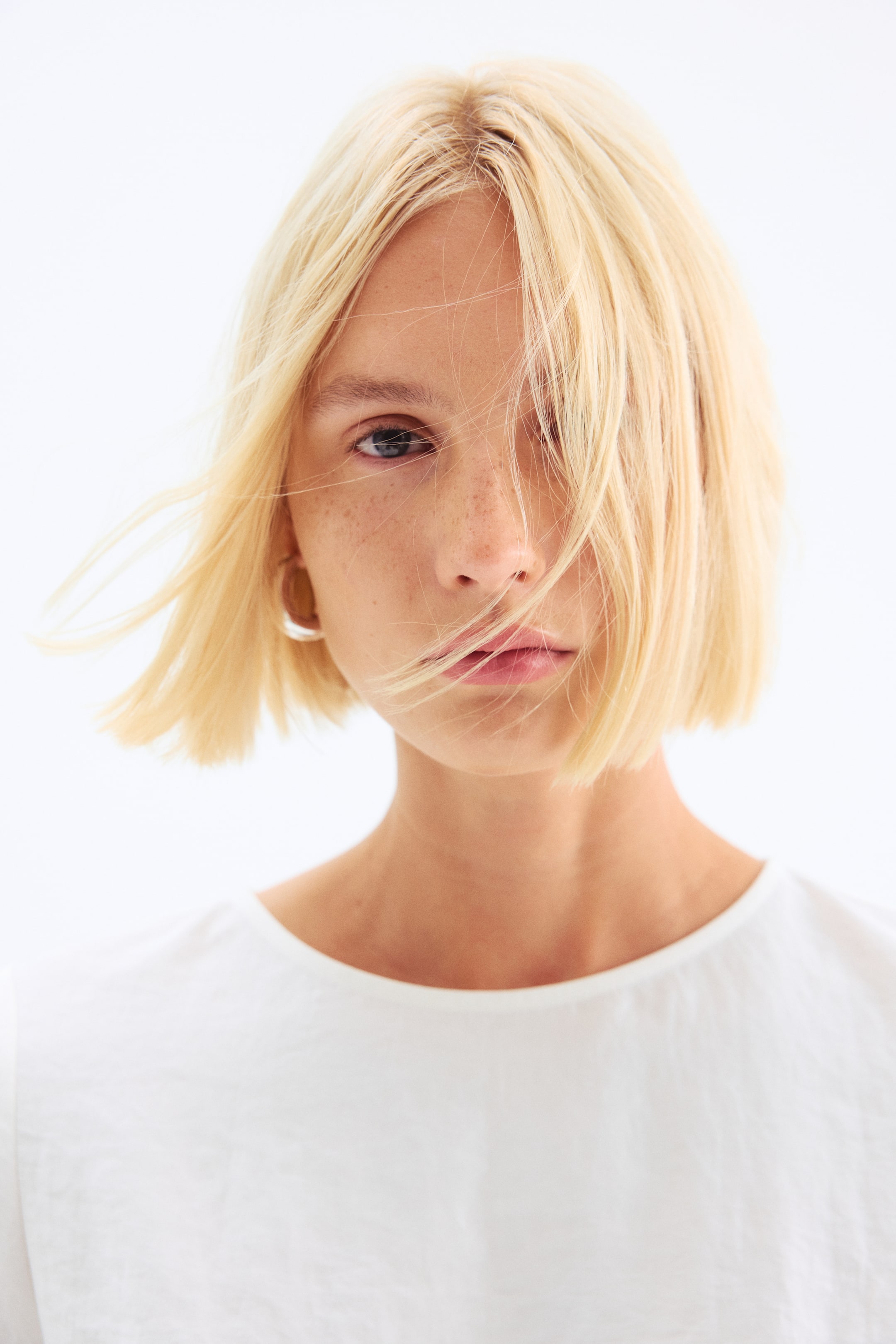 Blusa de sarga con cuello redondo. Modelo de manga corta con cremallera oculta en la espalda y pliegues en la cintura para una silueta entallada.