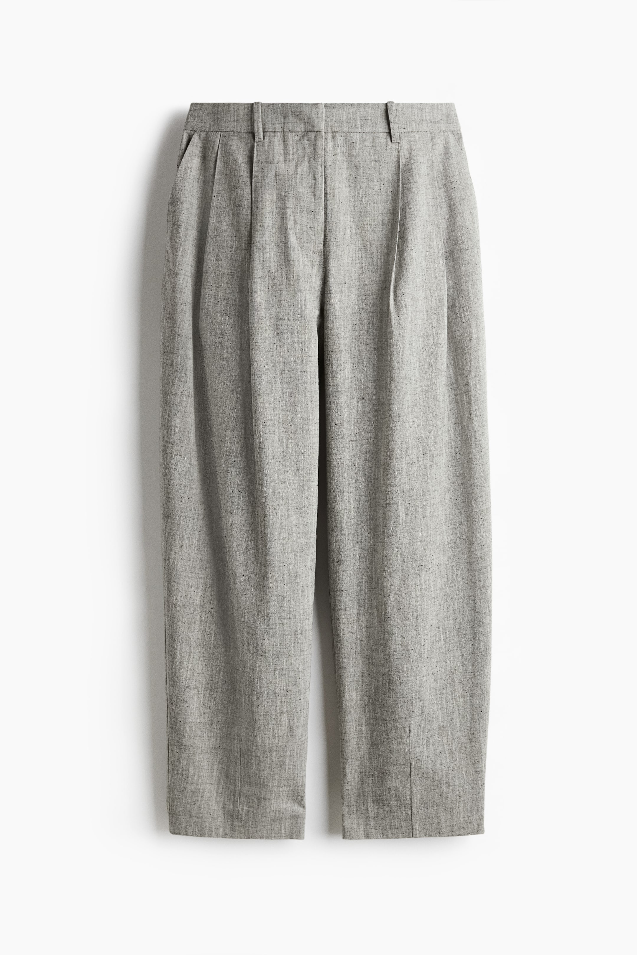 Pantalón sastre tobillero en mezcla de lino. Perneras globo con pinzas delante, cierre de cremallera con botón y corchete ocultos, bolsillos al bies y bolsillo trasero insertado con botón.