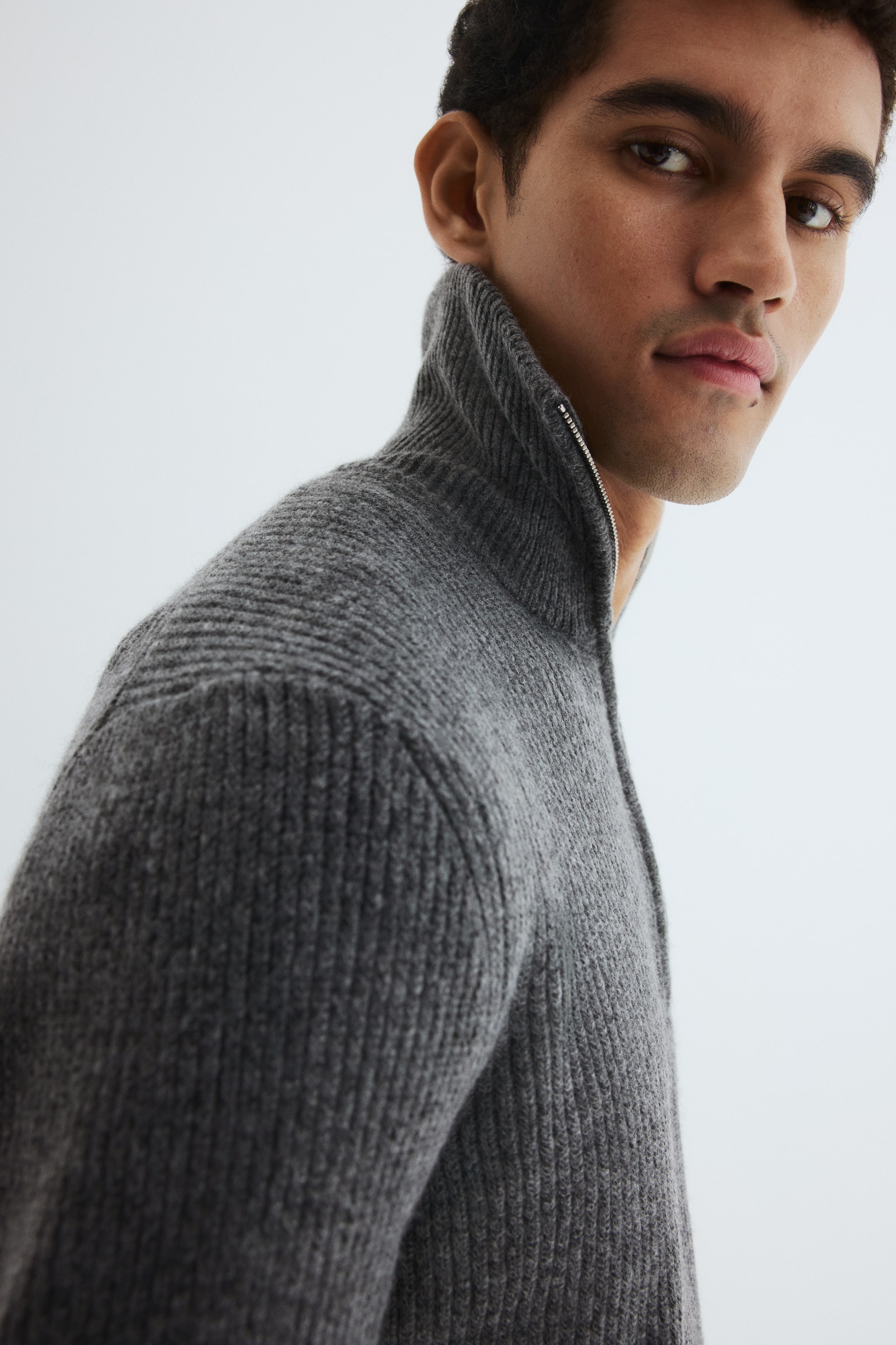 Jersey en punto suave de canalé con cuello elevado y media cremallera. Bajo recto. Remate en canalé de raya fina en cuello, puños y bajo. Corte estándar para una silueta clásica y cómoda.
