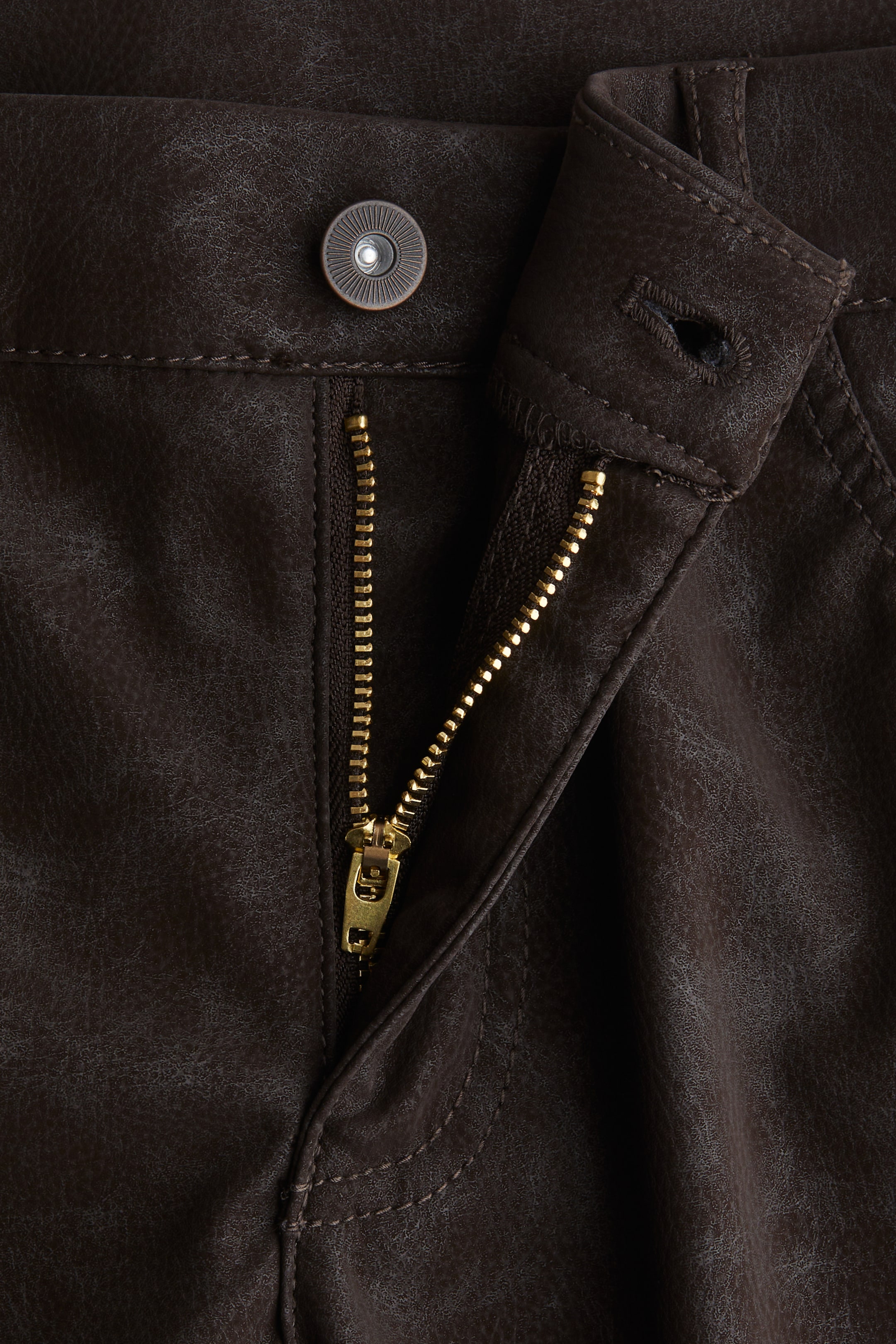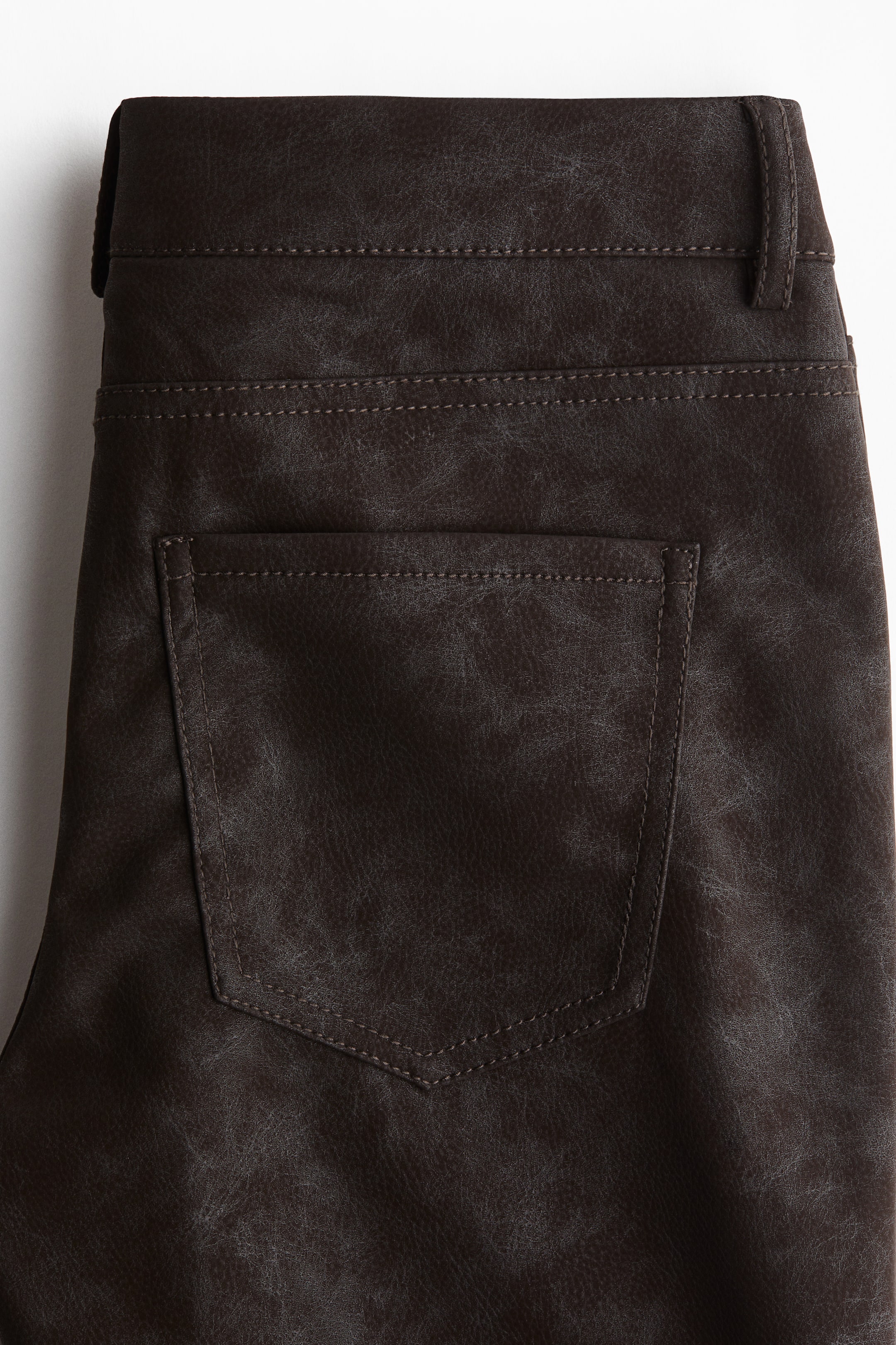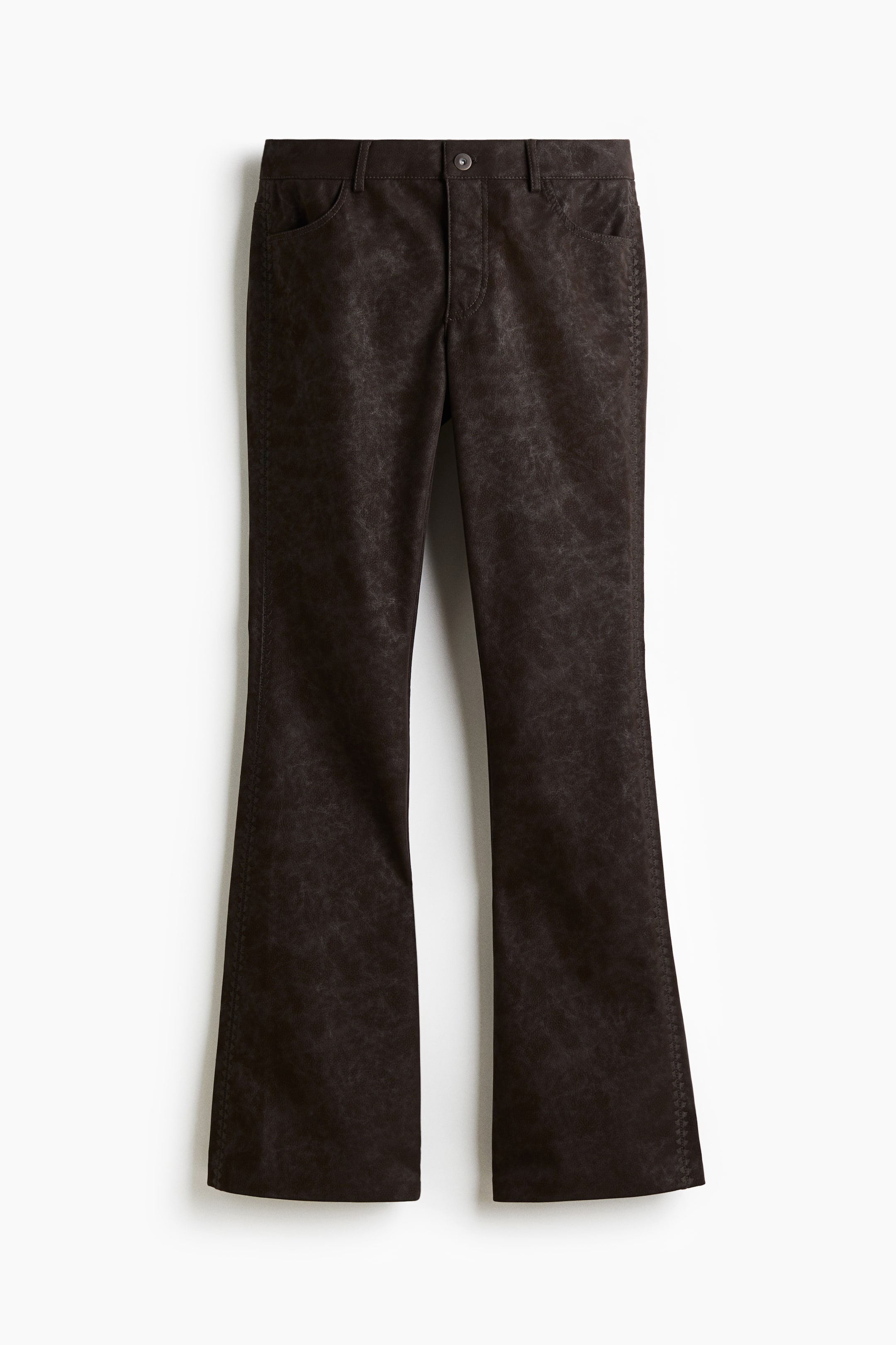 Pantalón en tejido revestido con acabado desgastado. Modelo de cintura estándar con cierre de cremallera y botón, bolsillos delante y detrás, y costuras laterales bordadas. Corte ajustado con perneras acampanadas.