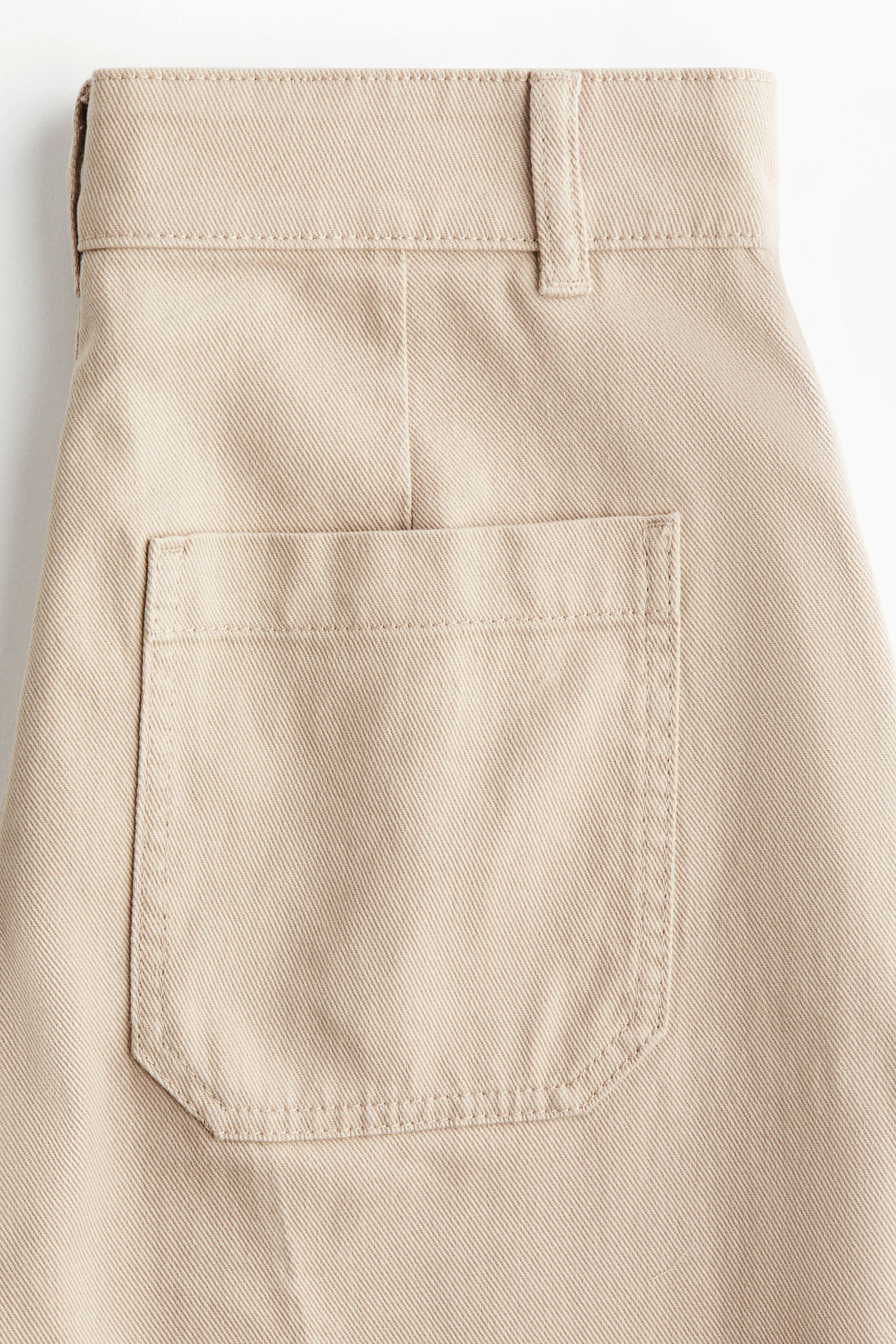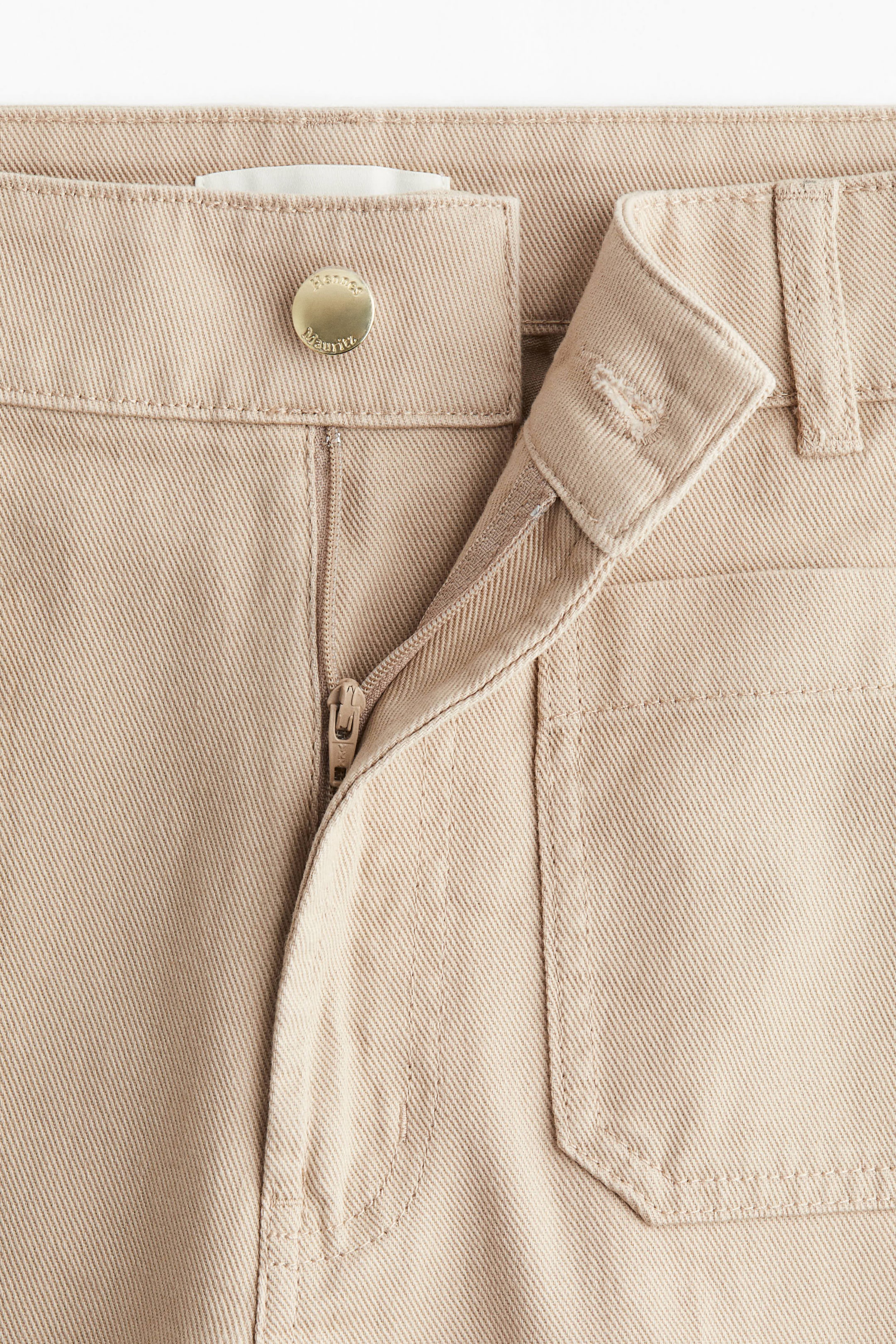 Pantalón en sarga de algodón con cintura de talle alto y cierre de cremallera con botón. Perneras amplias con raya delante y detrás, y bolsillos delanteros y traseros de parche.