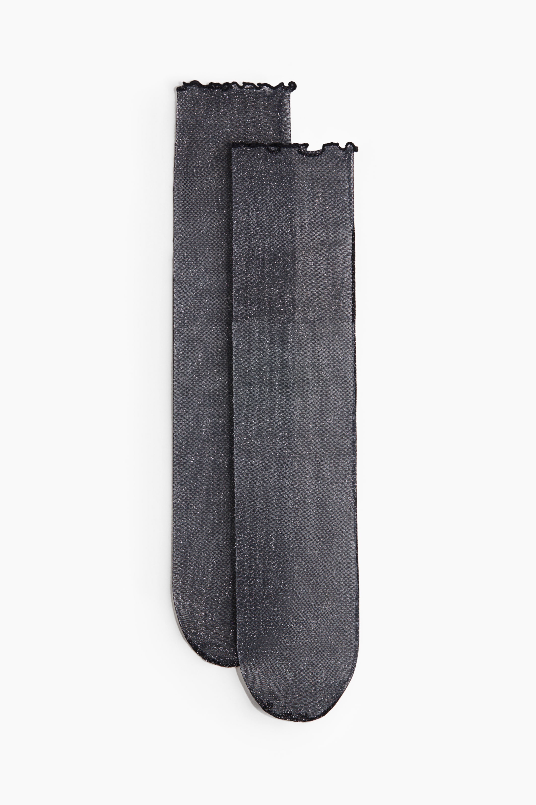Calcetines en malla transparente con hilos brillantes en la trama. Borde superior sobrehilado.