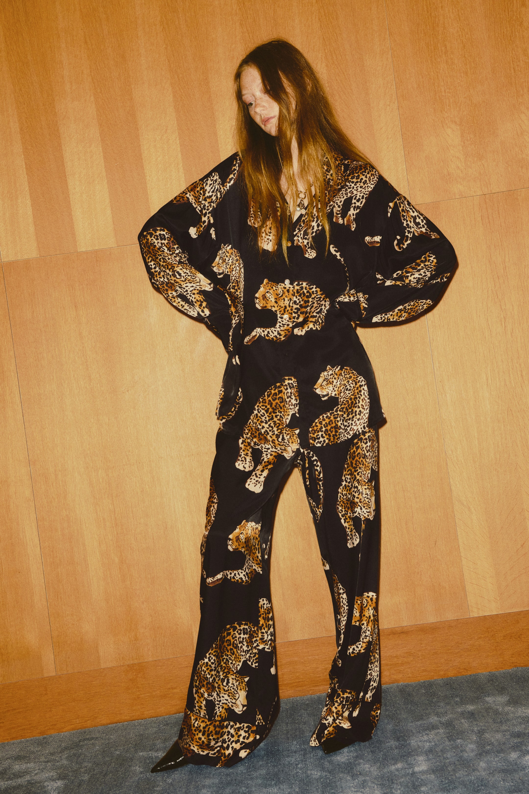 Camisa oversize en tejido fluido de satén de viscosa con cuello y botonadura frontal. Modelo de manga larga con hombros caídos y puños anchos con ribete fino. Bajo recto con aberturas laterales.