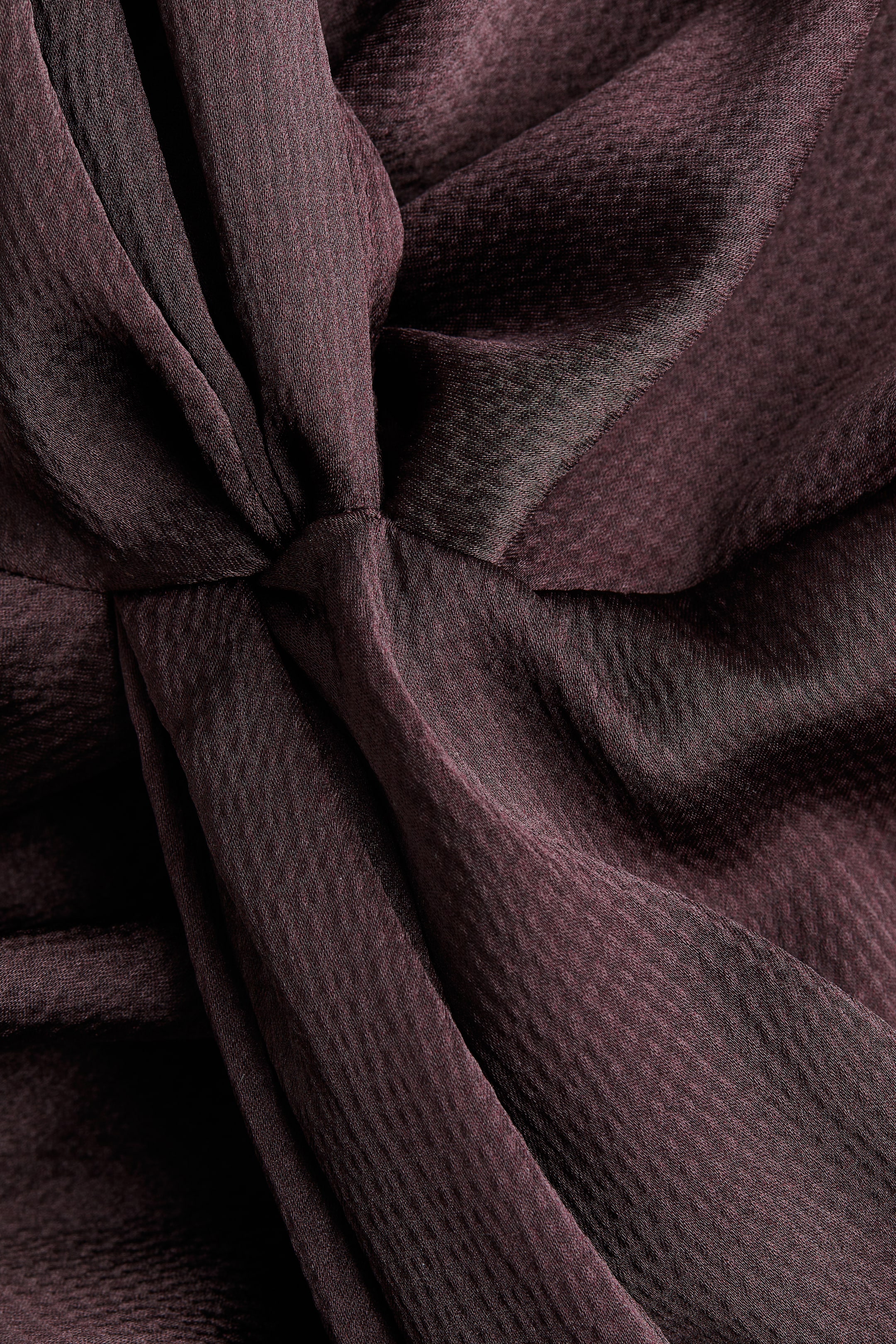 Calf-length, fitted dress in a textured weave with a slight sheen. Deep V-neckline and a twisted section at the waist for a gently draped effect. Short sleeves and a concealed zip and hook-and-eye fastener at the back. Unlined.