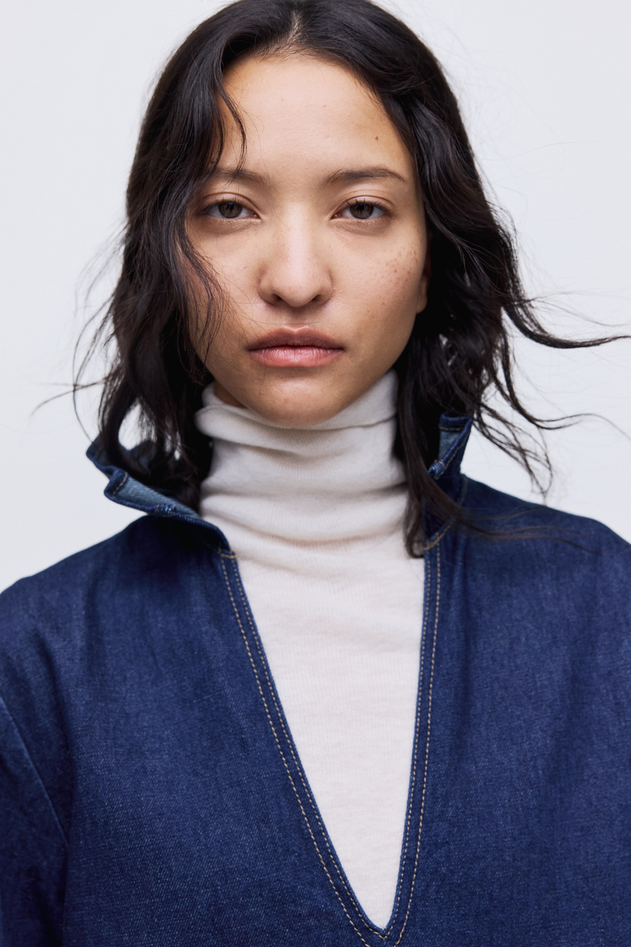 Vestido corto de manga larga en denim de algodón rígido. Modelo de hombros ligeramente caídos con cuello elevado de volante, abertura de pico y puños con pliegues y ribete fino. Bajo ligeramente redondeado.