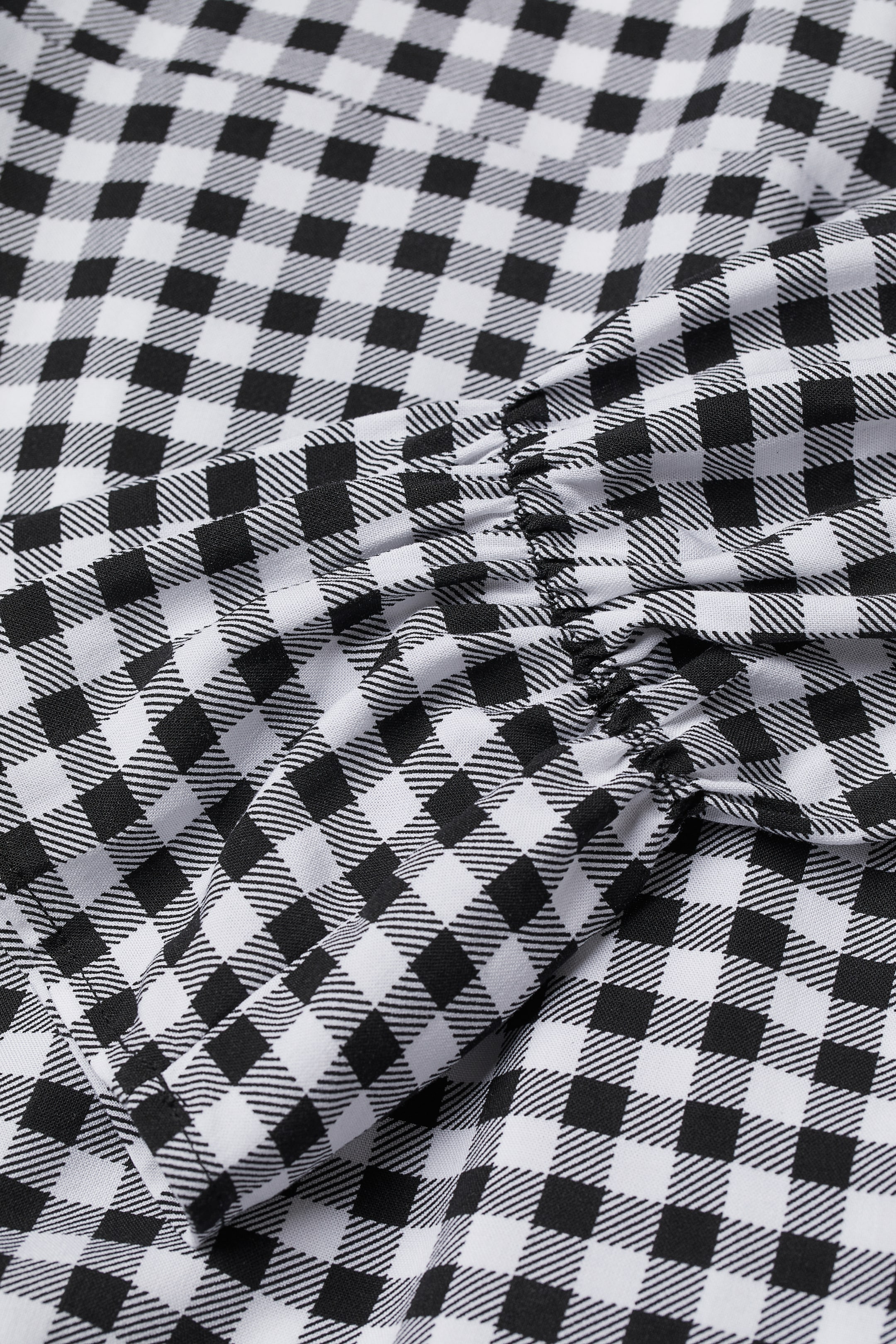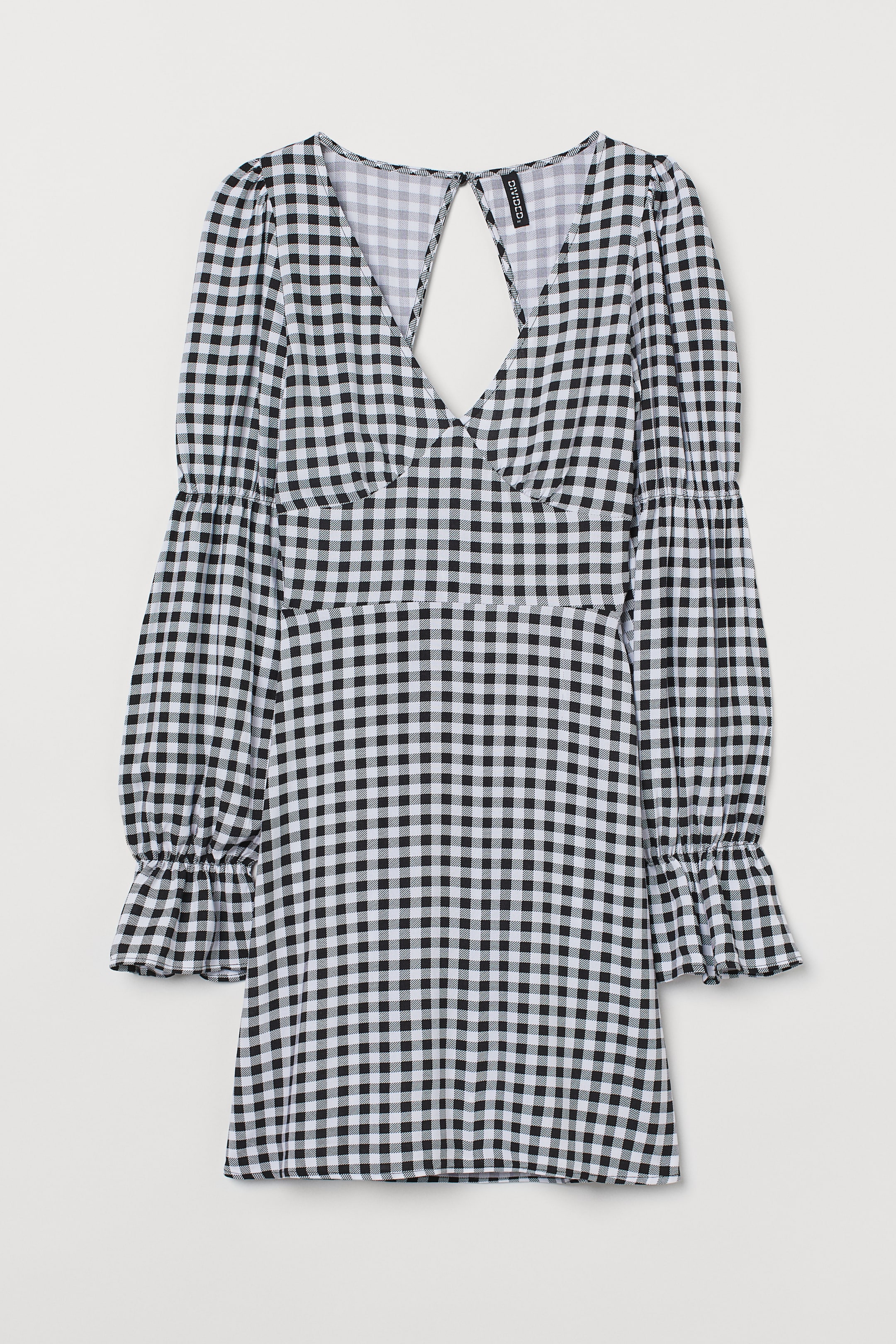 Vestido corto en tejido de viscosa con diseño estampado. Modelo con escote en V pronunciado, abertura con lazos en la espalda y botón pequeño en la nuca. Costura debajo del busto para crear una silueta entallada, y mangas largas y anchas con elástico forrado para mayor volumen. Sin forro.