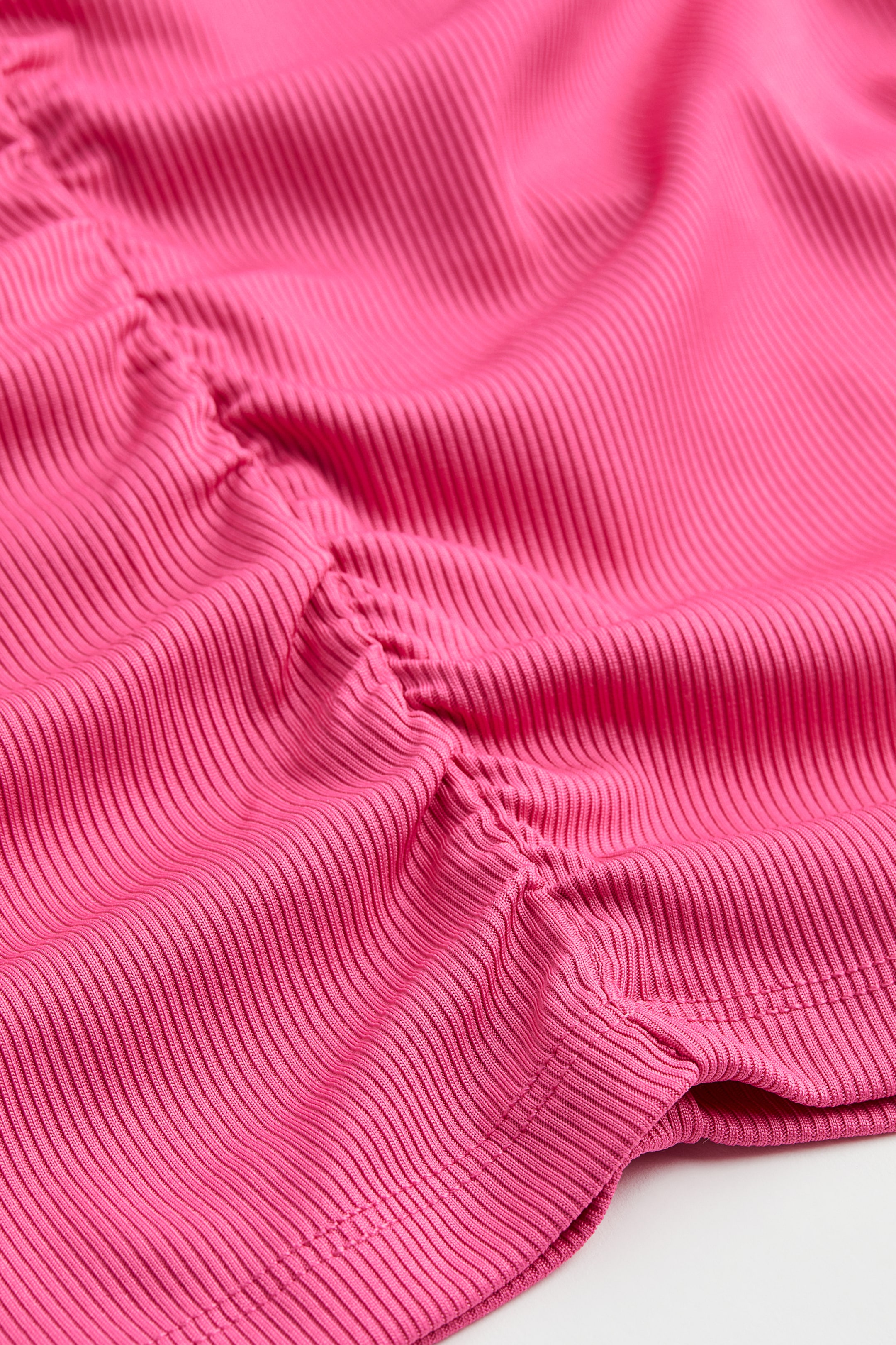 Vestido corto en punto acanalado. Modelo entallado con cuello redondo y mangas cortas. Costuras verticales con elástico oculto para un efecto drapeado. Sin forro.