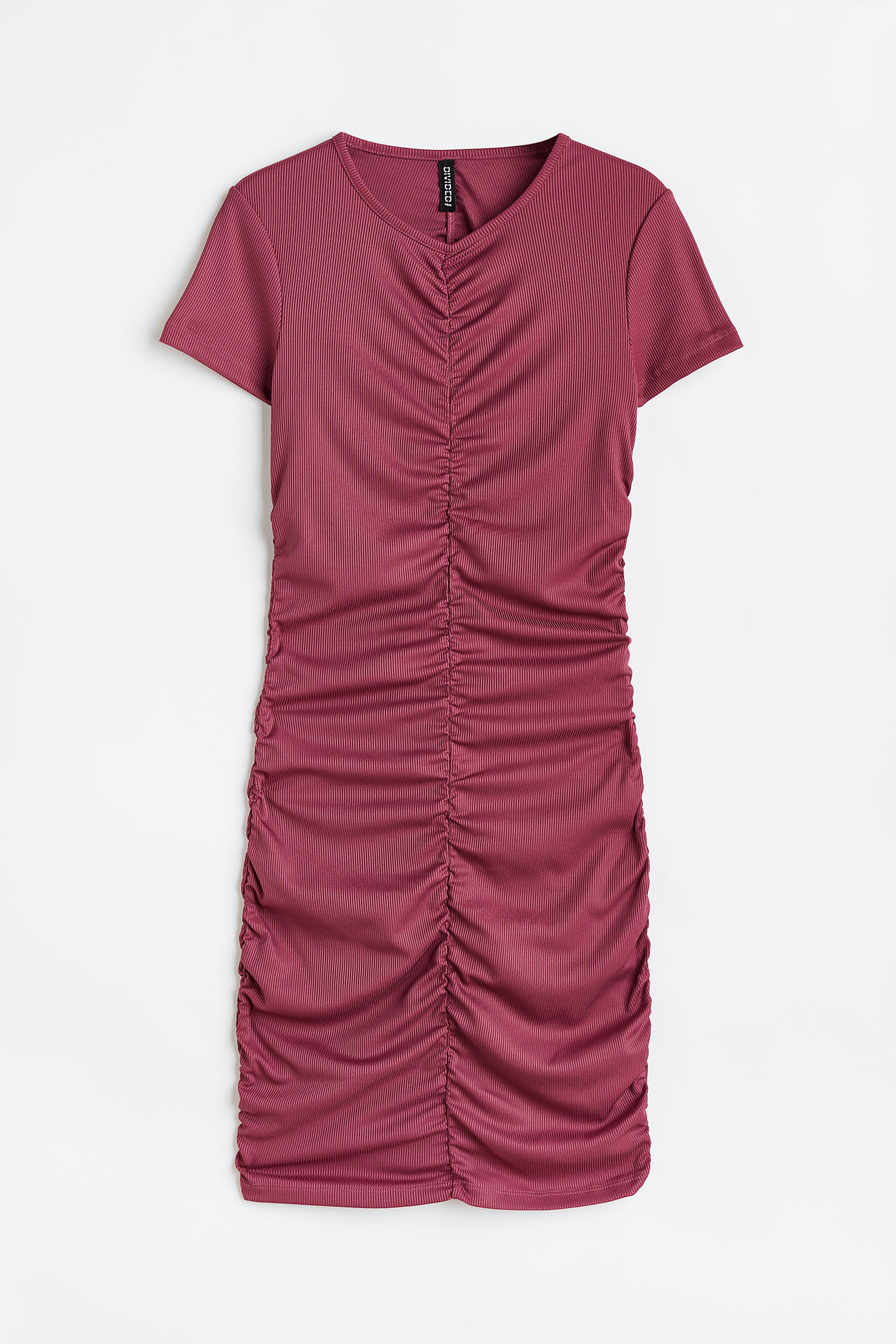 Vestido corto en punto acanalado. Modelo entallado con cuello redondo y mangas cortas. Costuras verticales con elástico oculto para un efecto drapeado. Sin forro.