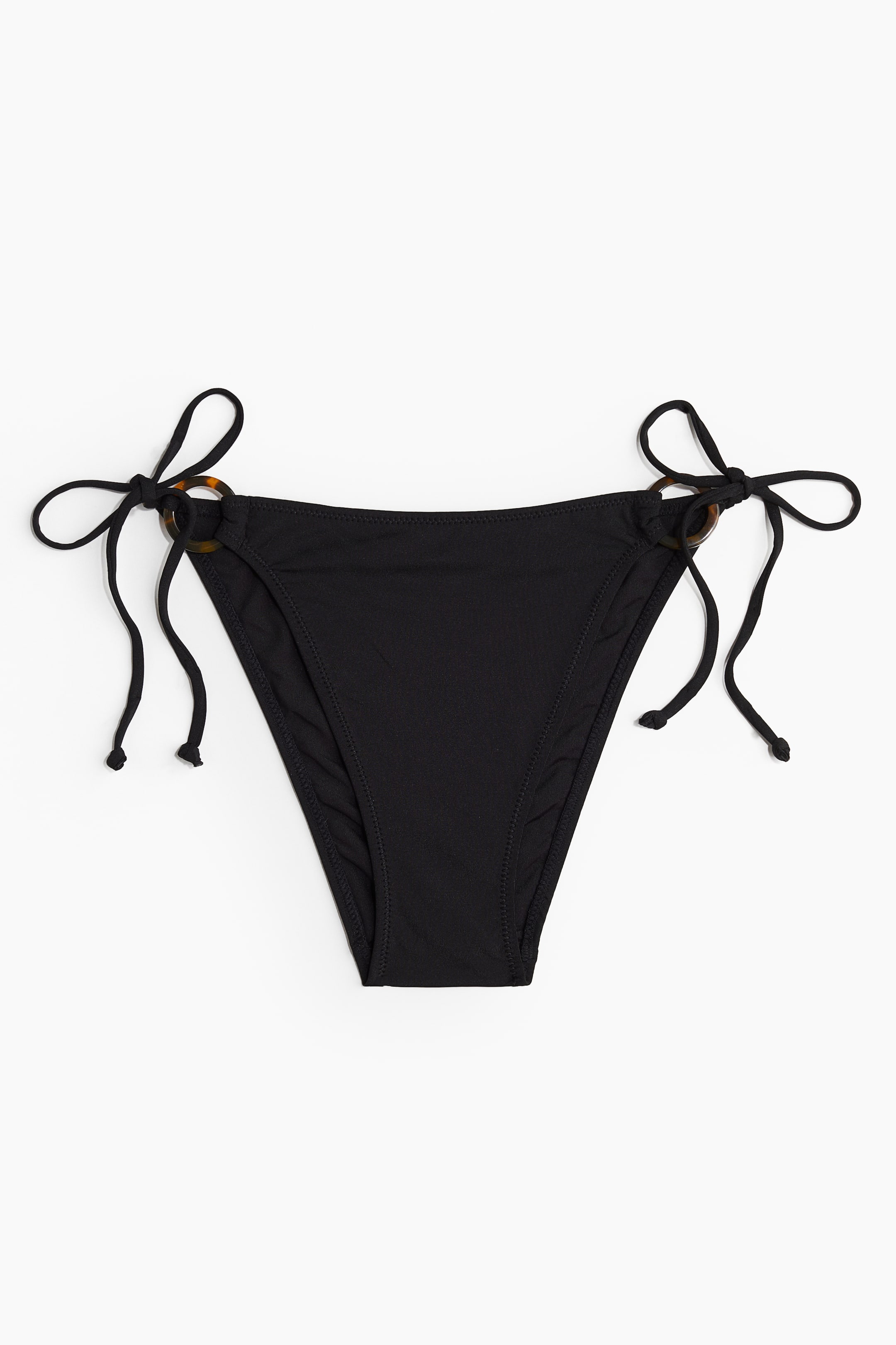 Bragas de bikini completamente forradas. Modelo de talle medio con anillos decorativos en los laterales del frente. Lazos en los laterales y parte posterior semicubierta.