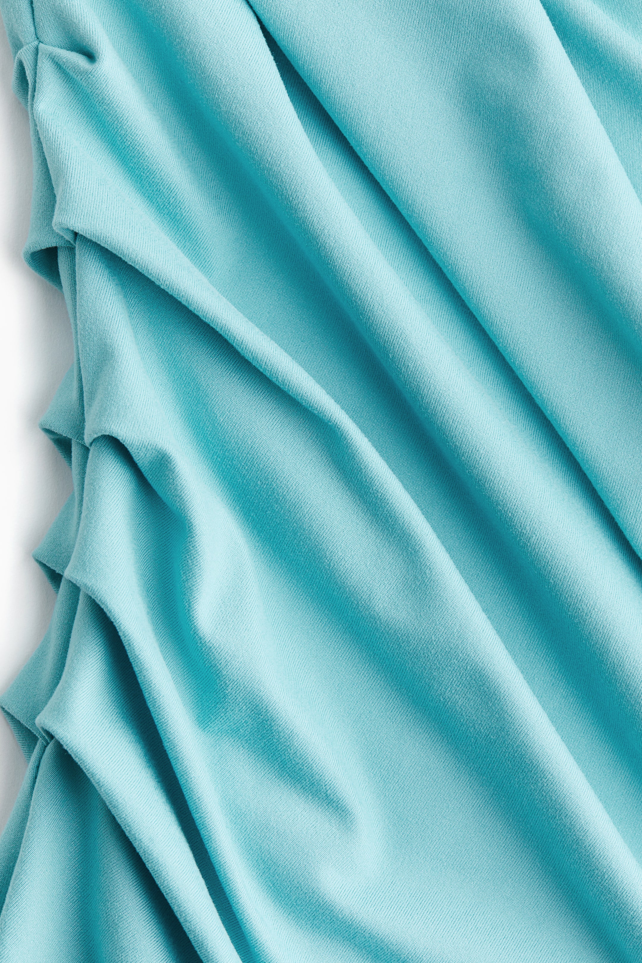 Vestido corto en punto stretch. Modelo entallado con cuello cisne y mangas cortas. Pliegues en uno de los hombros y en un lateral para crear un efecto drapeado.