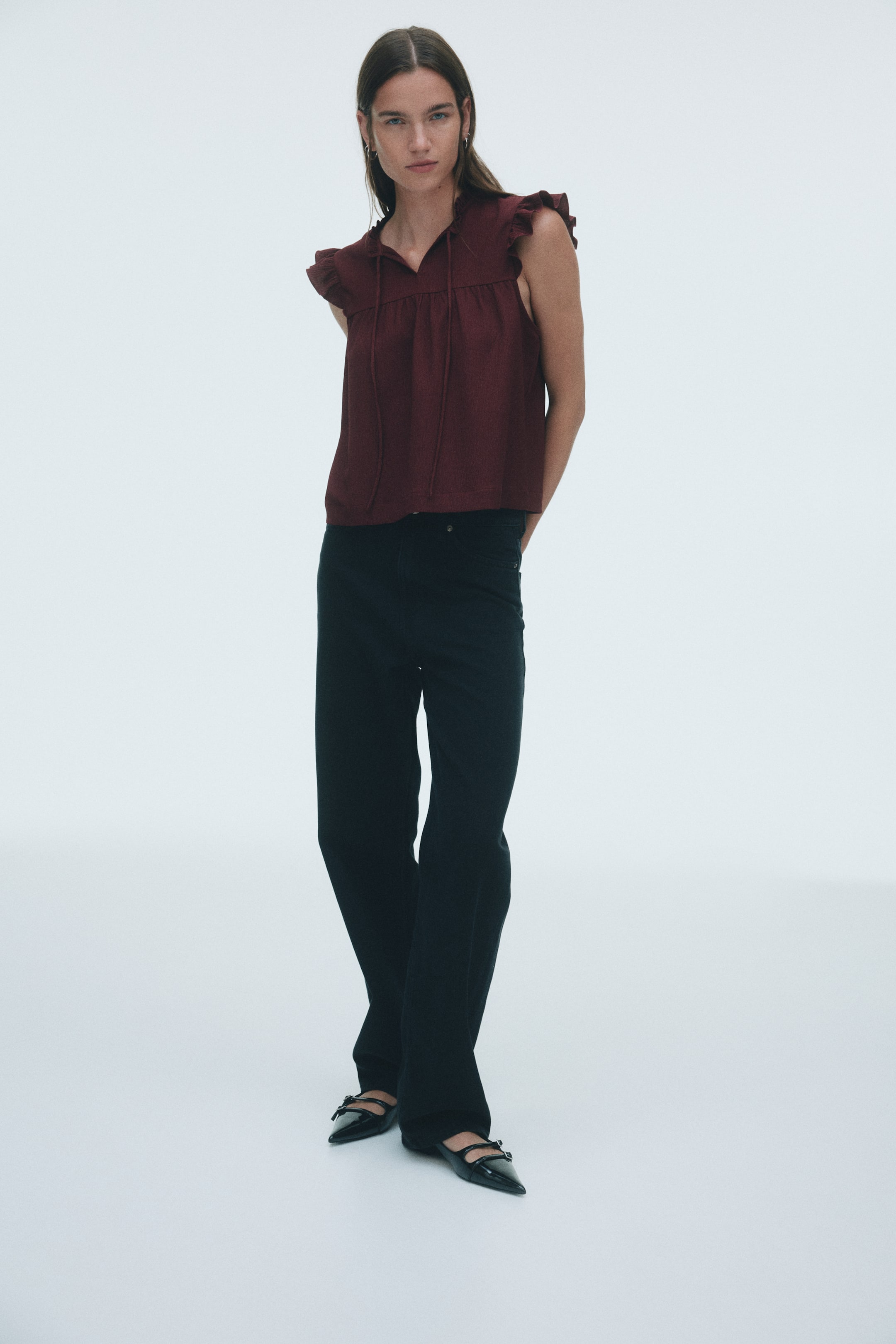 Top con mangas mariposa en punto corrugado. Cuello redondo con borde de olán y abertura con lazos estrechos al frente. Canesú fruncido al frente y en la espalda.