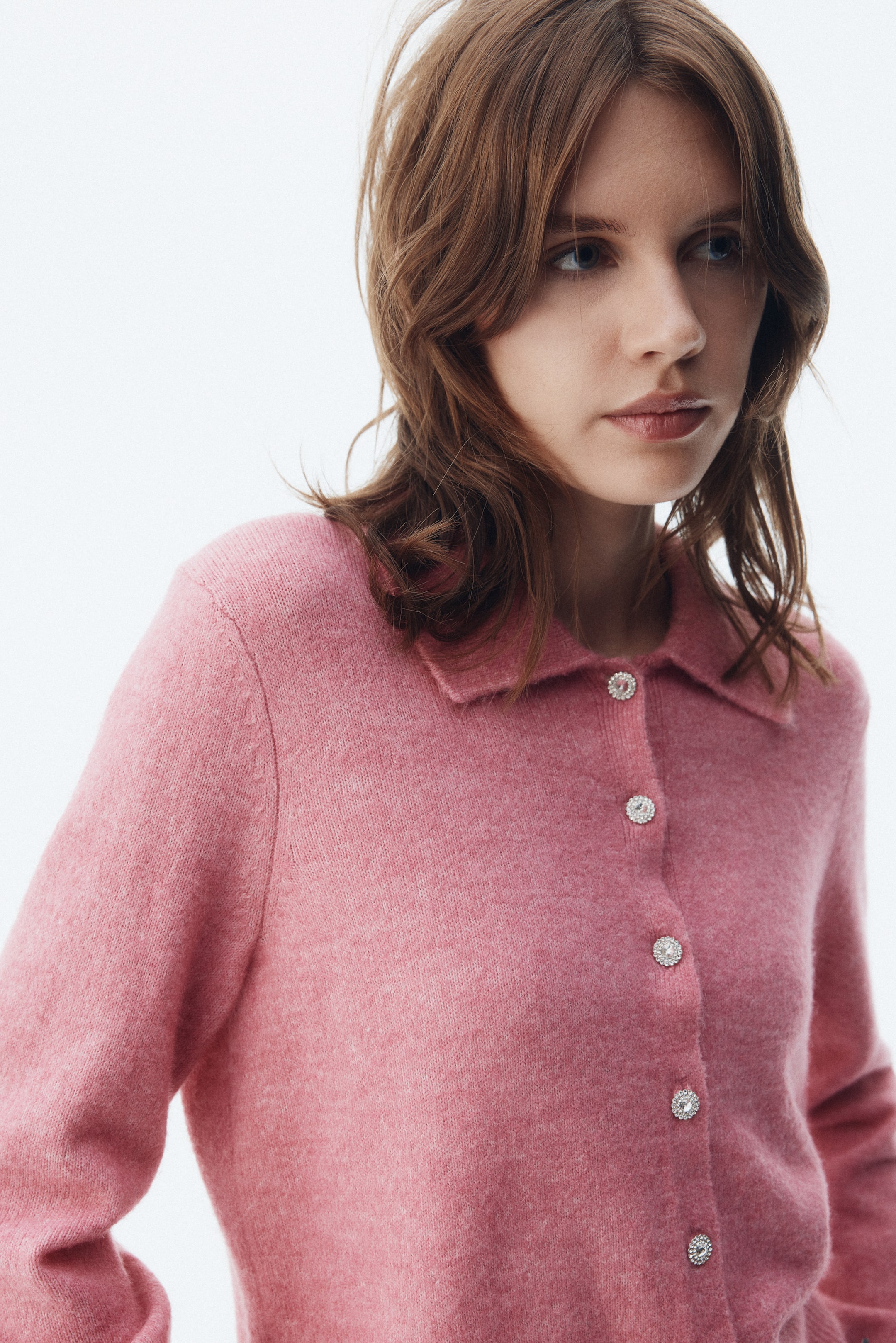 Cárdigan corto en tejido suave y fino. Modelo con cuello clásico y botones al frente. Borde acanalado en los puños y bastilla.