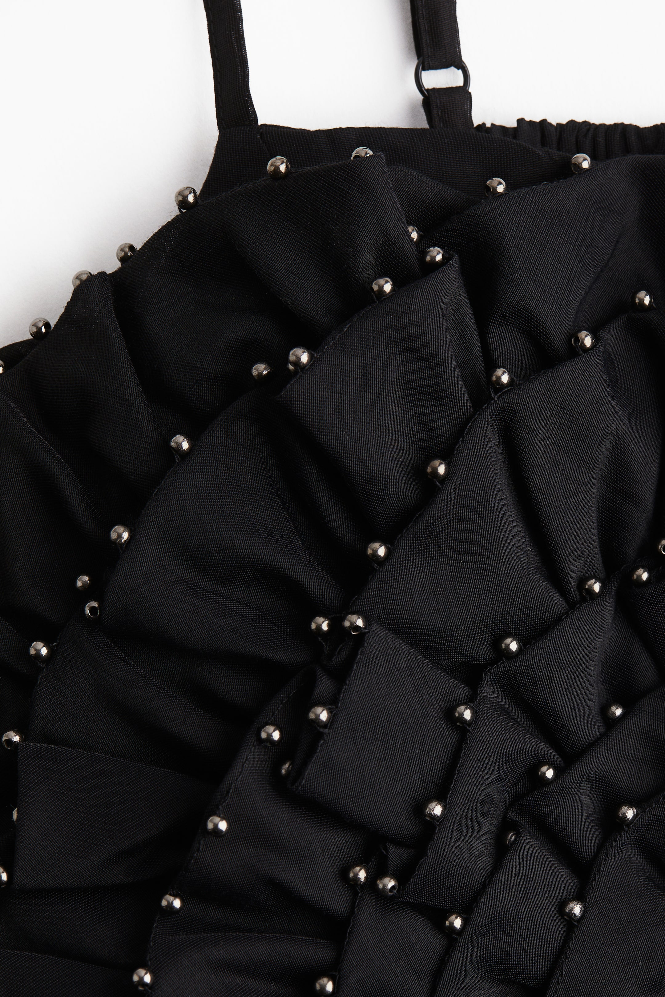 Top entallado en tela tejida. Modelo corto con escote recto y tirantes estrechos. Borde de olán ondulado con cuentas al frente que crea una apariencia de una flor grande. Punto smock en la espalda.