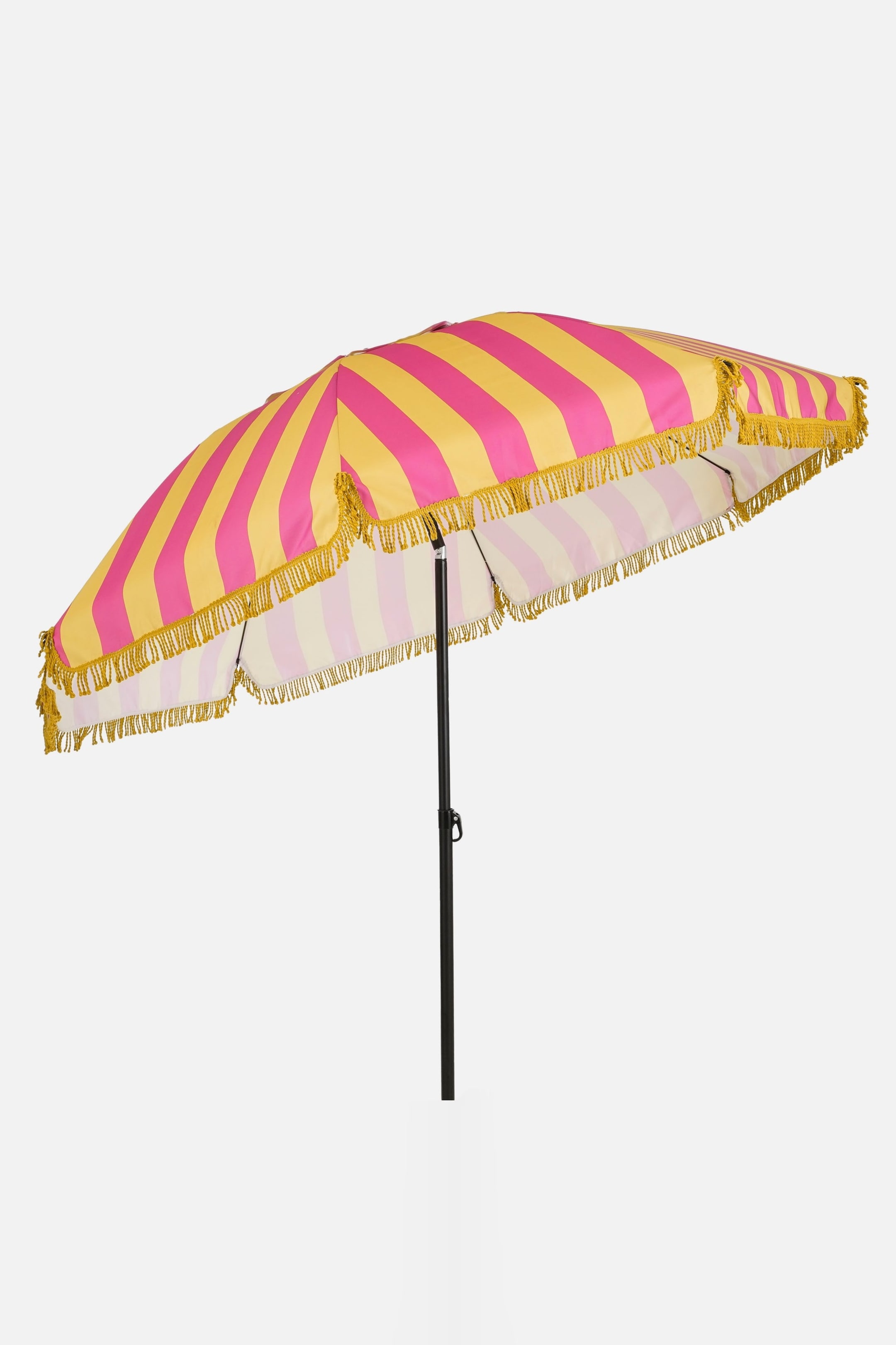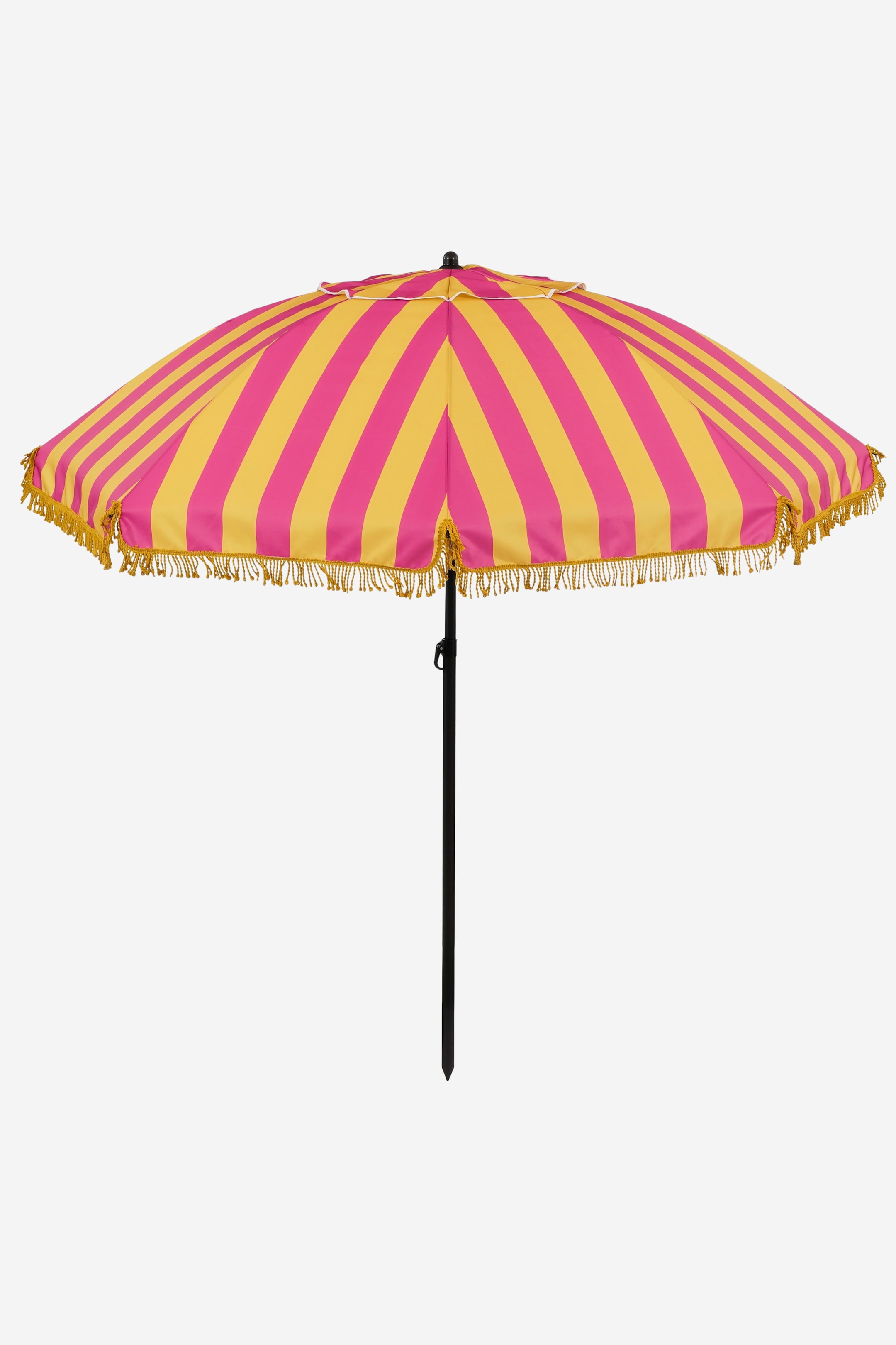 Suojaa itsesi auringolta tyylikkäästi tällä In The Mood Collectionin värikkäällä Osborn-päivänvarjolla. Keltaisten ja vaaleanpunaisten raitojen ansiosta olet silti aurinkoinen myös varjossa! Iloinen päivänvarjo hapsuilla on valmistettu korkealaatuisesta polyesterikankaasta. Kankaan UPF-arvo on 30+ ja se voi estää 96,7% UVA- ja UVB-säteilystä. Lisäksi se tulee kätevässä pussissa, jossa on kahvat. Kallistuva aurinkovarjo on 238 cm korkea ja halkaisijaltaan 220 cm. Täydellinen puutarhaan, terassille tai parvekkeelle! Mukava myös suurena rantasateenvarjona tai yhdistettynä useisiin In The Mood Collectionin värillisiin esineisiin täysin tunnelmallisen ilmeen saamiseksi. Mihin laitat tämän värillisen päivänvarjon?