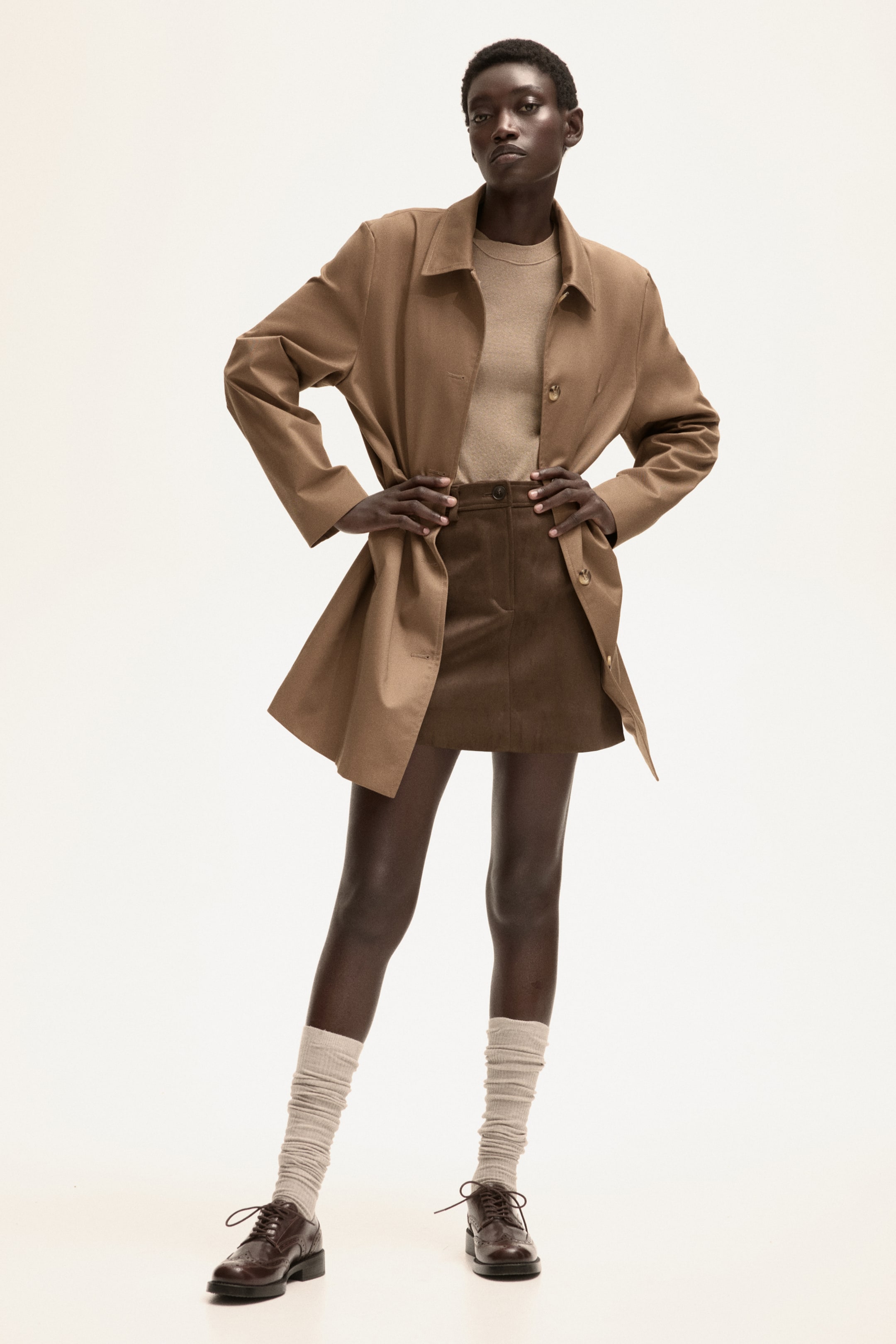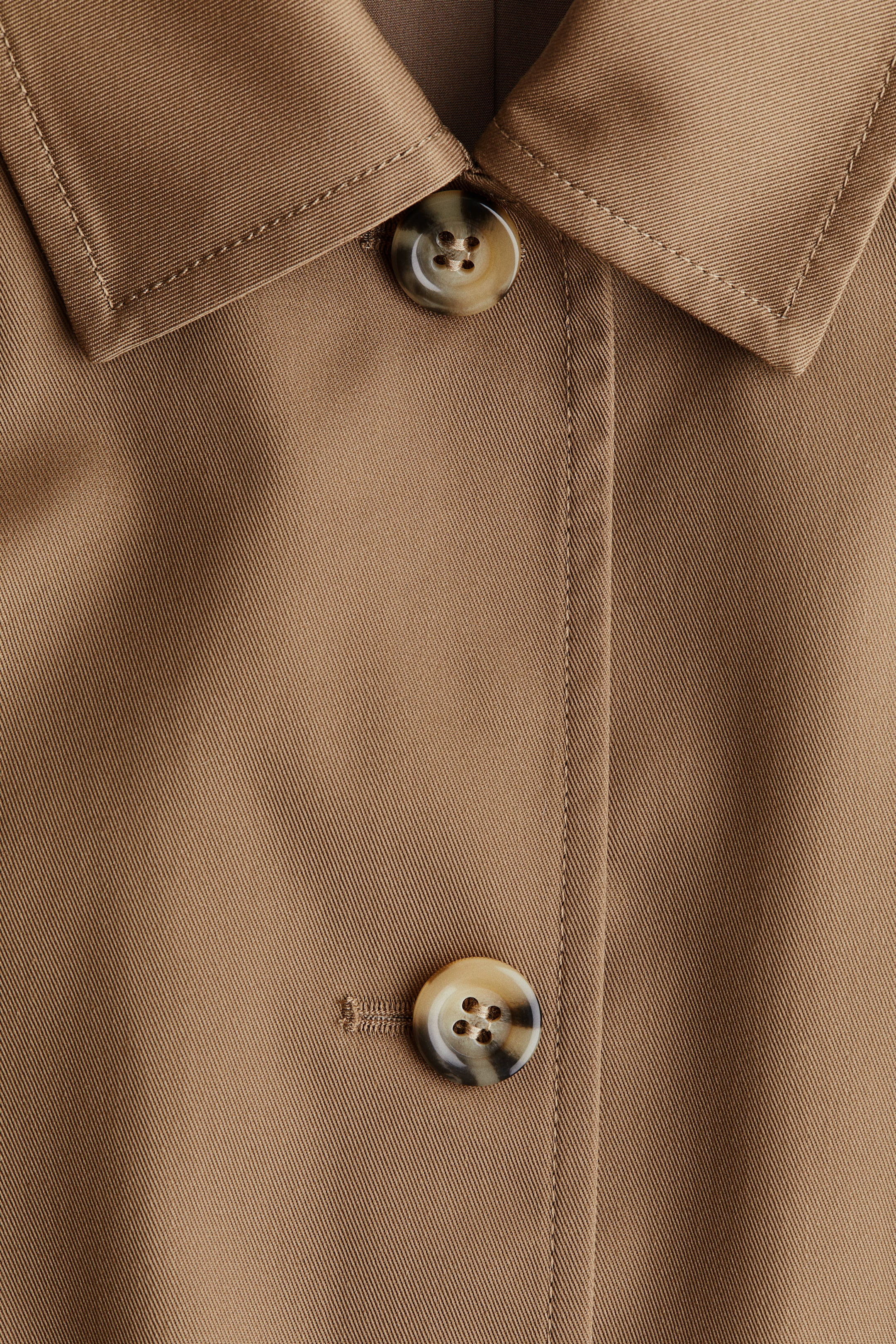Vuorillinen car coat -tvillitakki, jossa kaulus, napitus etupuolella ja teremalliset sivutaskut.